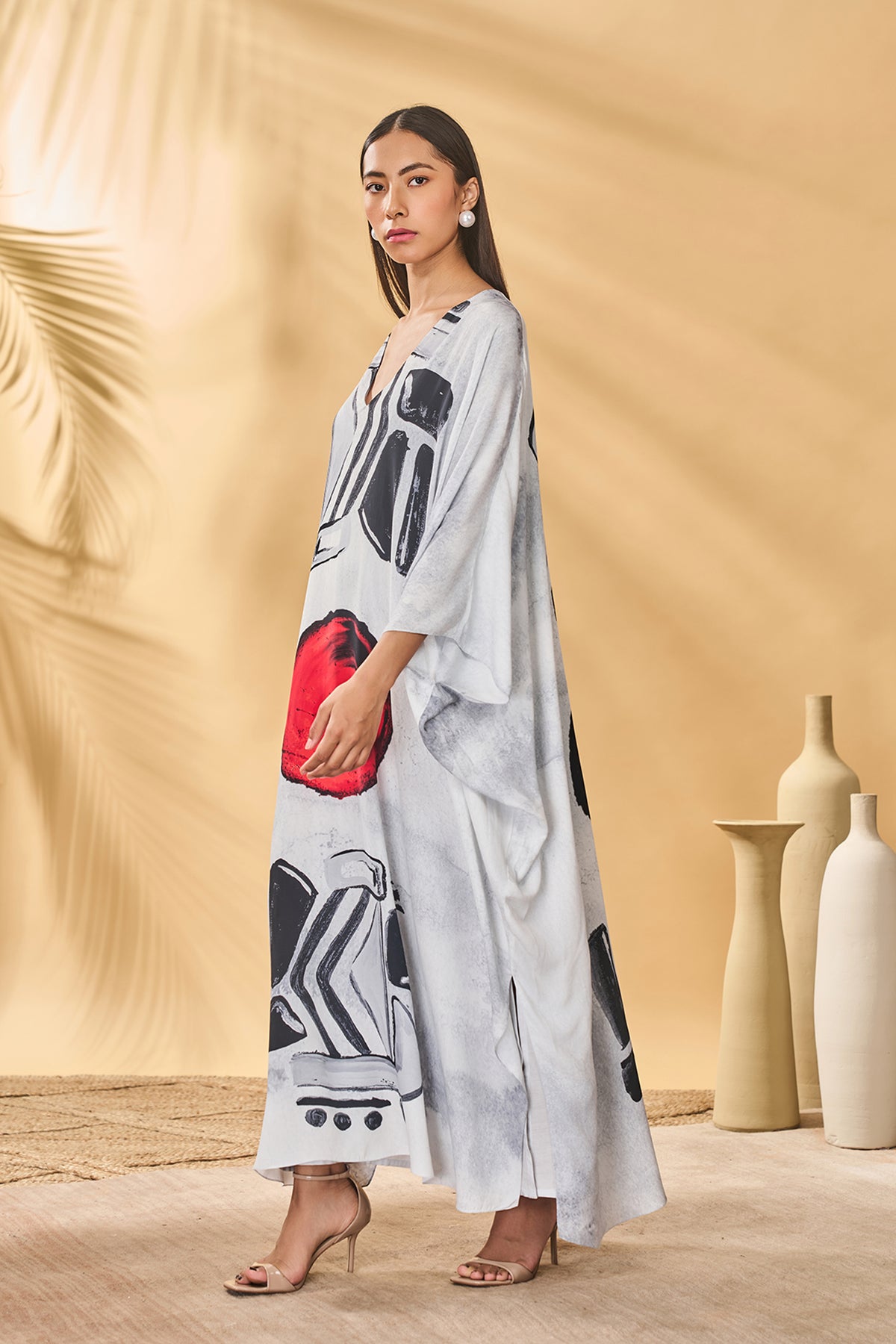 Maxi length | v-neck | side slits | white noise placement on front and back