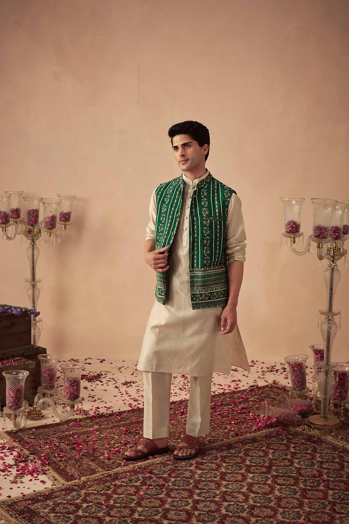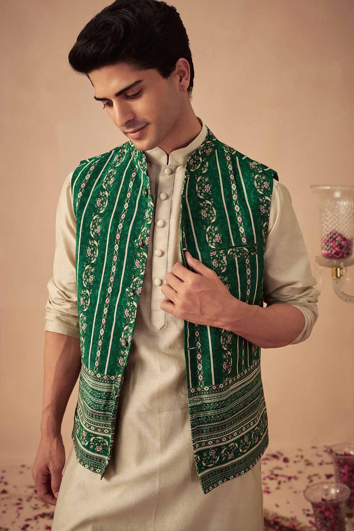 Featuring a green printed bundi paired with a beige kurta and pants.