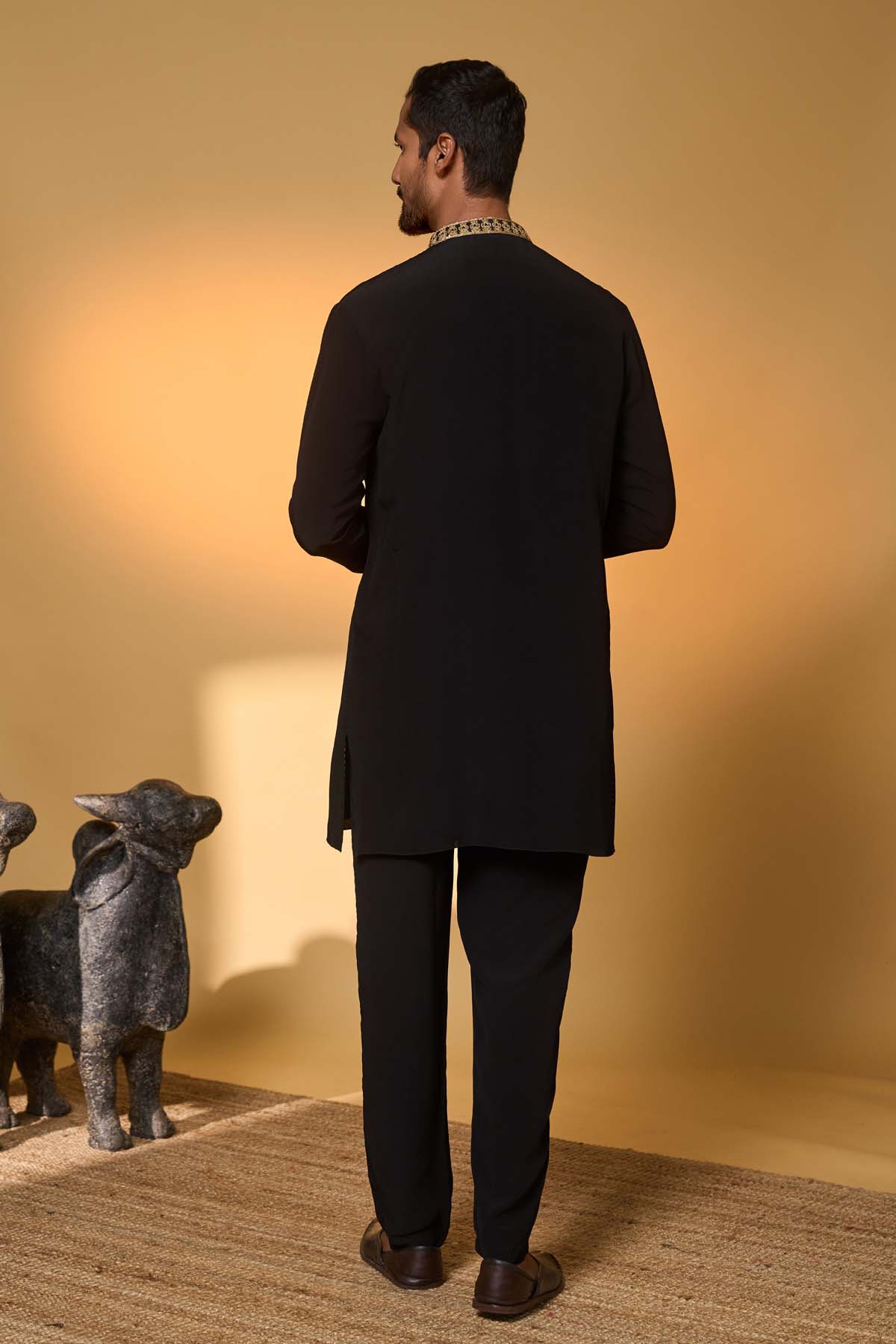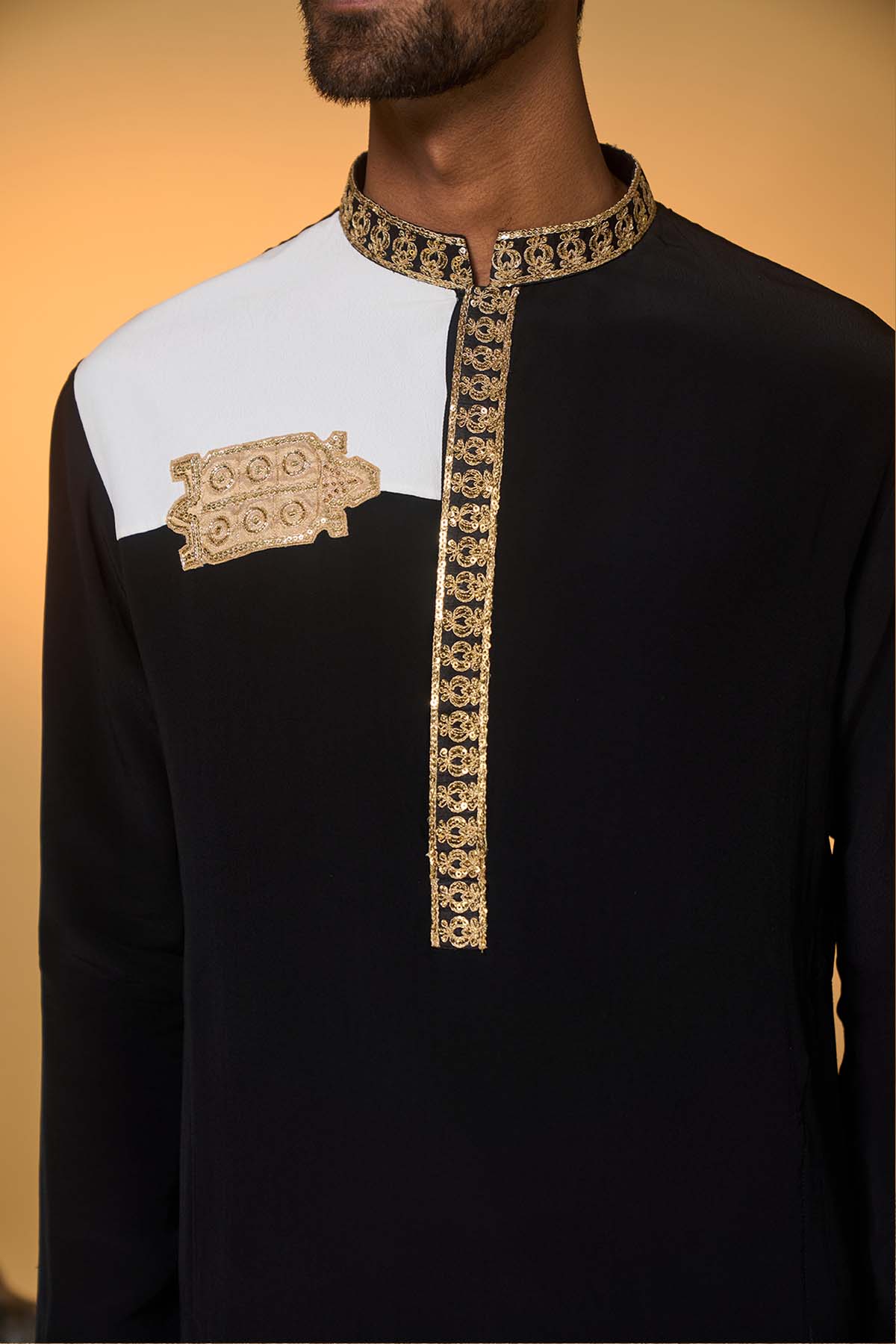 Kurta – black and white colour combination | features a turtle tale tissue appliqué with embroidery on the kurta | full sleeves |mandarin collar |concealed placket with gold embroidery pant- straight pants with pocket