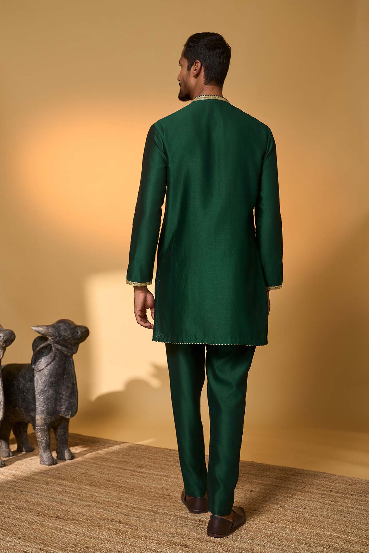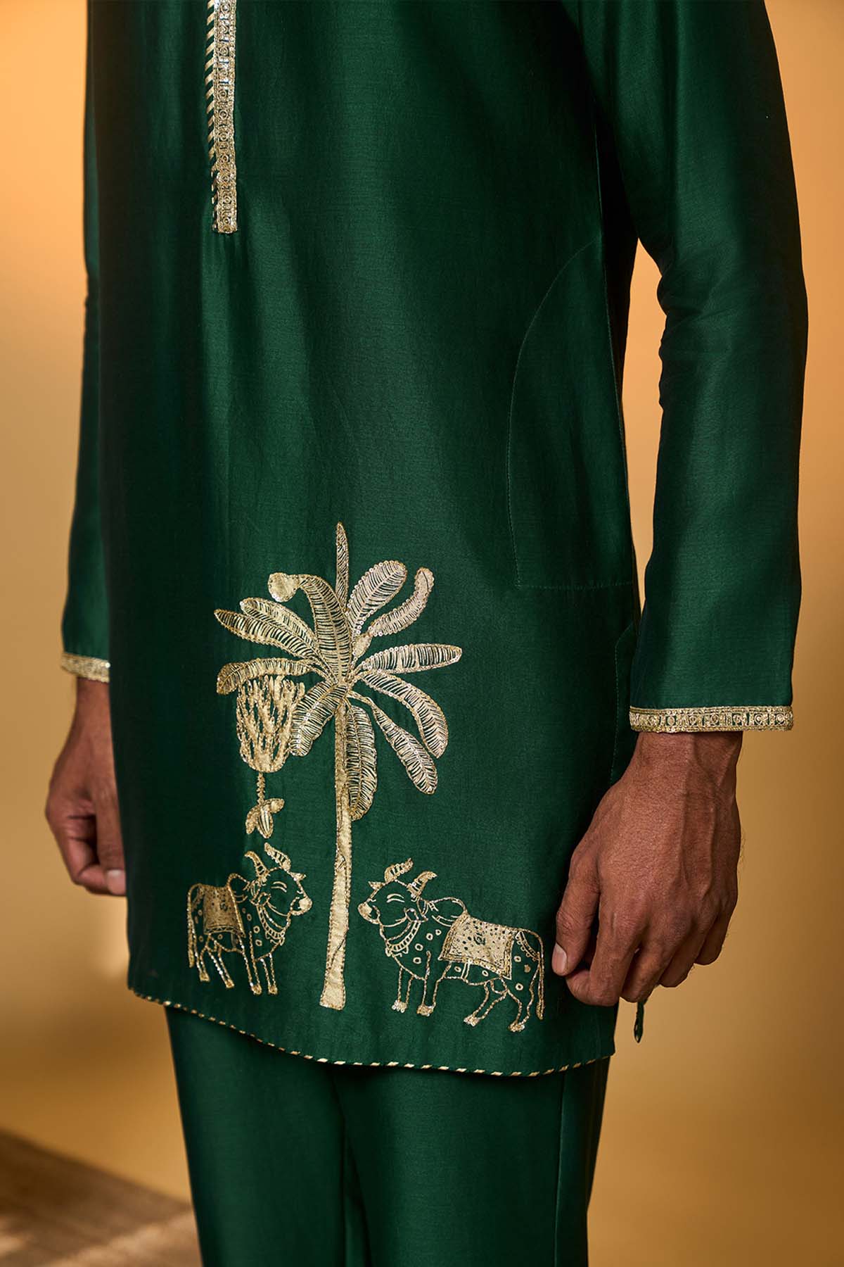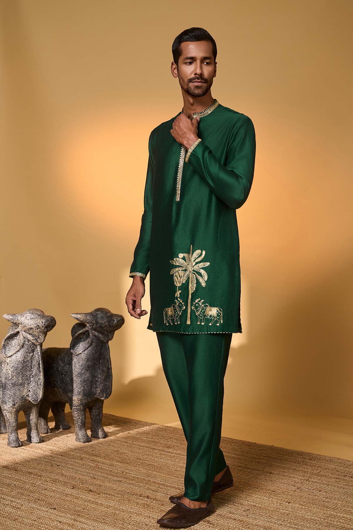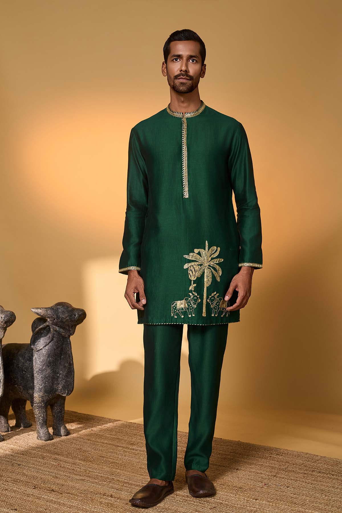 Kurta – has a tropical nandi embellished print |full sleeves | mandarin collar | pocket detail | concealed placket with gold embroidery pant- straight pants with pocket