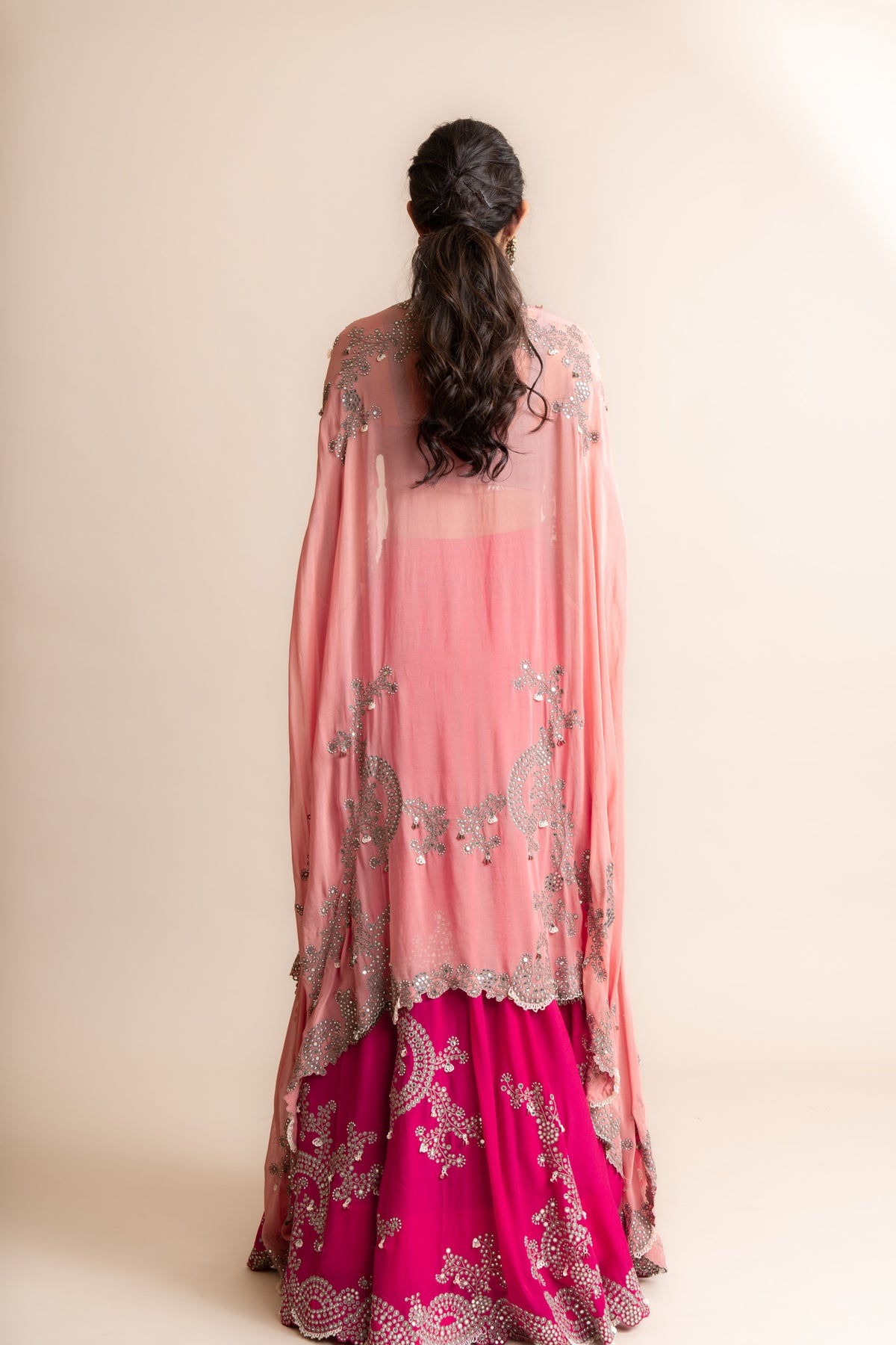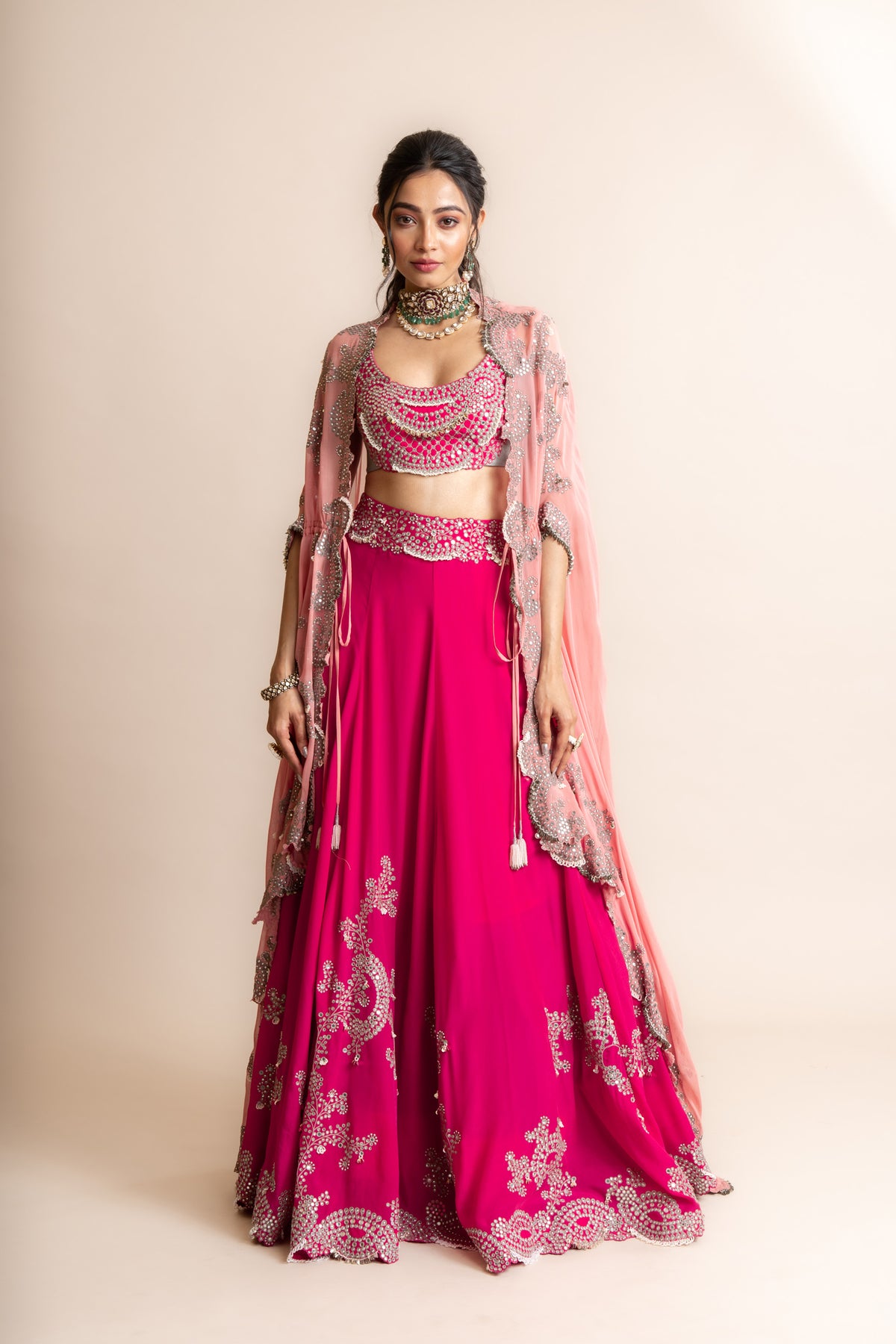 Fuchsia hand embroidered lehenga and yoke blouse with dusty-rose dupatta cape