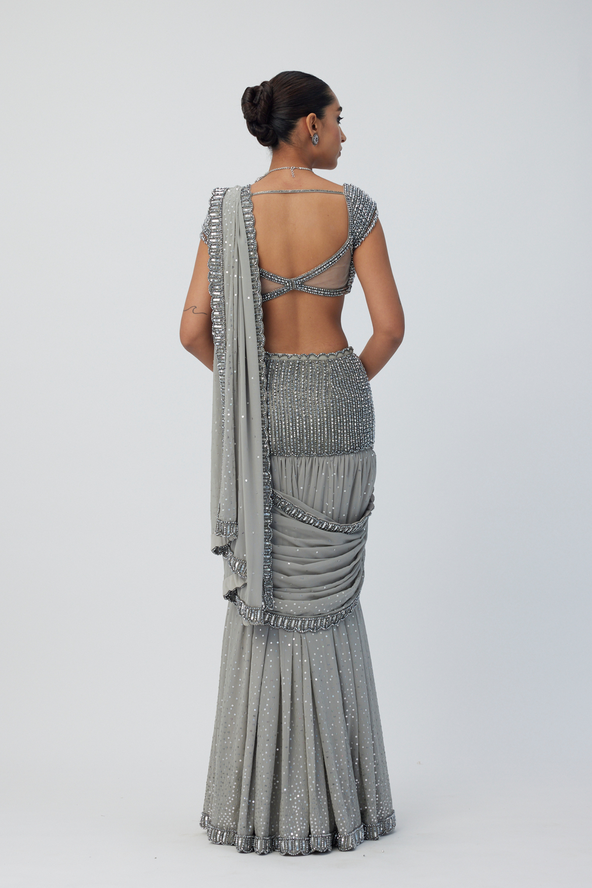 Intricately Hand Embroidered Pre Draped Georgette Saree featuring sequins and crystal embroidery clubbed With Sleeveless Jewelled blouse with crystal embellishments.