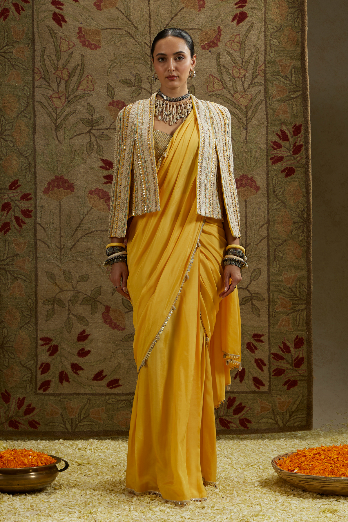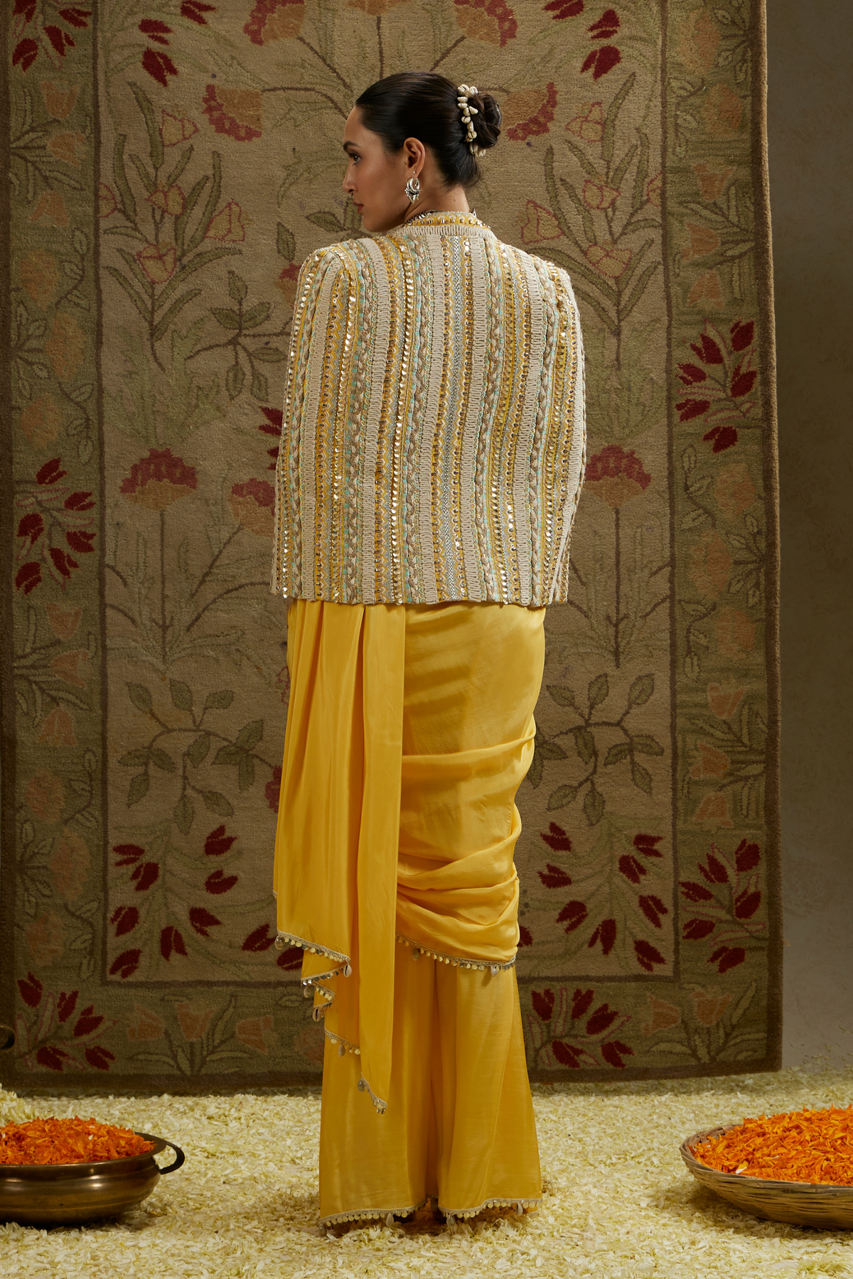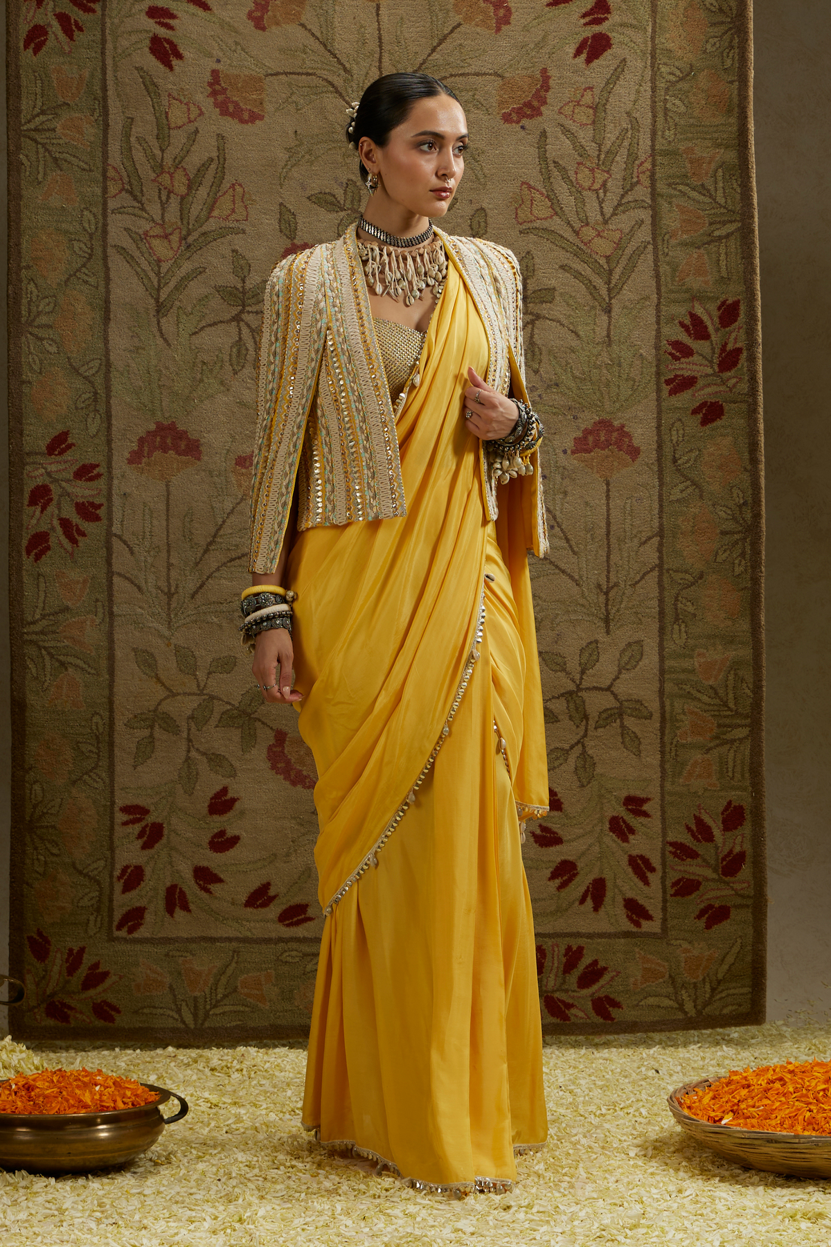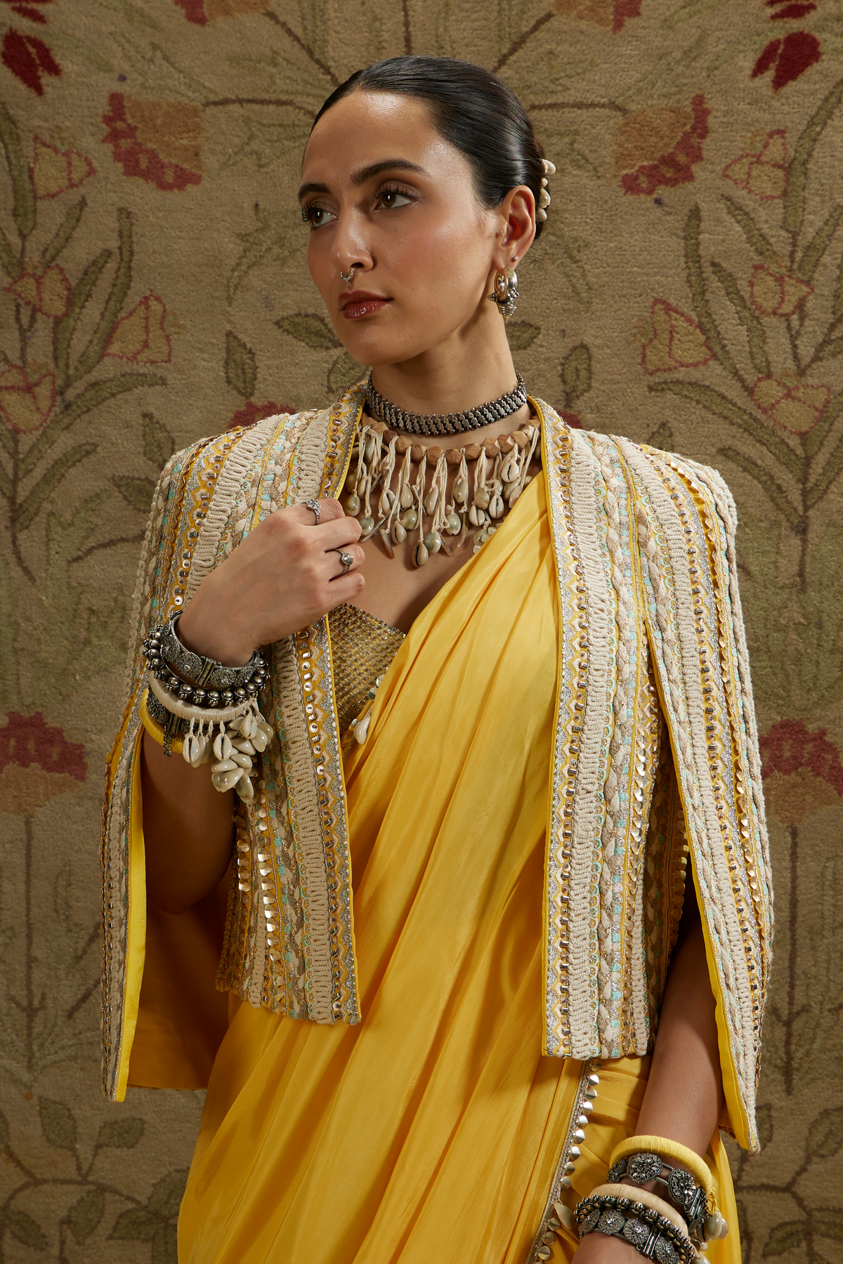 Dandelion Yellow Cascade Saree Paired with Metal Embellished Bustier and Embellished Cape Jacket