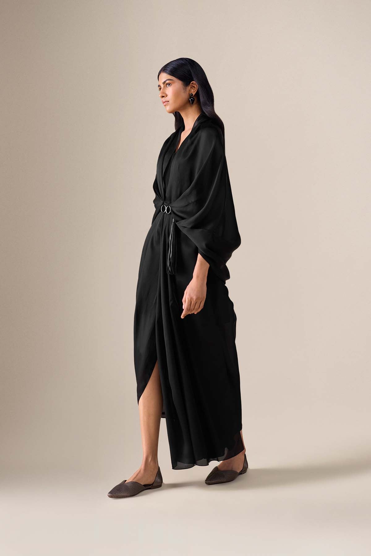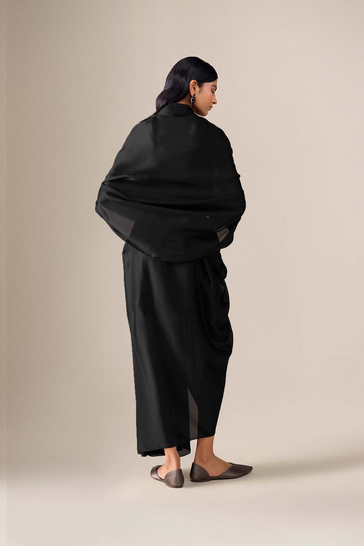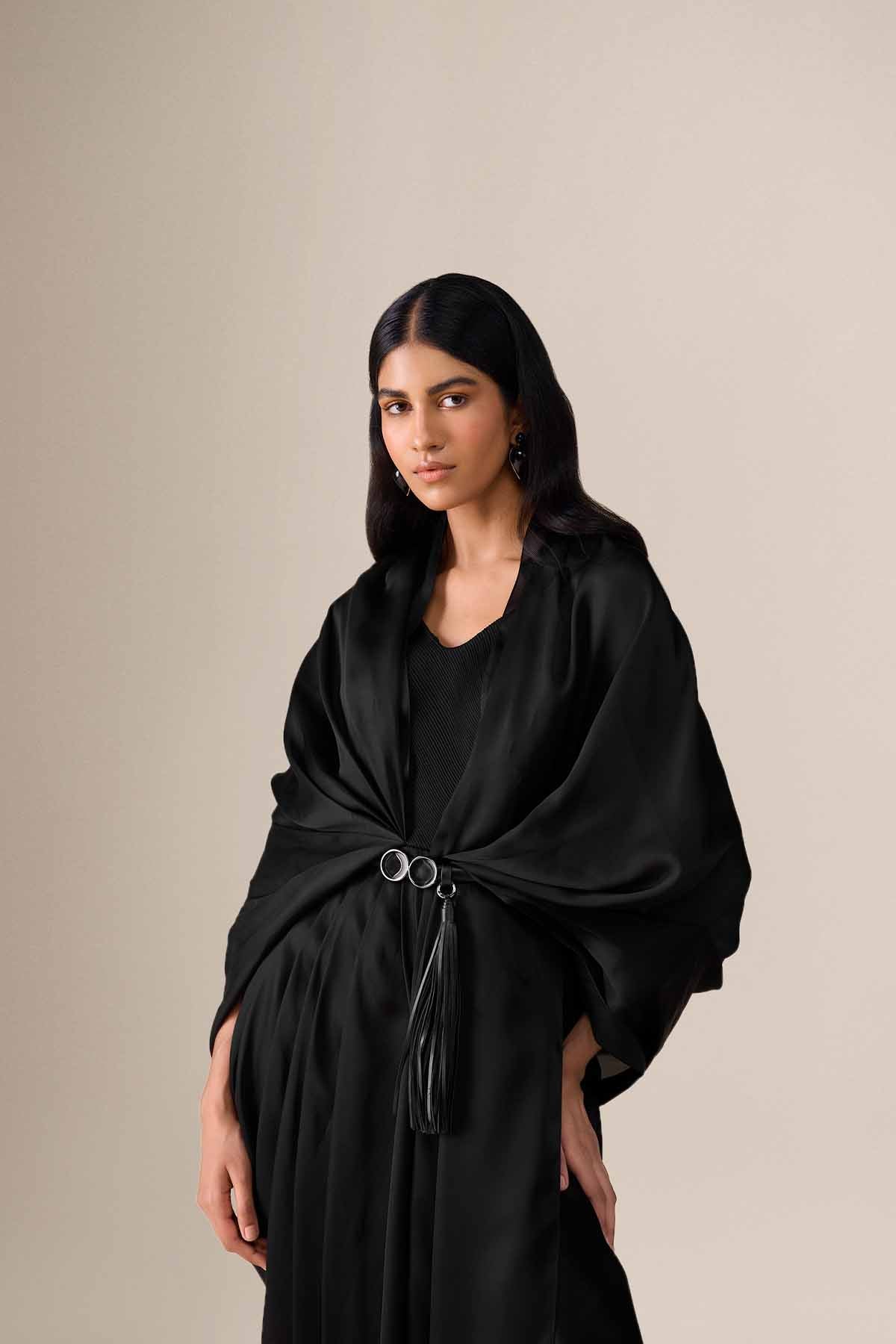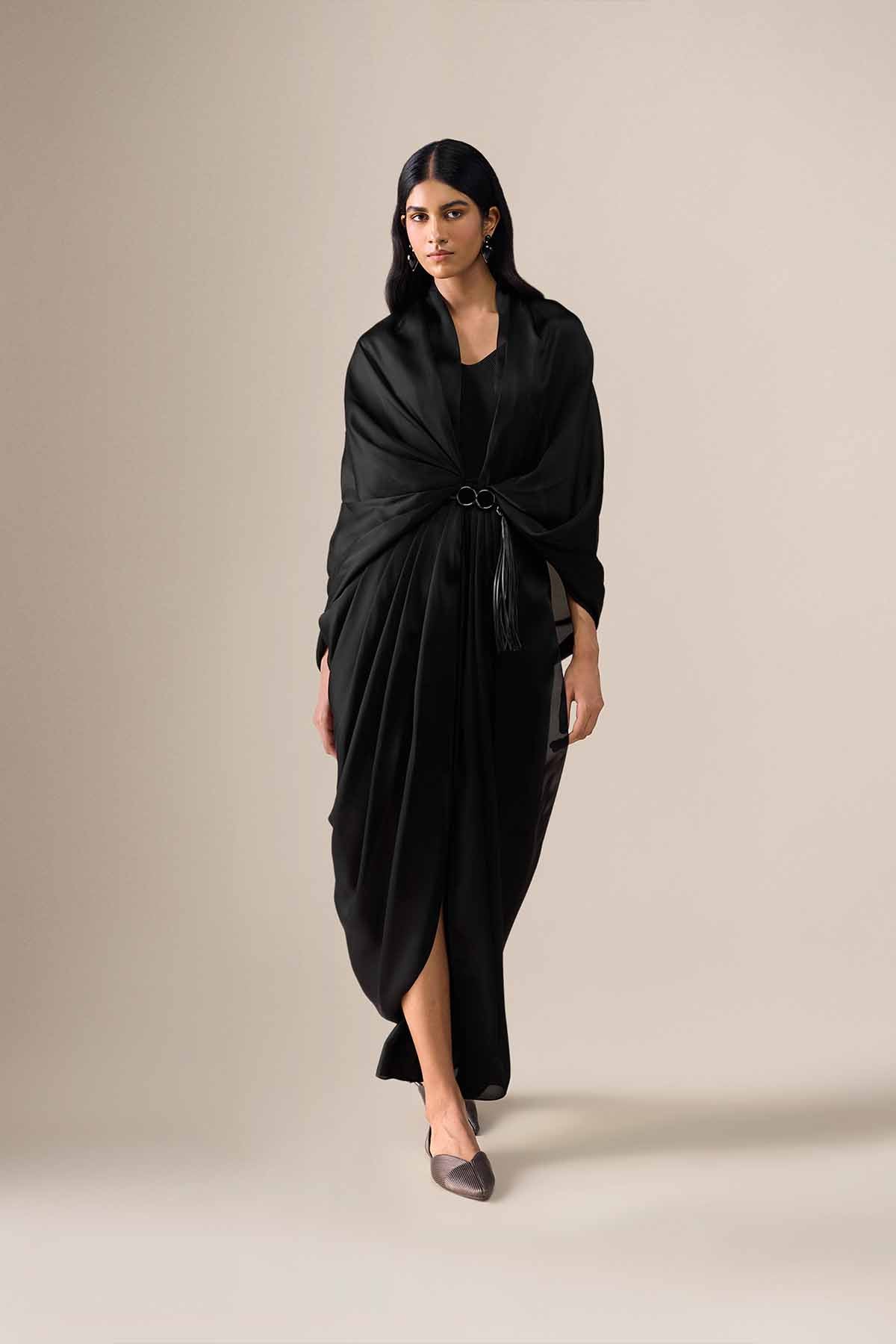 The ekiya saree is timeless elegance, reimagined. Pre-stitched in black satin organza, its pleats fall with quiet precision, giving structure to an otherwise fluid form. The pallu drapes softly around the shoulders, gathered at the centre with a sleek faux leather belt — complete with an enamel buckle and tassels that add just the right touch of detail.