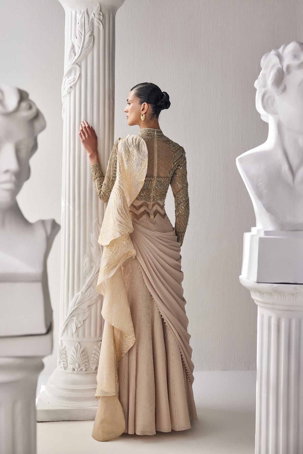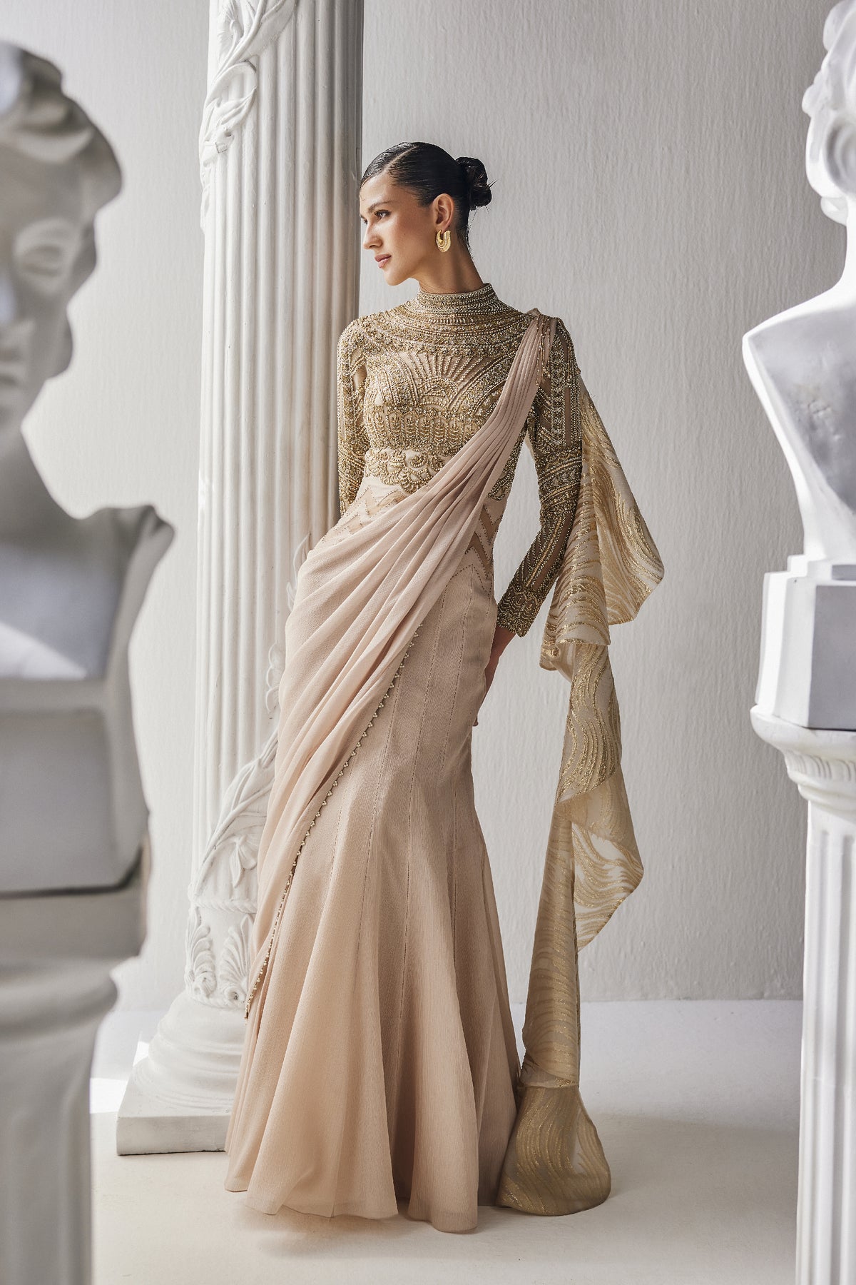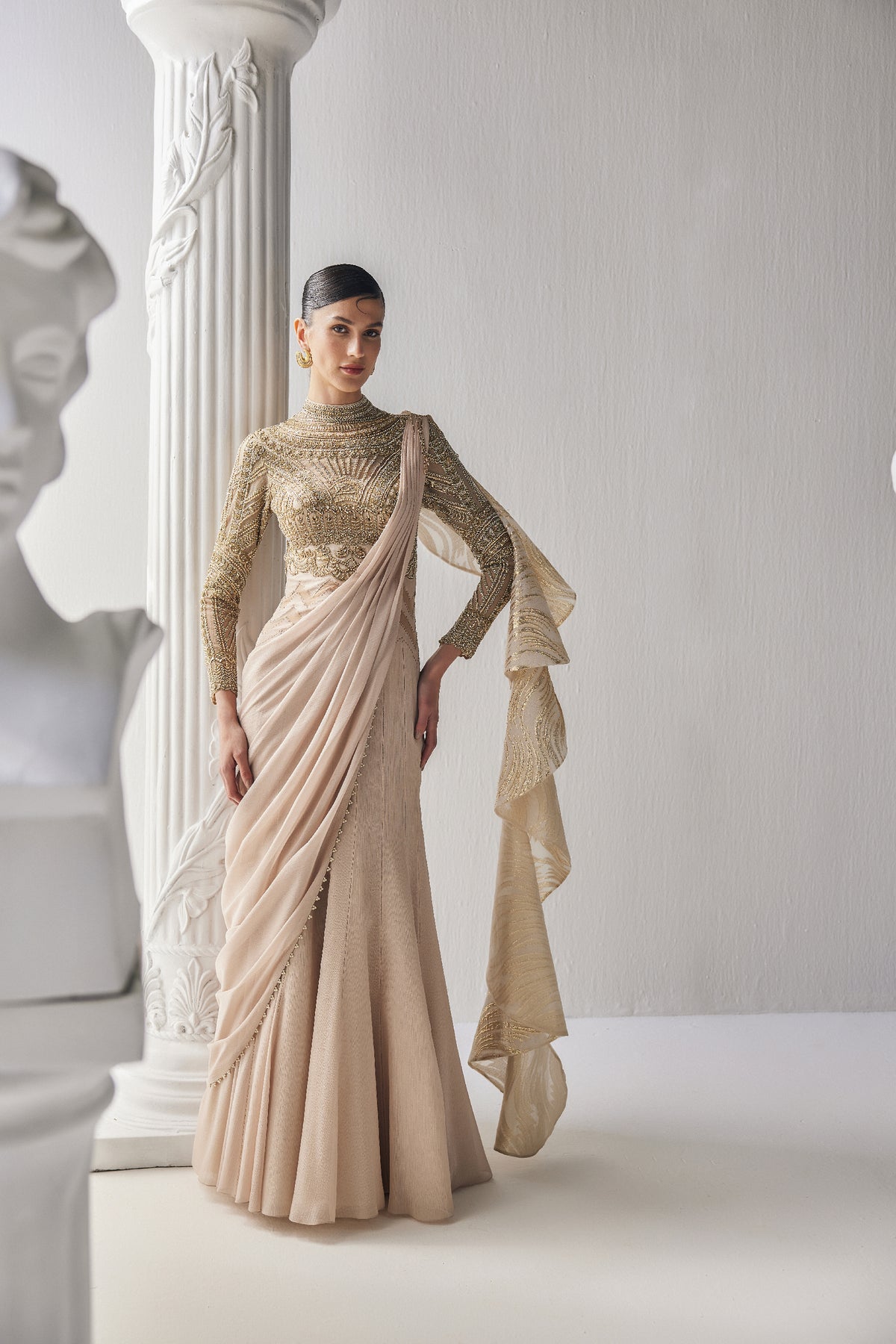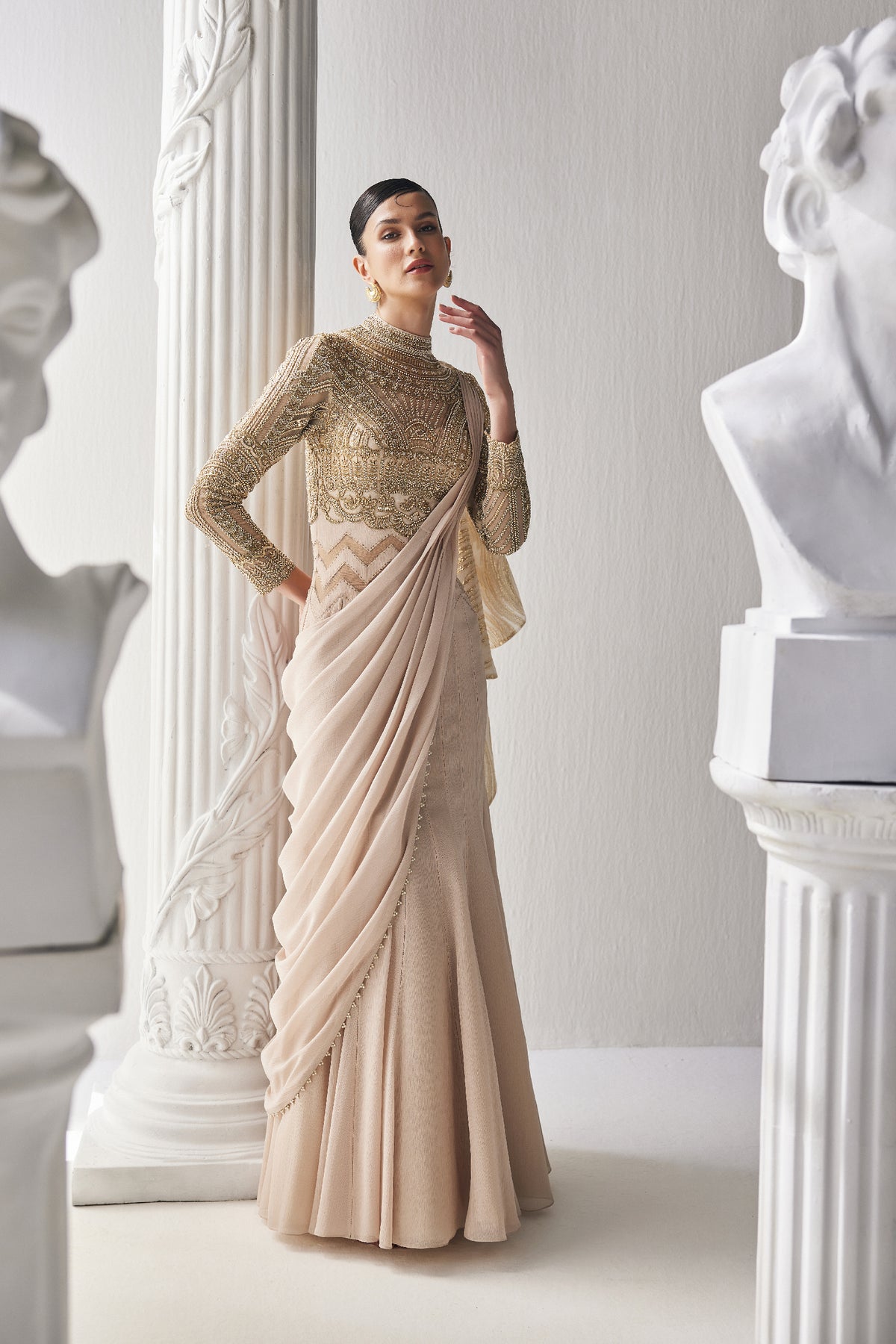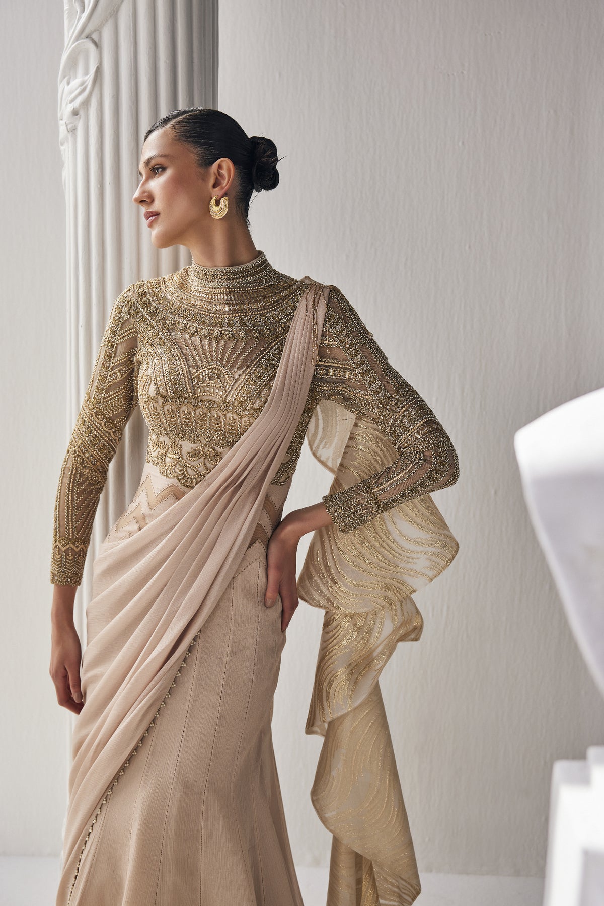 This beautiful golden cream saree made of shiny chiffon fabric. It is paired with a fancy blouse that has intricate zardozi work with a high neckline. The outfit is perfect for special occasions where you want to look elegant and stylish.