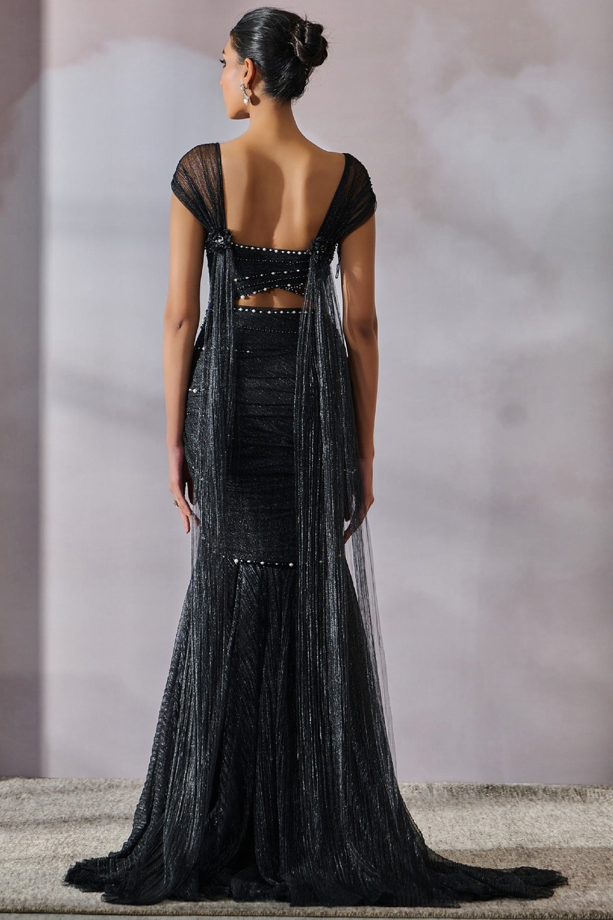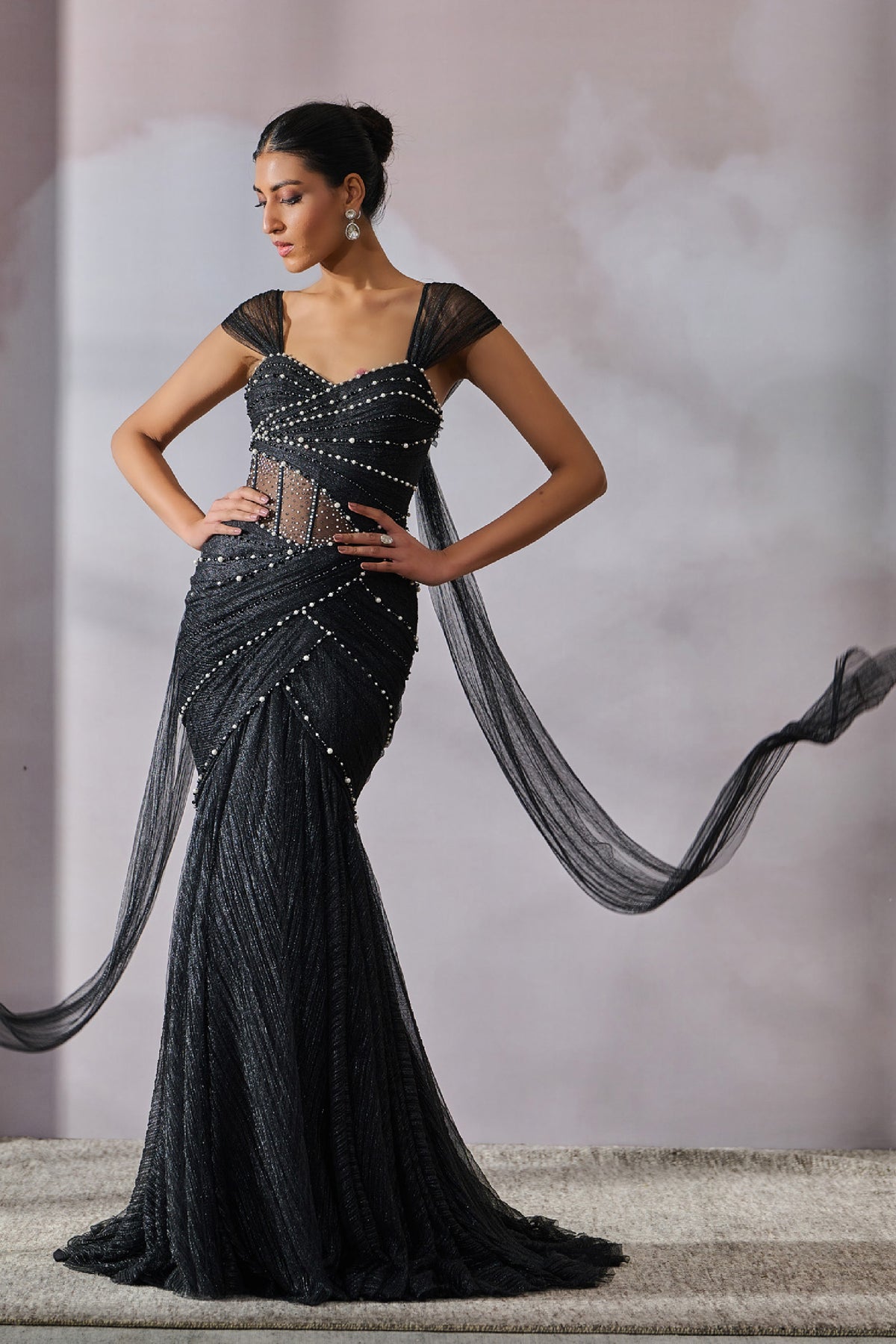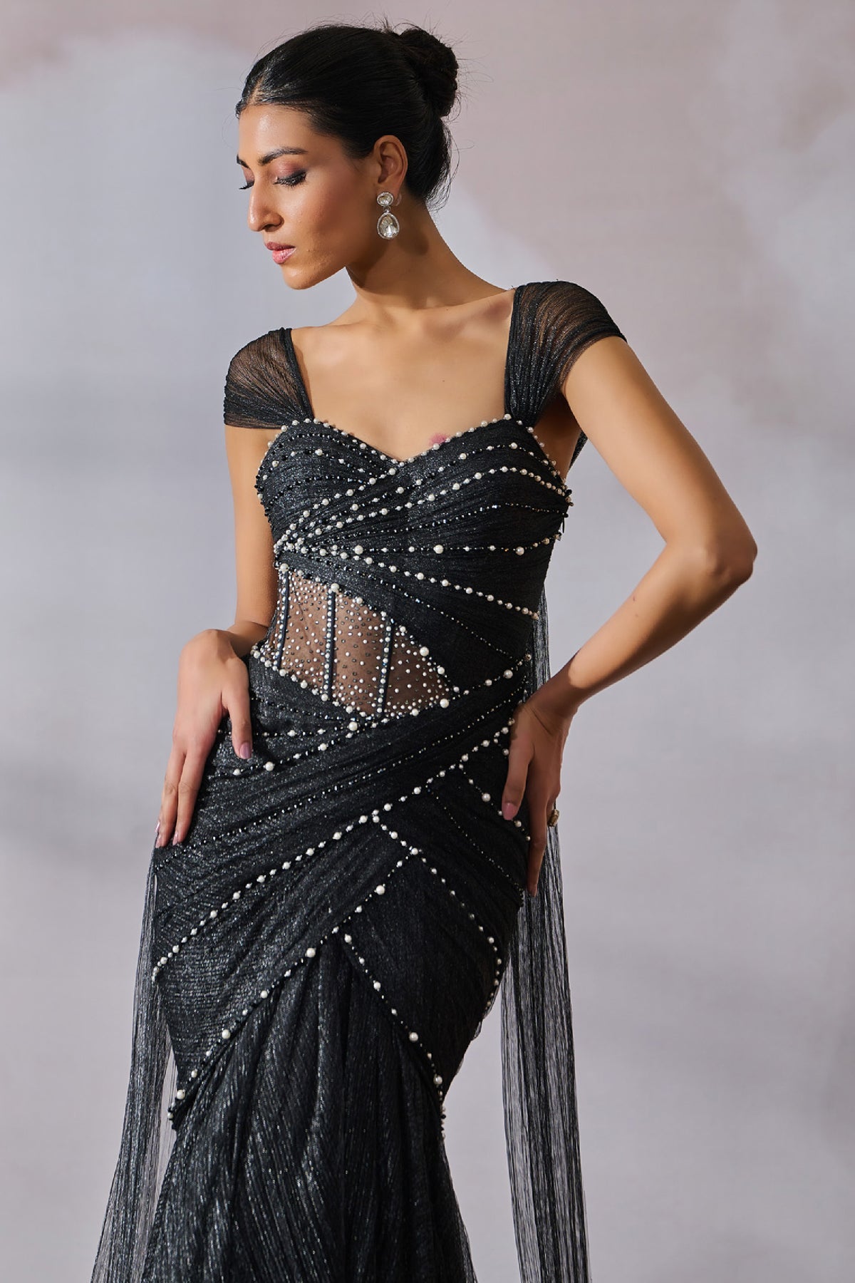 Classic fluted gown with a corseted bodice featuring crystal and pearl