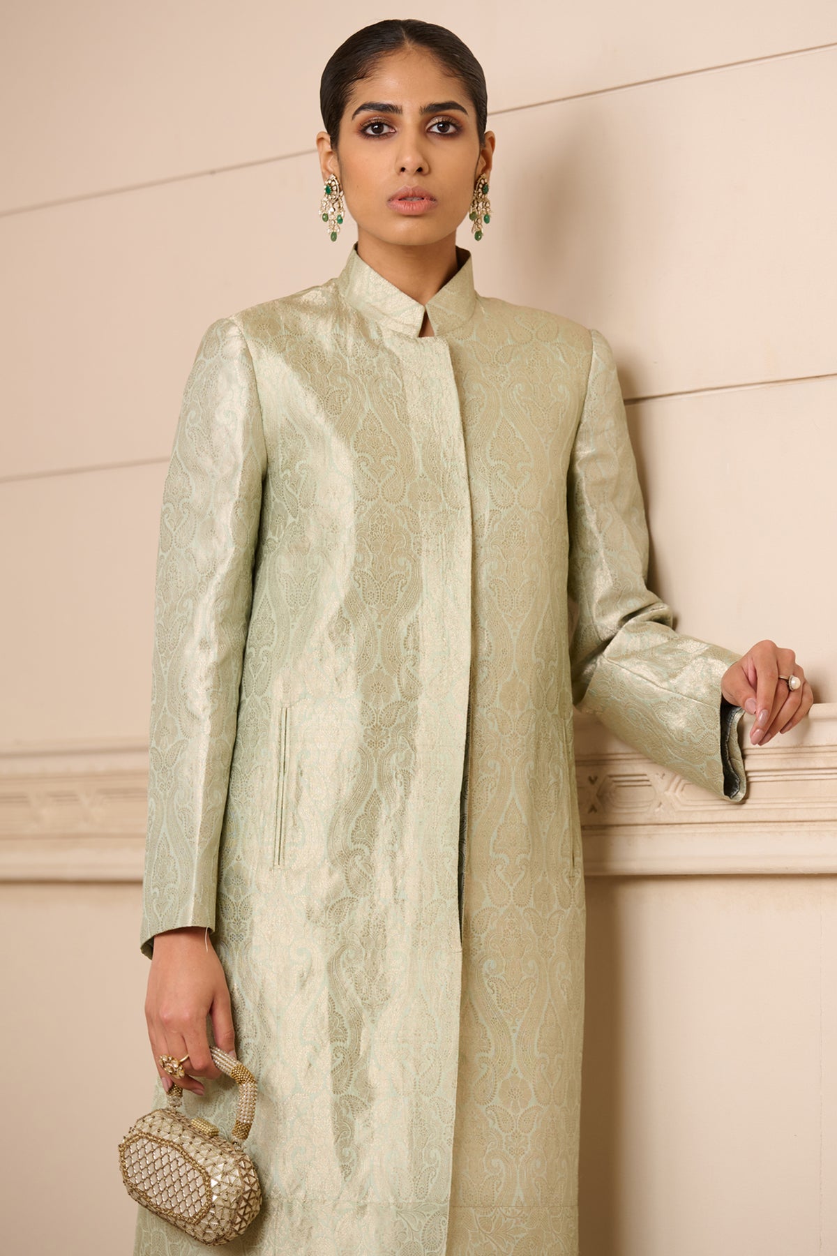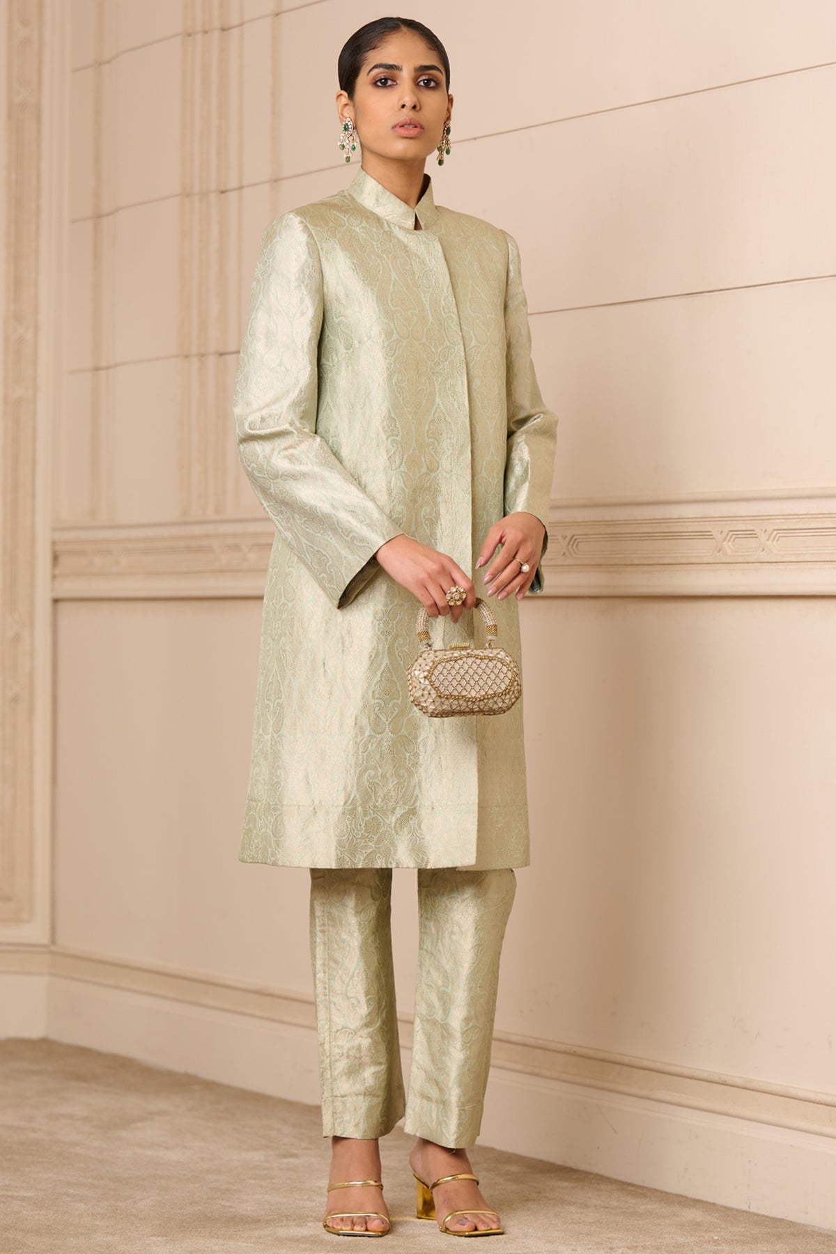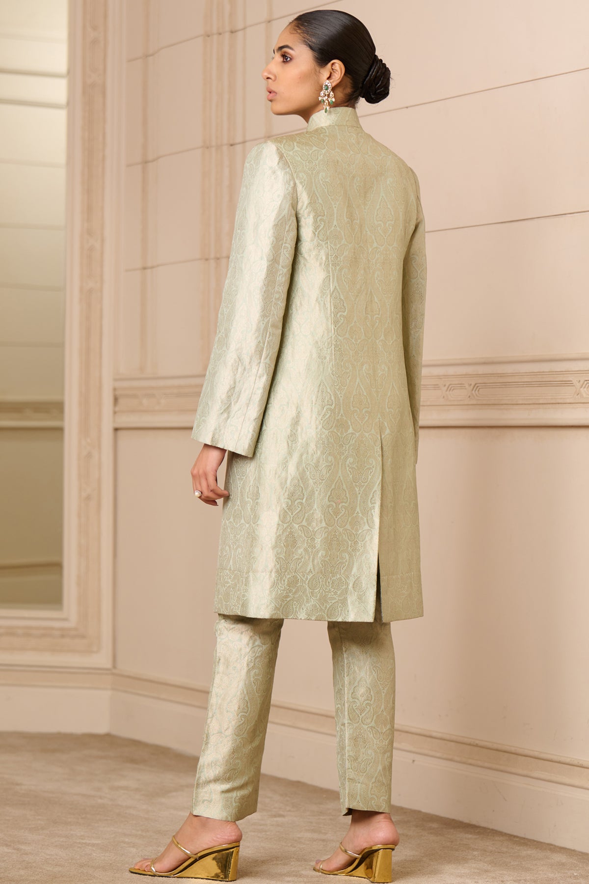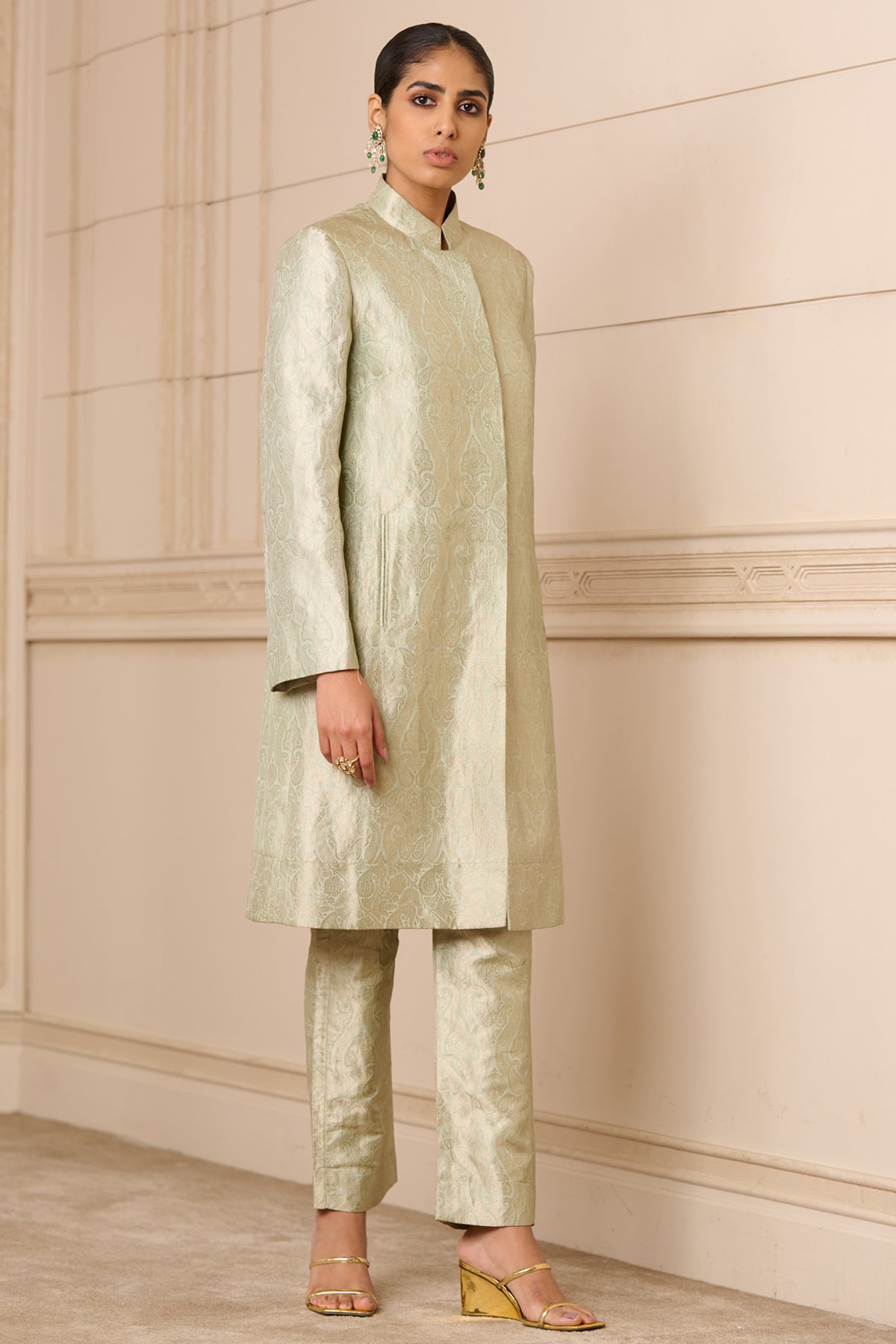 Our handwoven brocade bandhgala jacket is paired with matching brocade trousers.