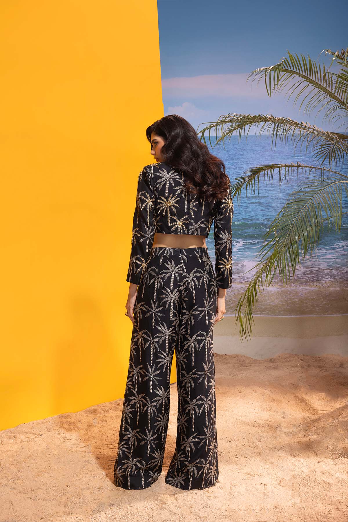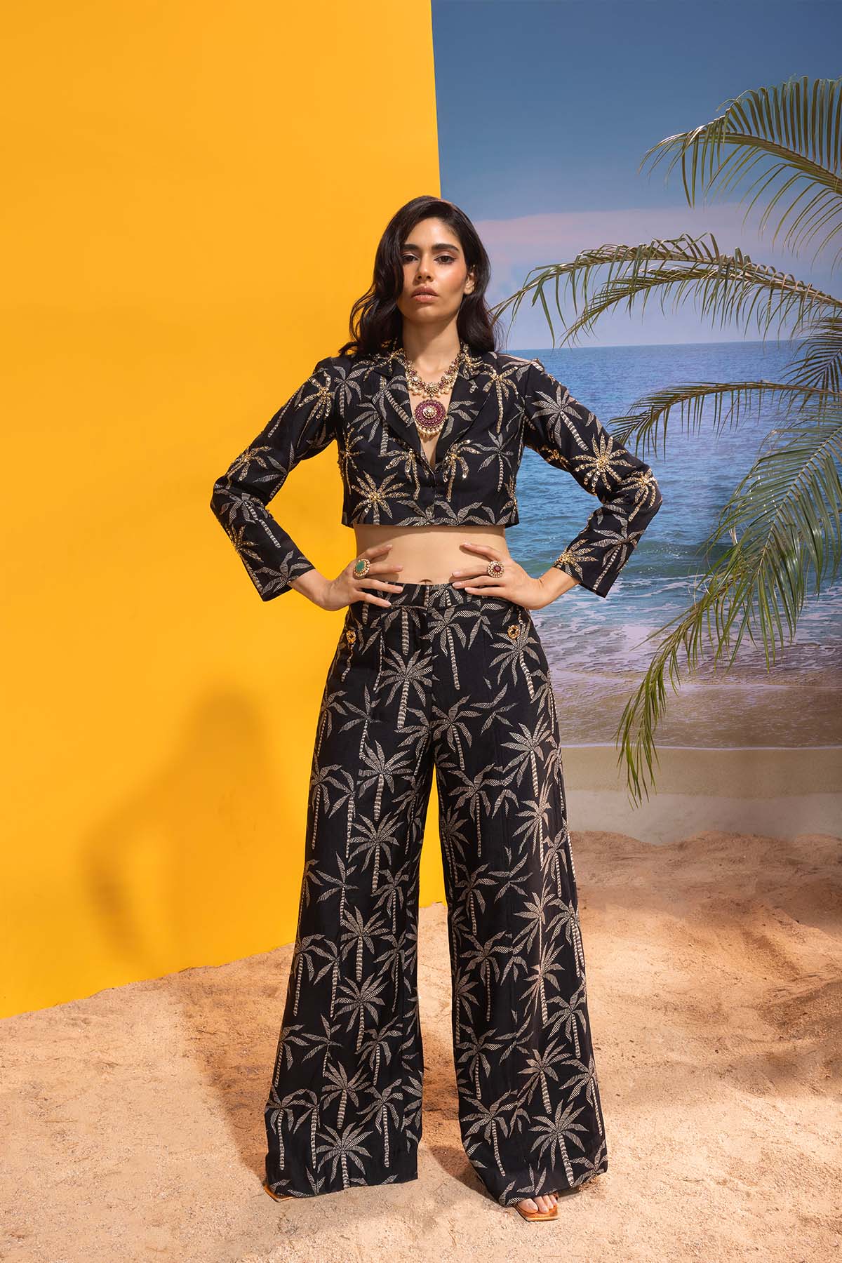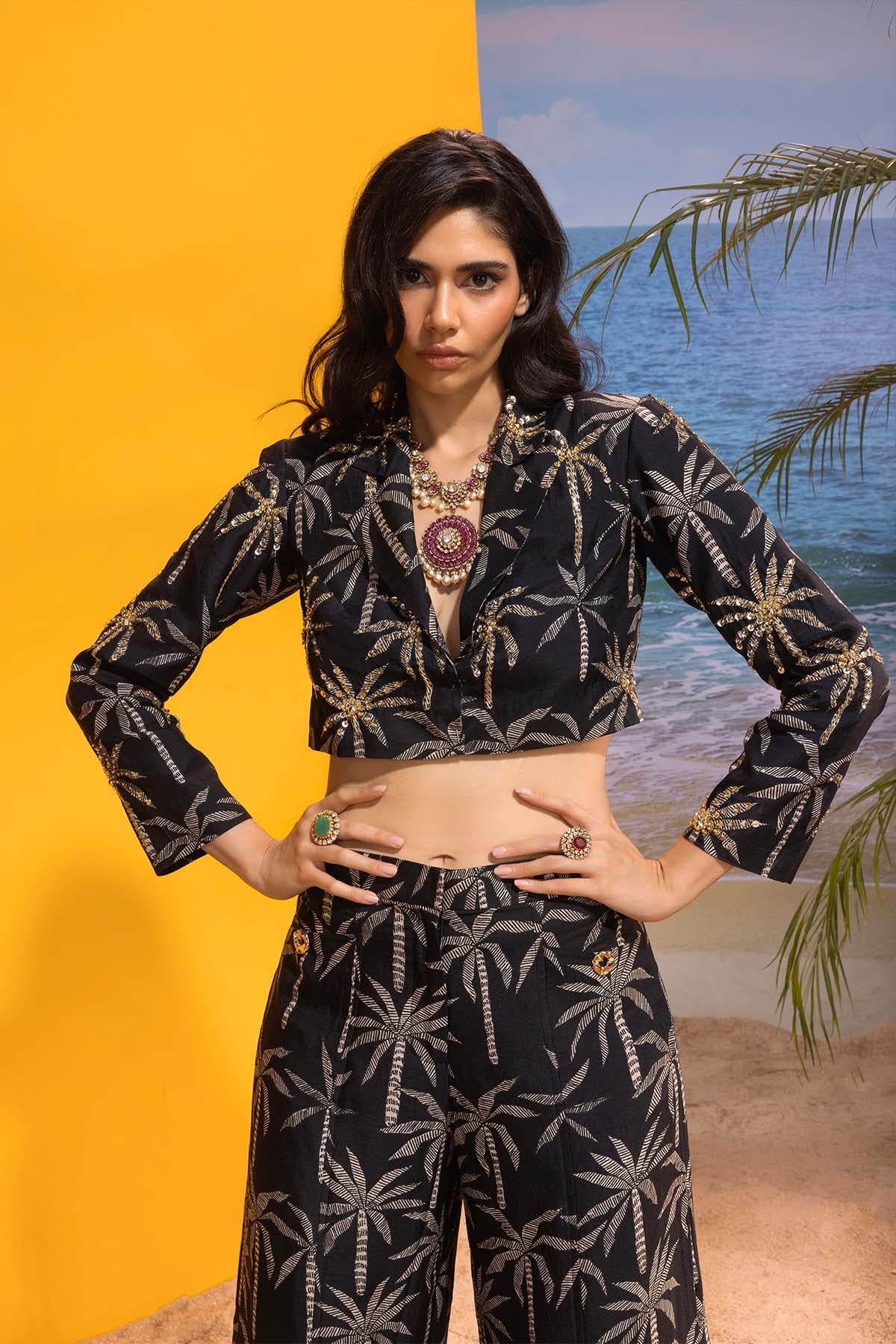 Le palm embellished black blazer set