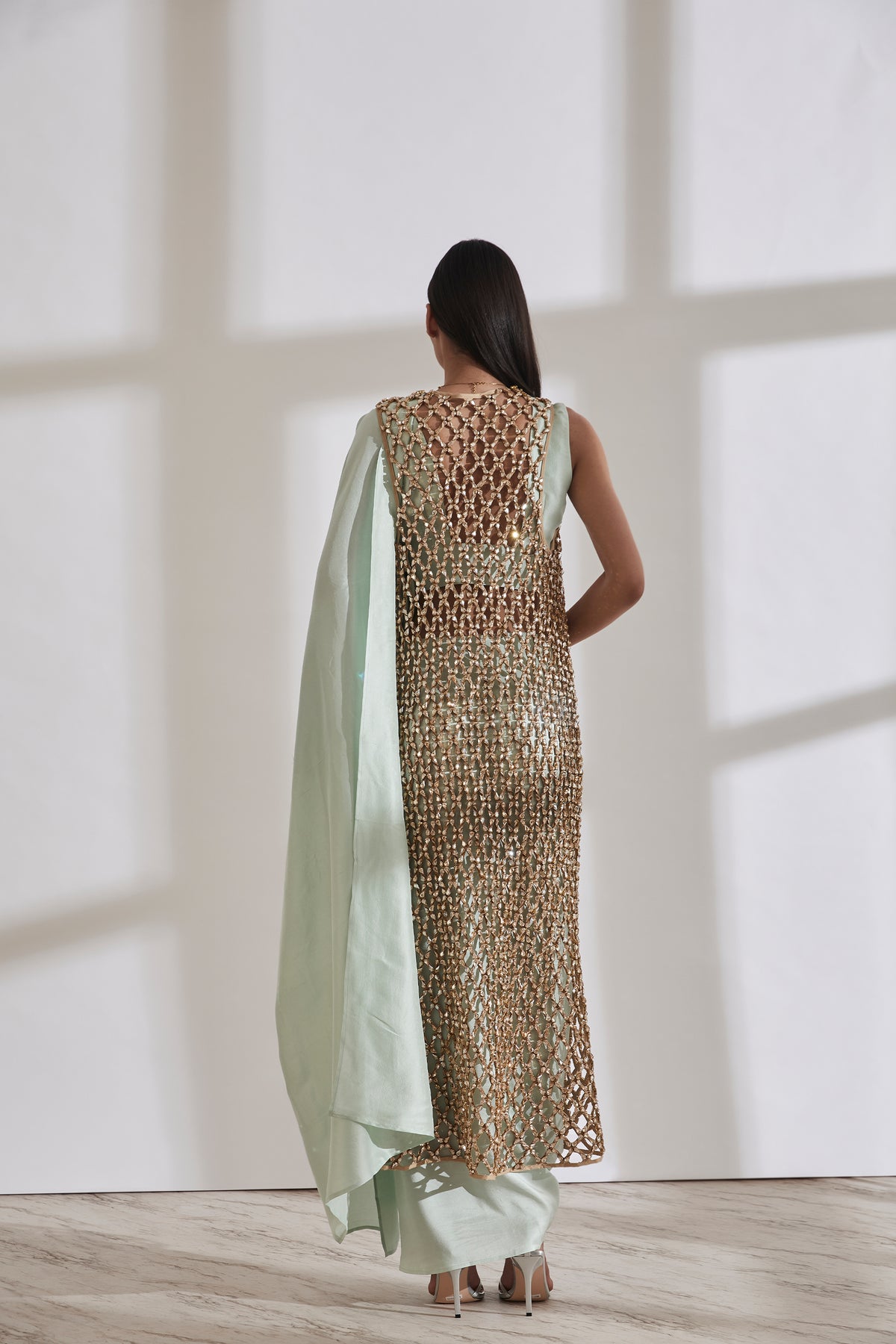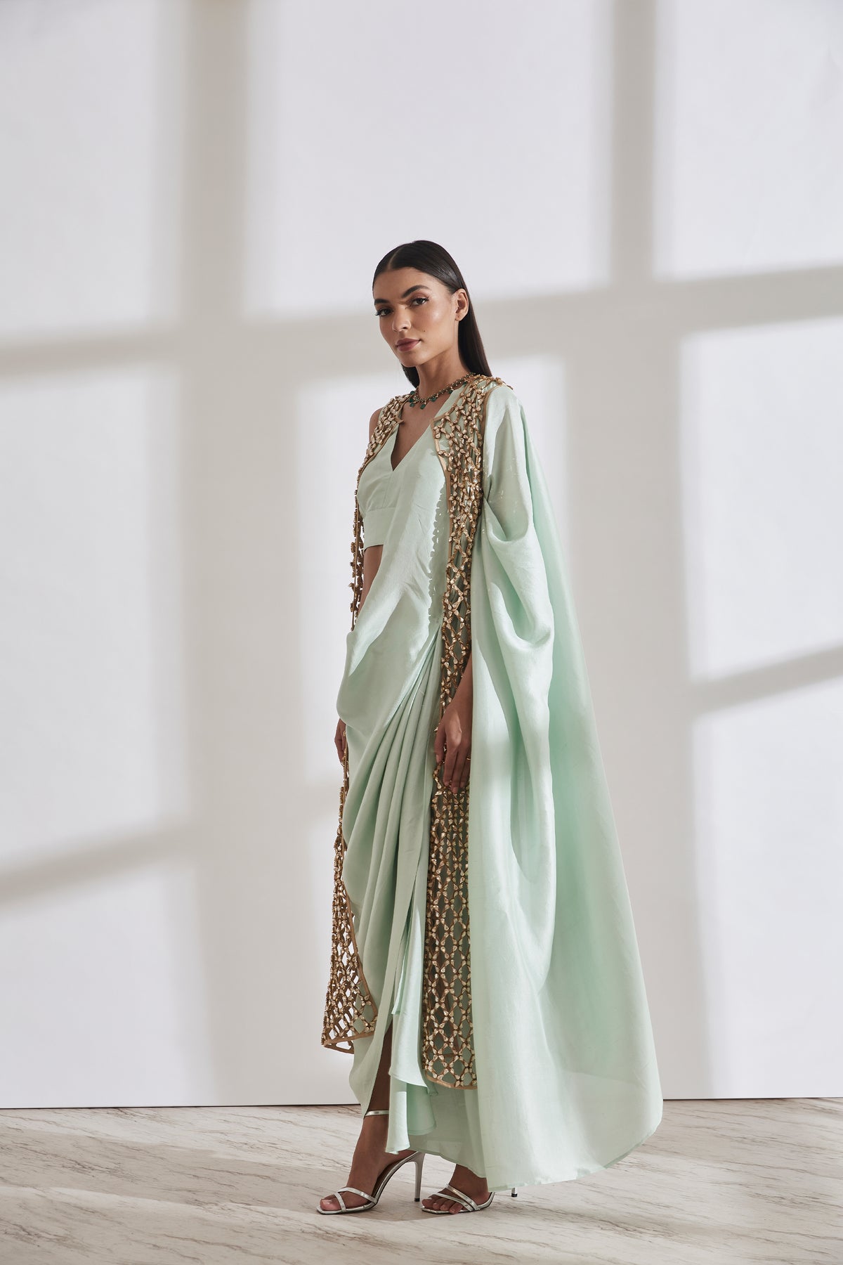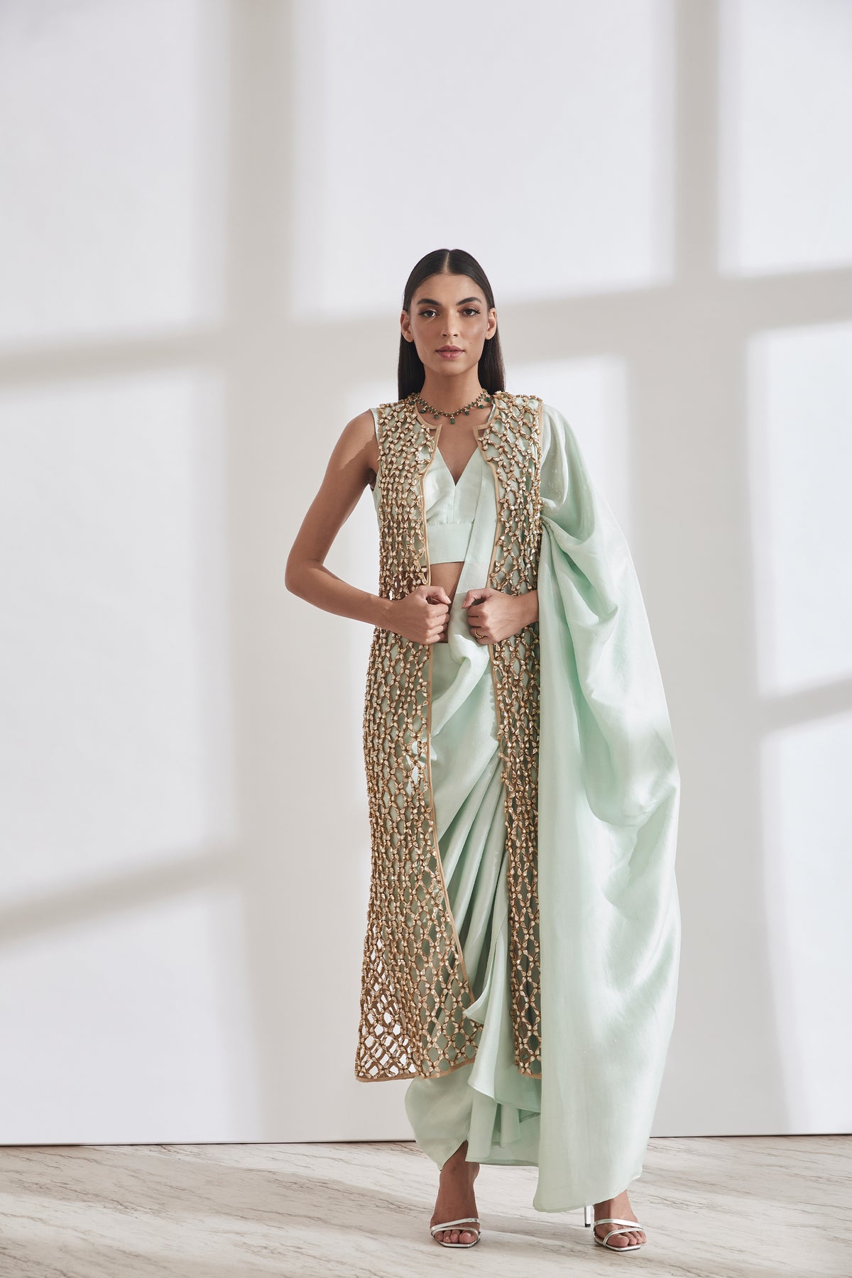 Elevate this classic sari set with the statement honeycomb jacket which is embroidered over a span of 250 hours. The golden hue looks great on the indian skin tone and sits beautifully on the mint. The masai godet sari is pre draped and the pallu sits on the shoulder with the help of a snap button on the waist.