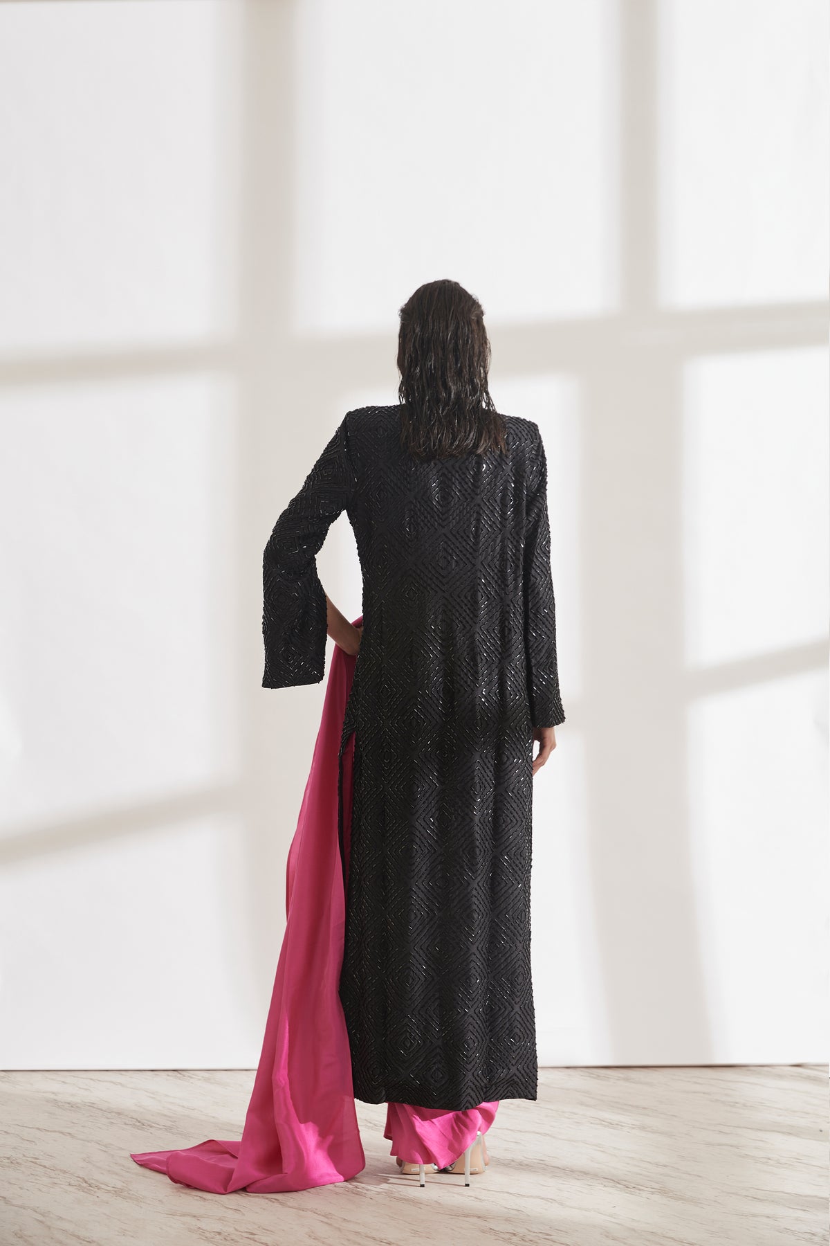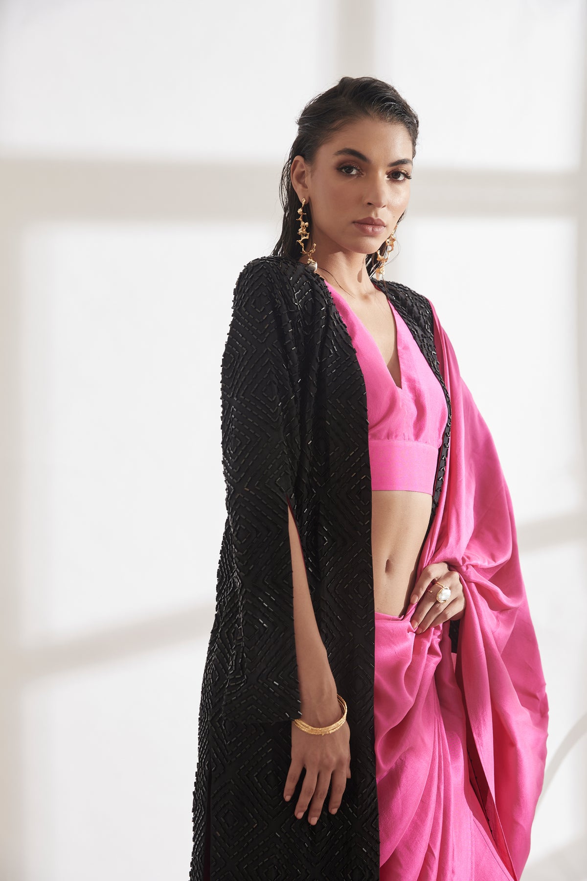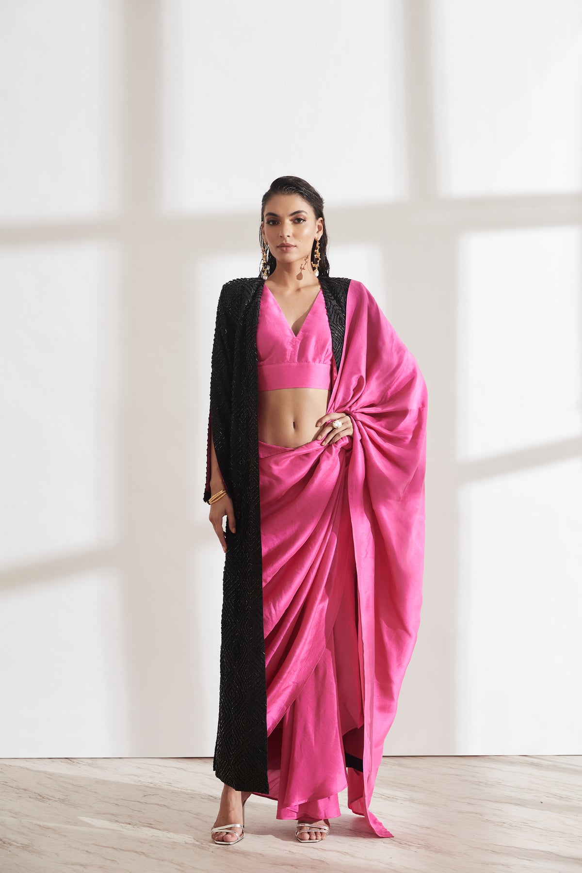 Hand embroidered statement jackets over statement colours. The fuss free masai godet sari is pre draped and has an in built petticoat. Options available to customize the blouse.
