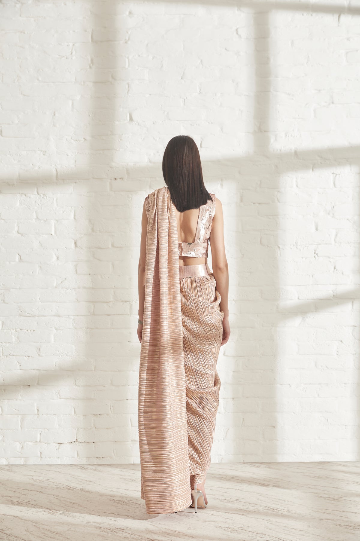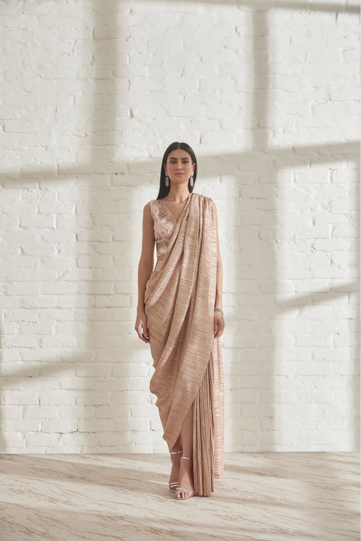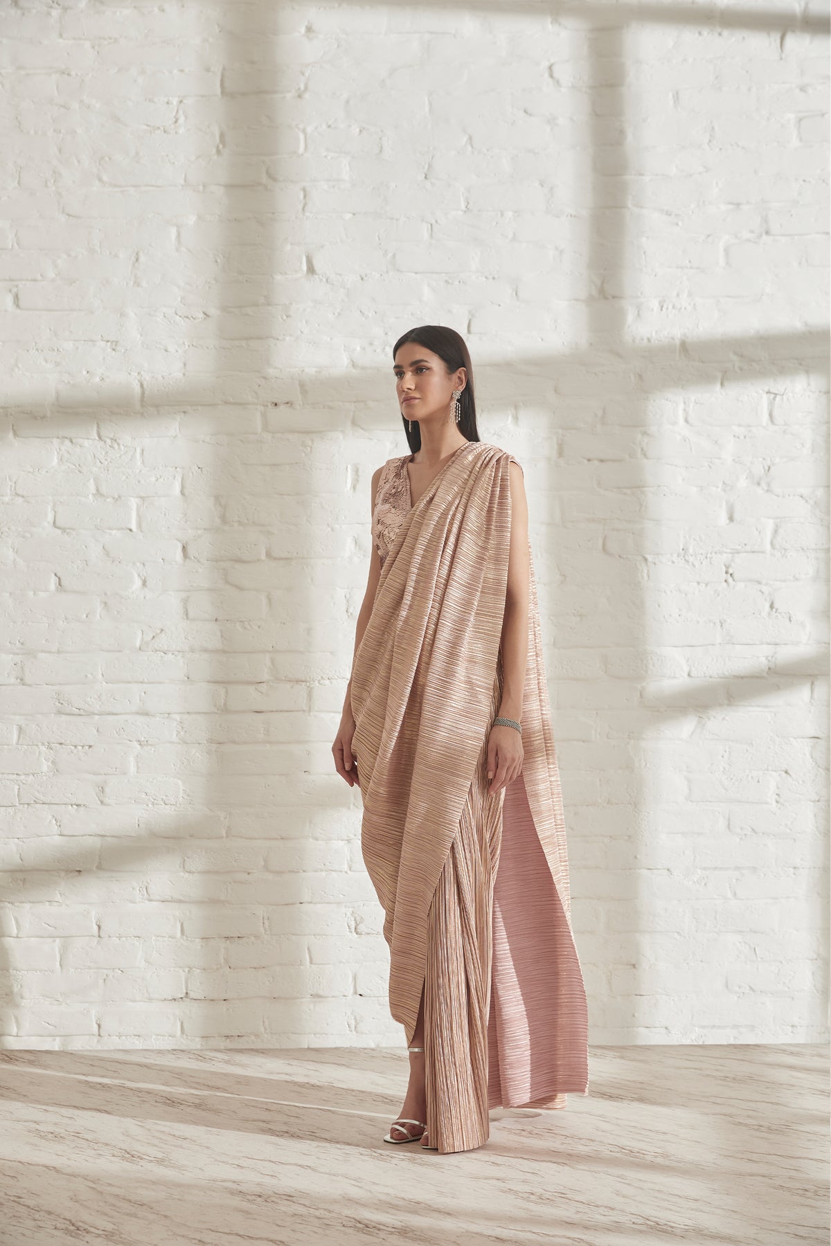 Our signature metallic 2.0 sari comes with a built in petticoat. Lightweight, fuss free and easy to wear, it’s the perfect piece to carry to destination weddings.