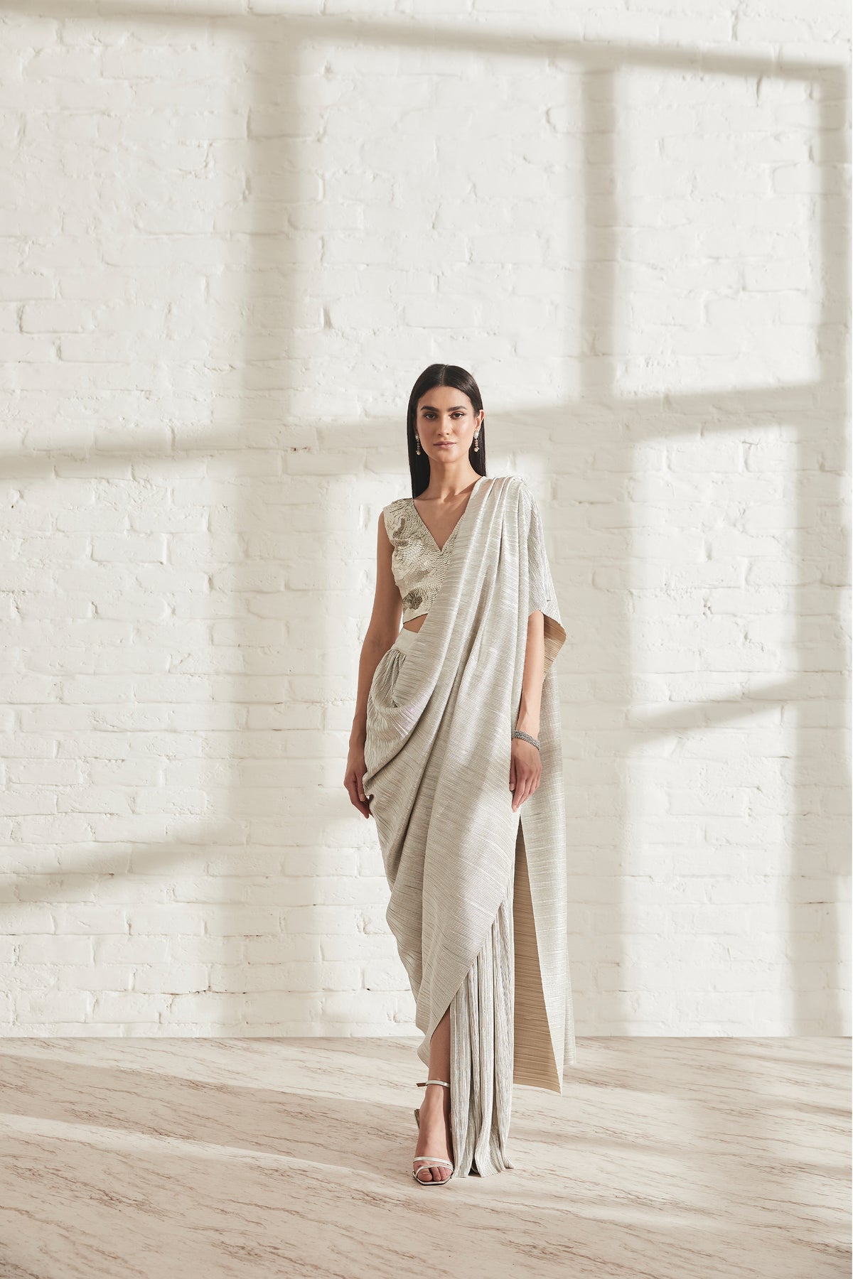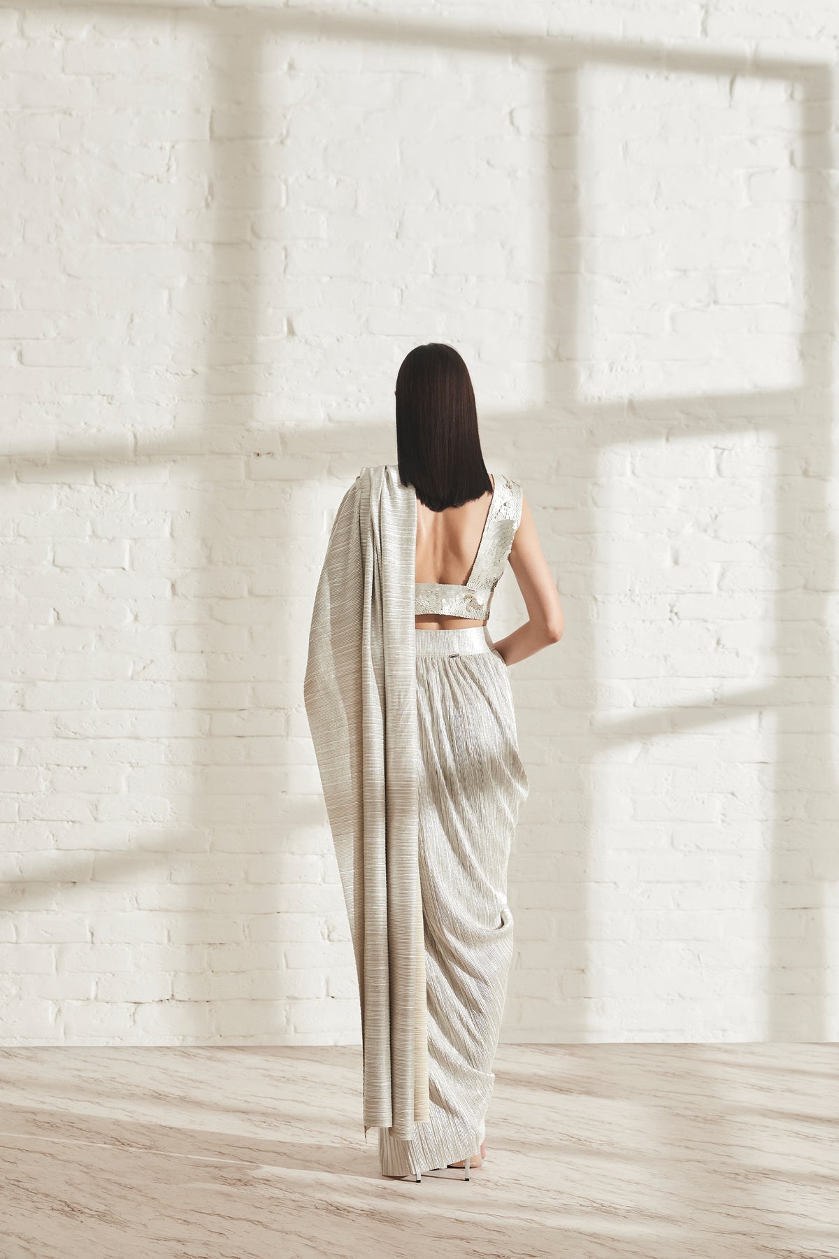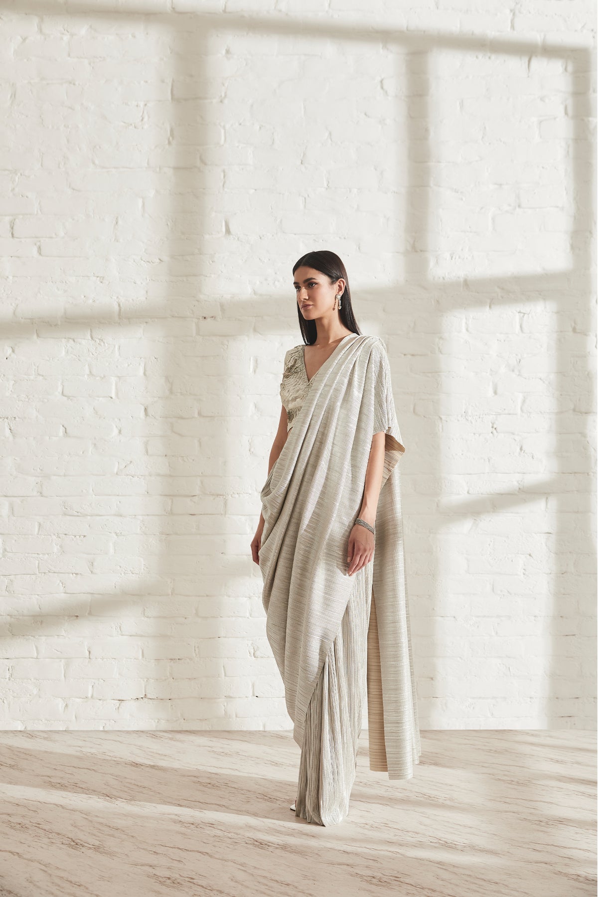 The champagne is the bestselling colour in the metallic range. Our signature metallic 2.0 sari now comes with a built in petticoat. Lightweight, fuss free and easy to wear, it’s the perfect piece to carry to destination weddings. Reach out to shop the blouse separately