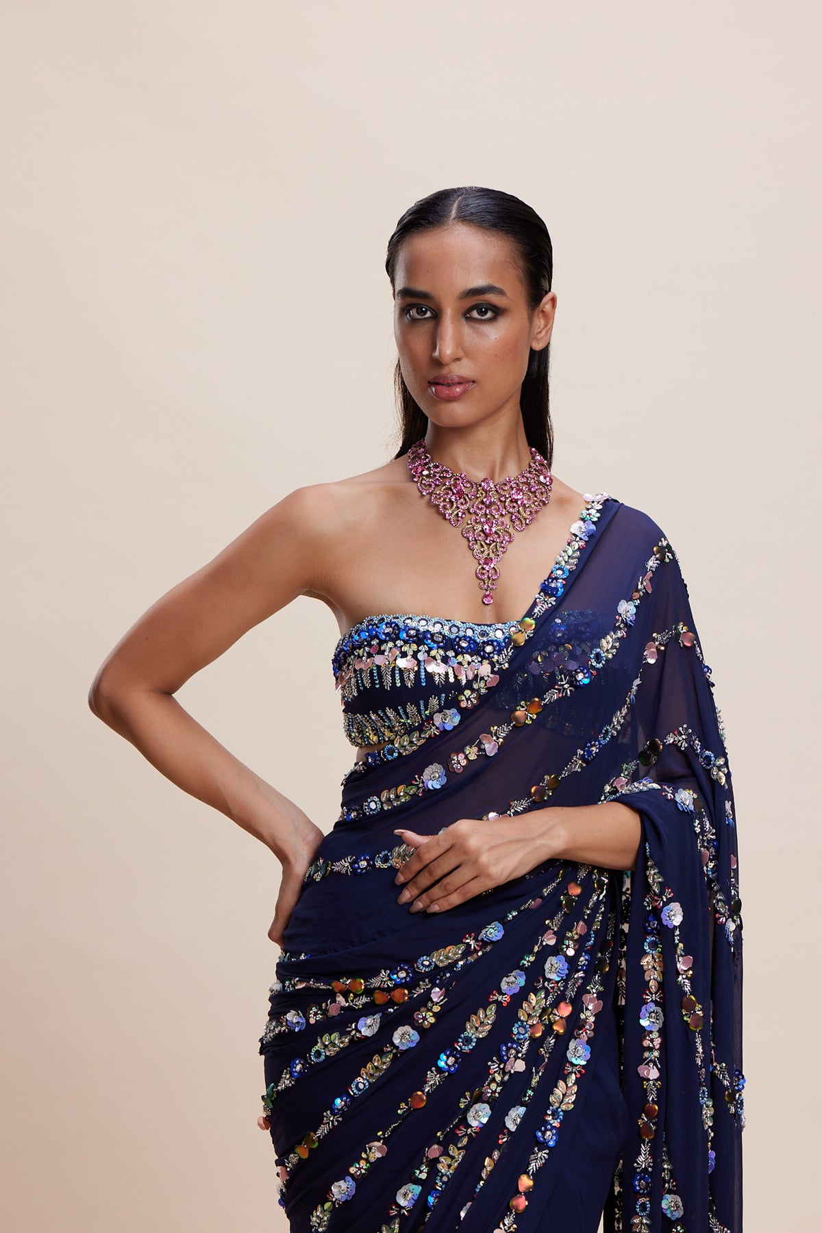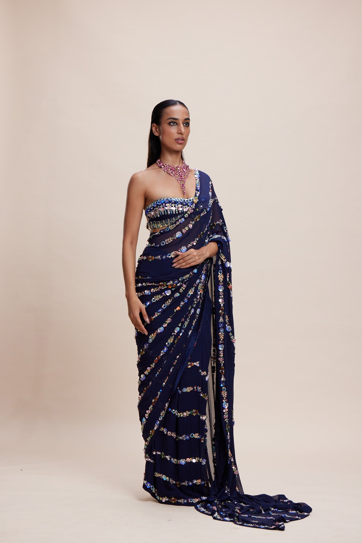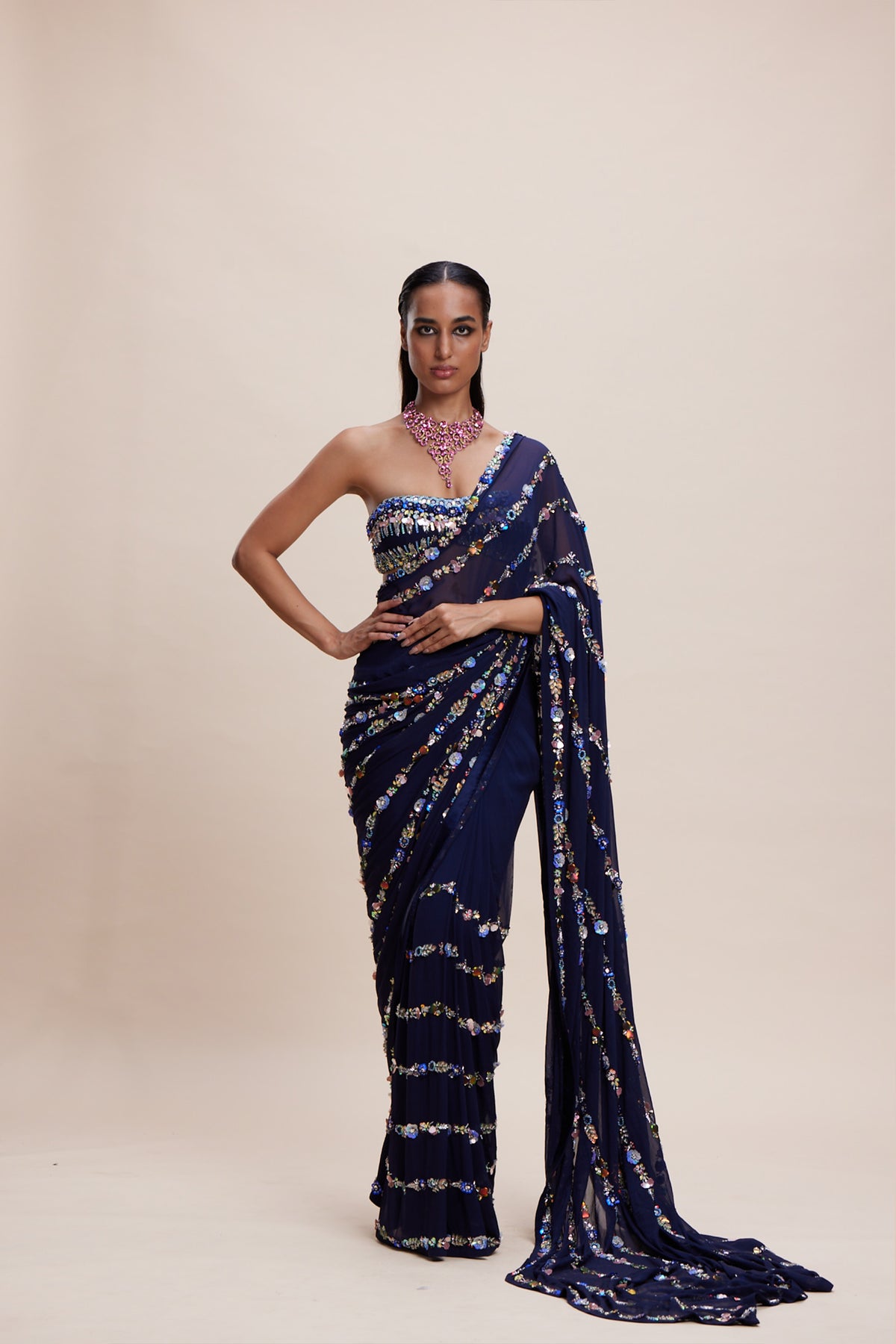 Step into sophistication with our black cocktail silk saree, featuring dazzling swarovski accents. The elaborately embellished sleeveless blouse and detailed embellishments enhance your look with unmatched grace
