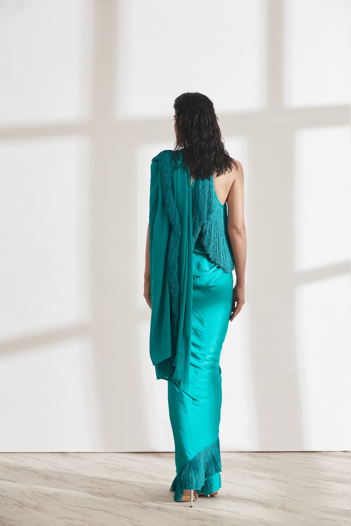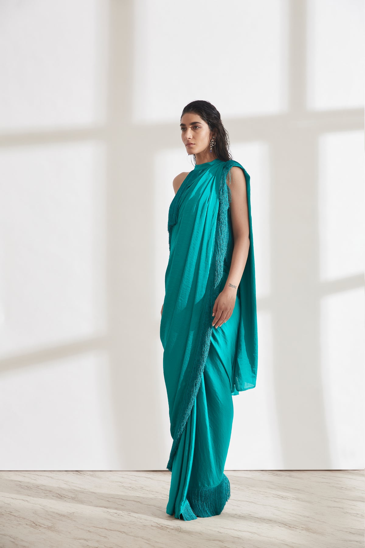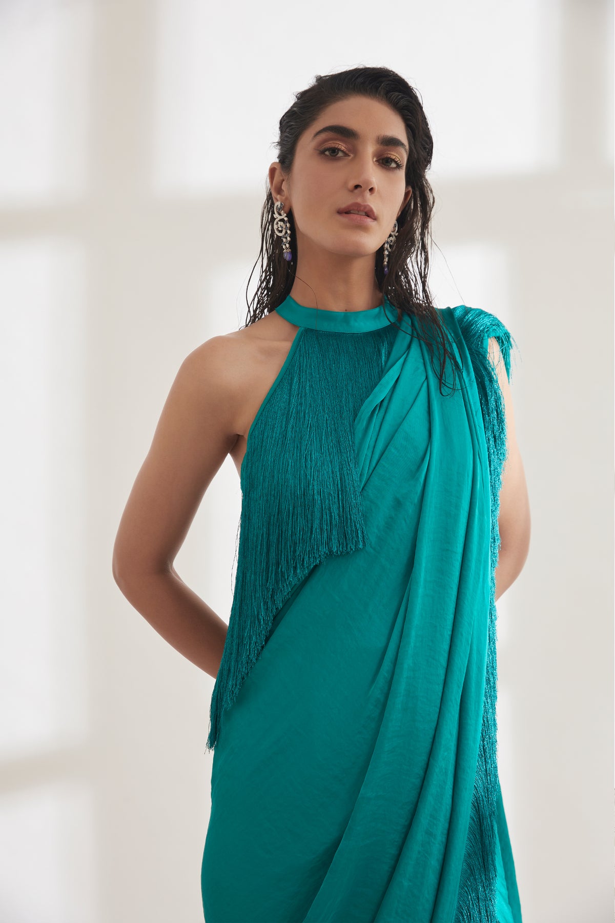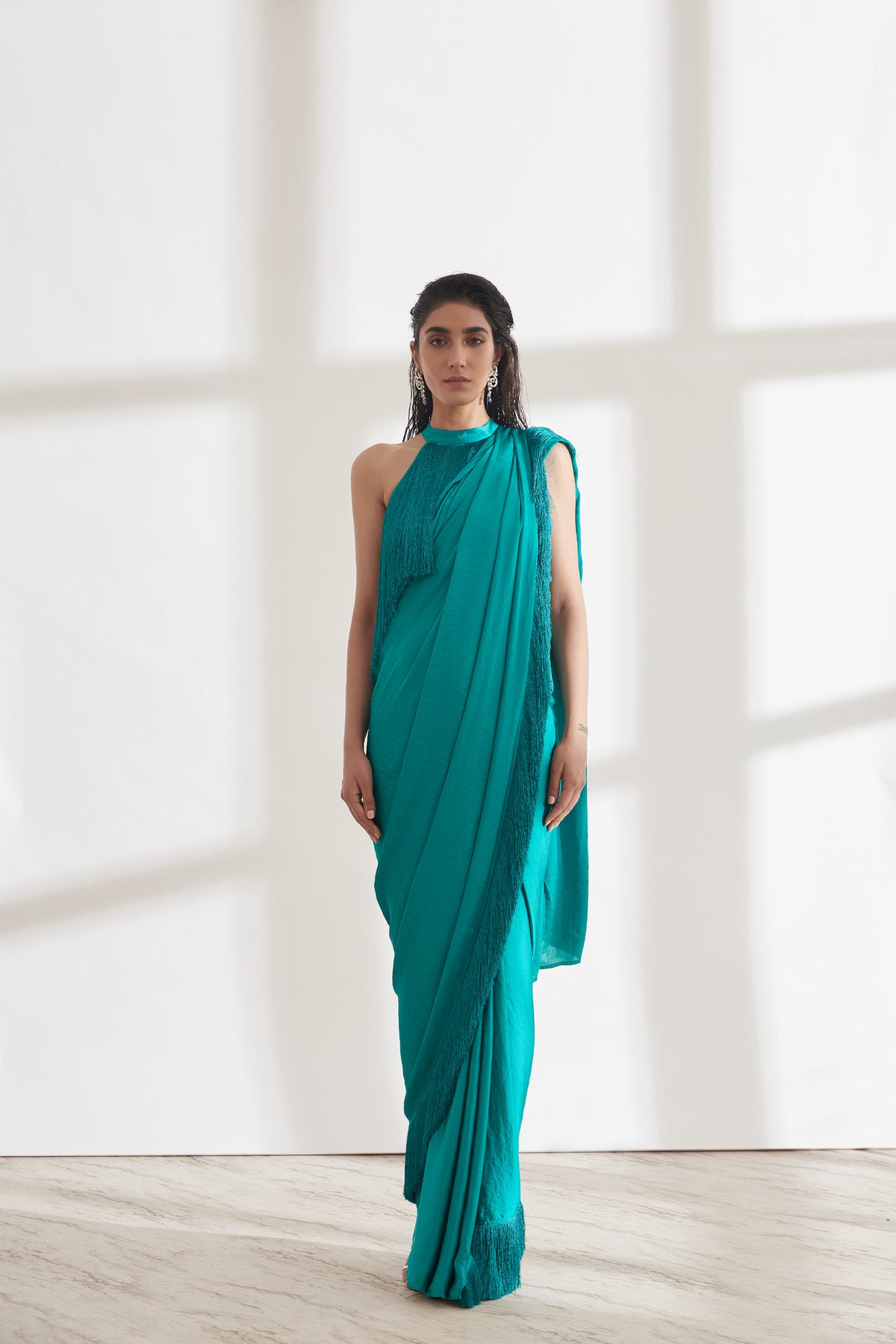 Our noor fringe sari features a full pre-draped sari that looks like a regular sari with our signature fringe detail. Pair it with the halter fringe top or get in touch for more blouse options.
