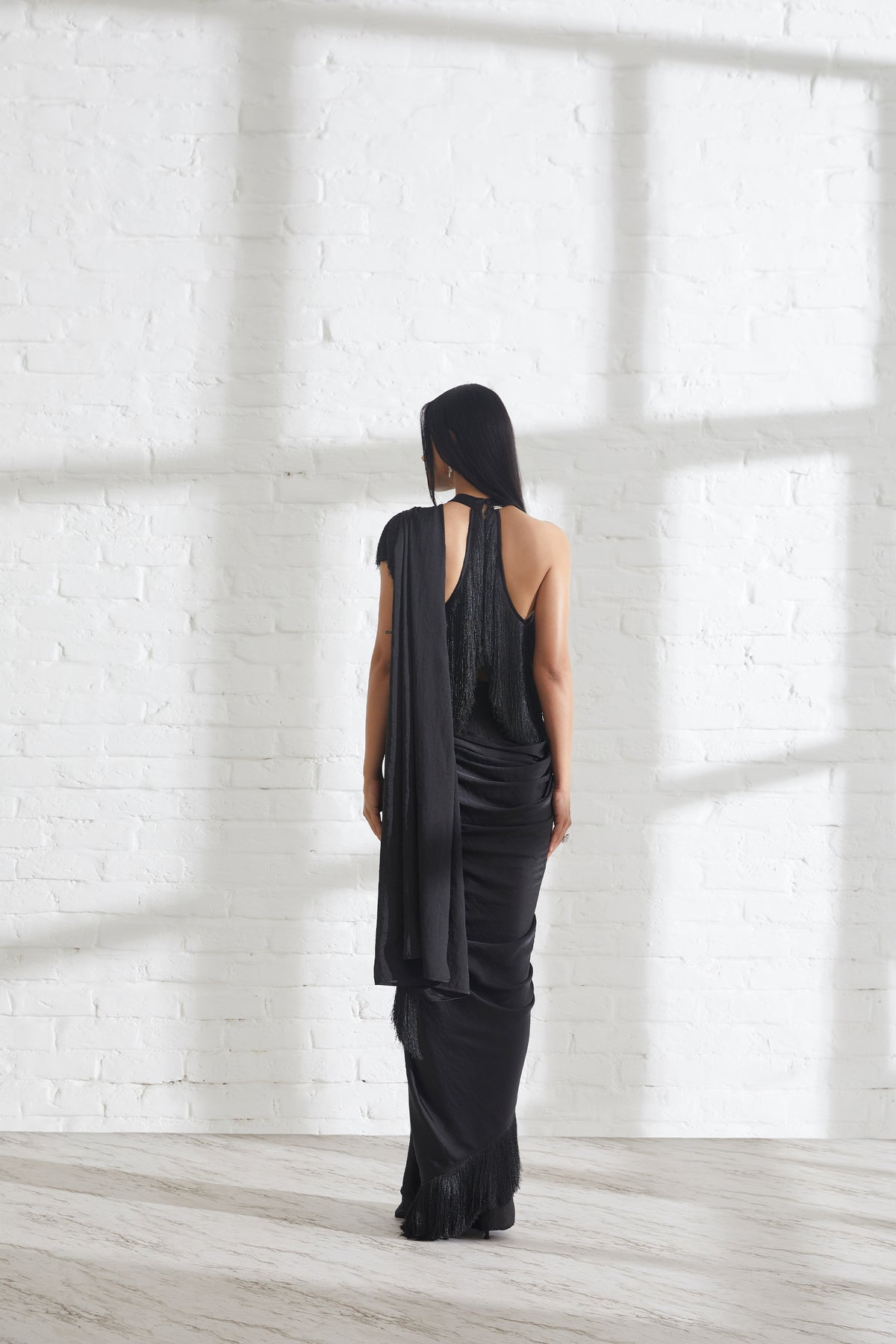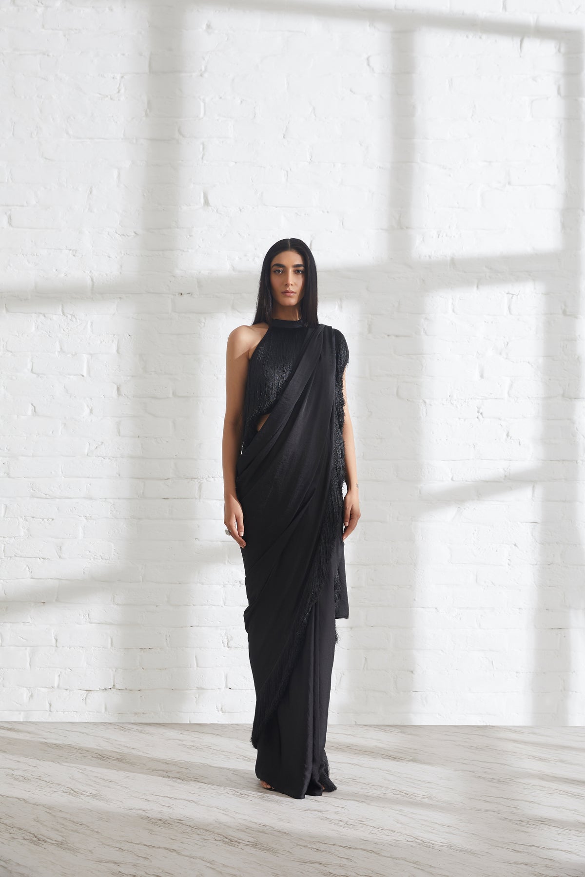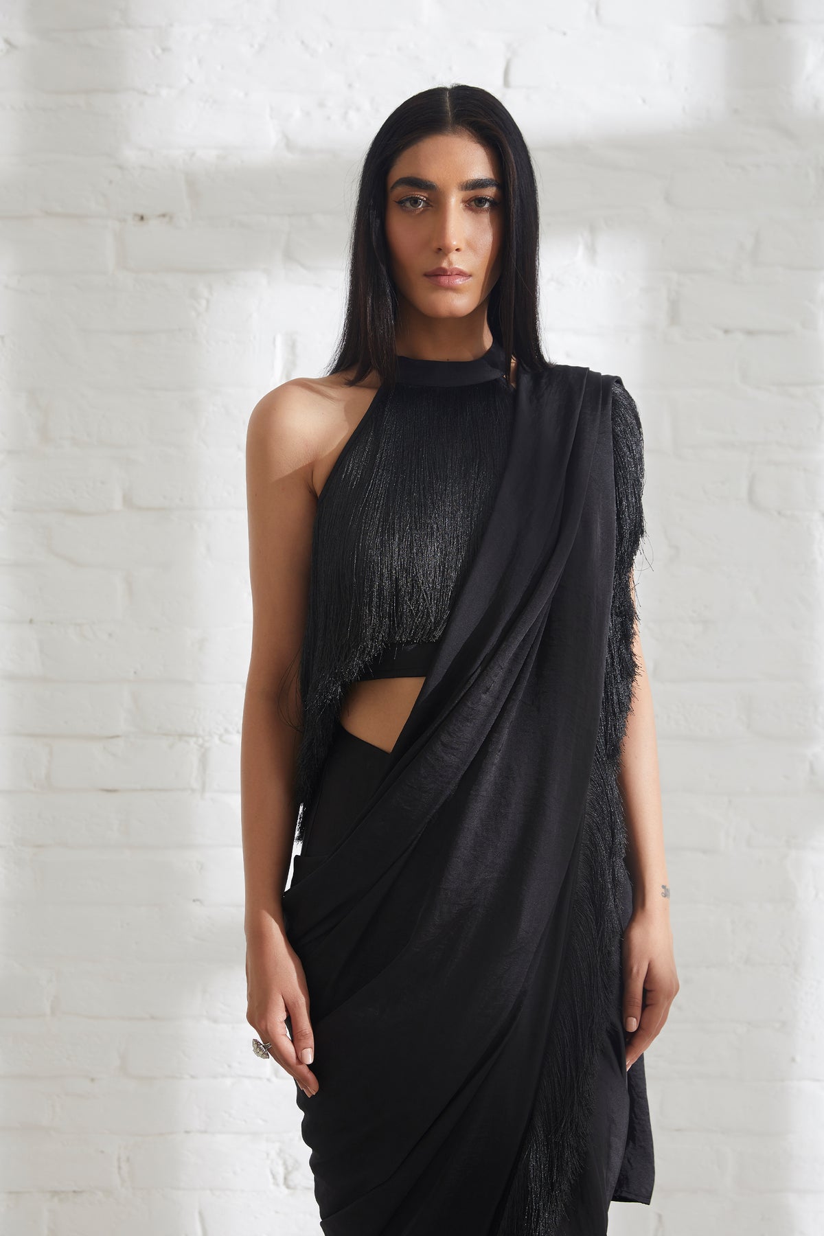 Our noor fringe sari features a full pre-draped sari that looks like a regular sari with our signature fringe detail. Pair it with the halter fringe top or get in touch for more blouse options.