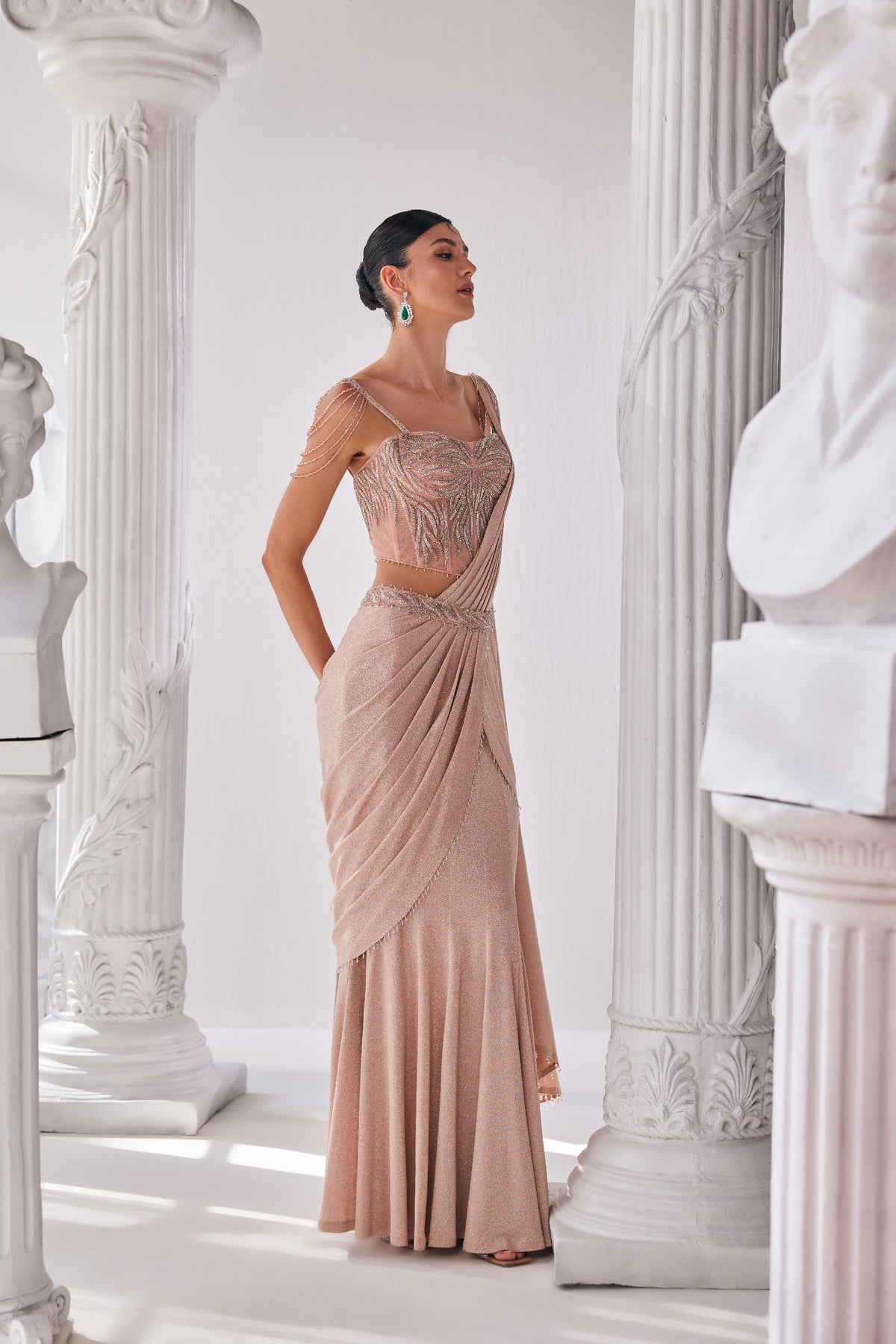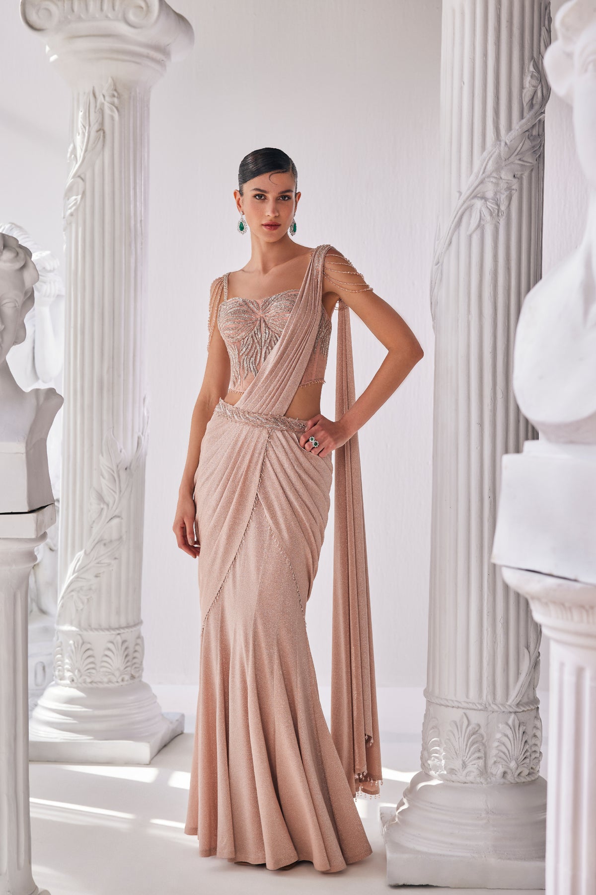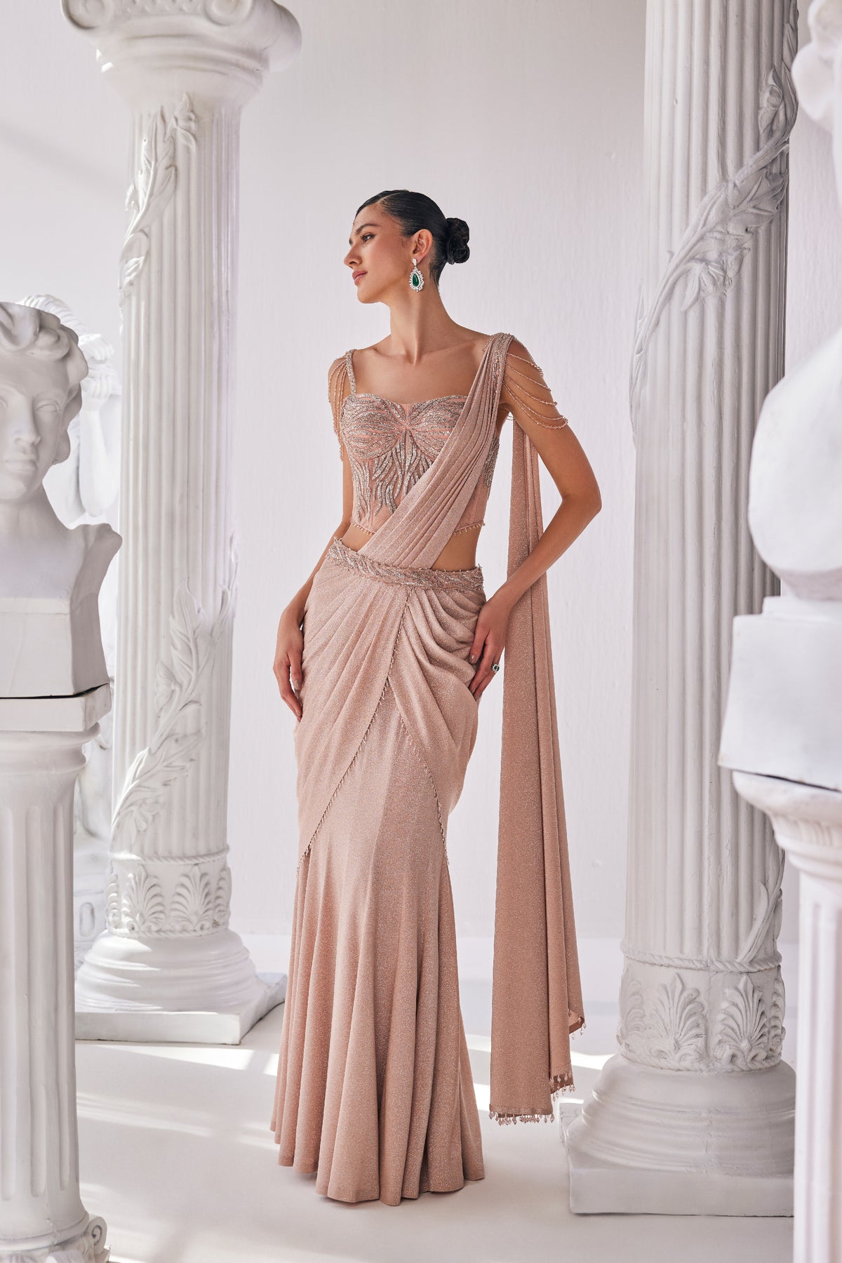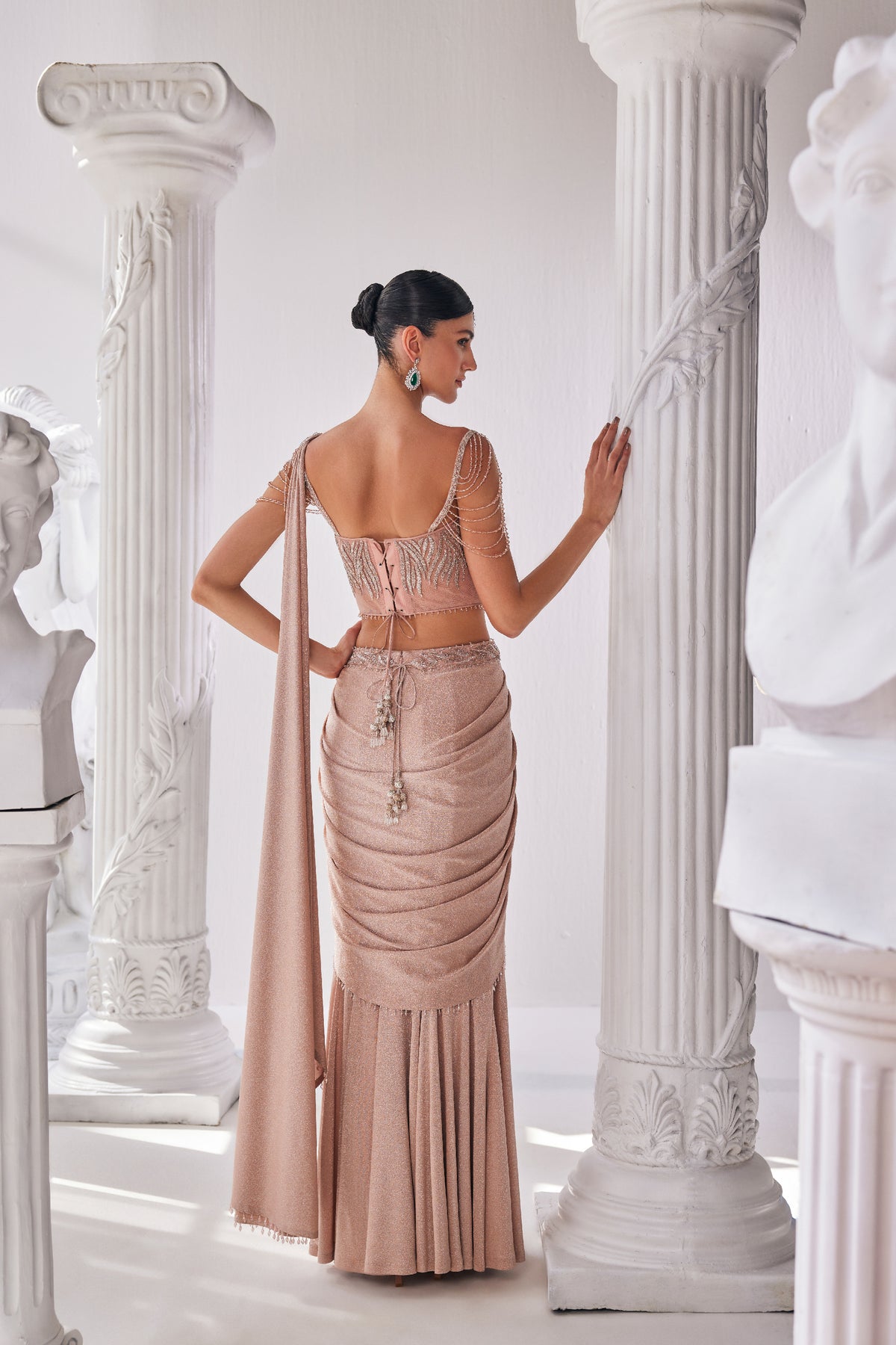This stunning peach draped saree crafted from luxurious shimmering lycra fabric. Paired elegantly with an embroidered corset blouse. Elevating the ensemble is a statement belt that adds a touch of glamour.