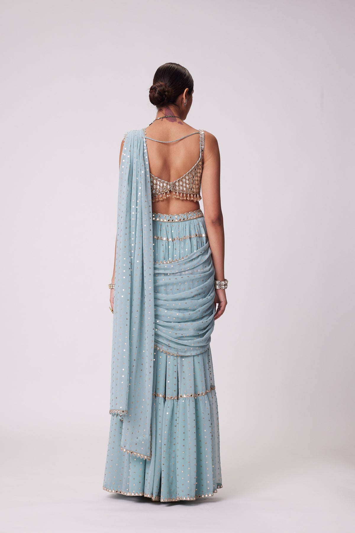 Powder blue multitier hand embroidered saree clubbed with real hand-cut mirror embroidered sleeveless blouse.