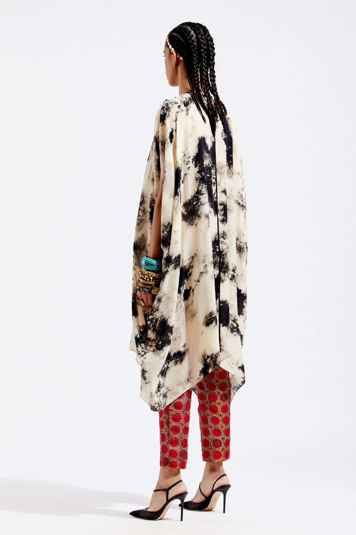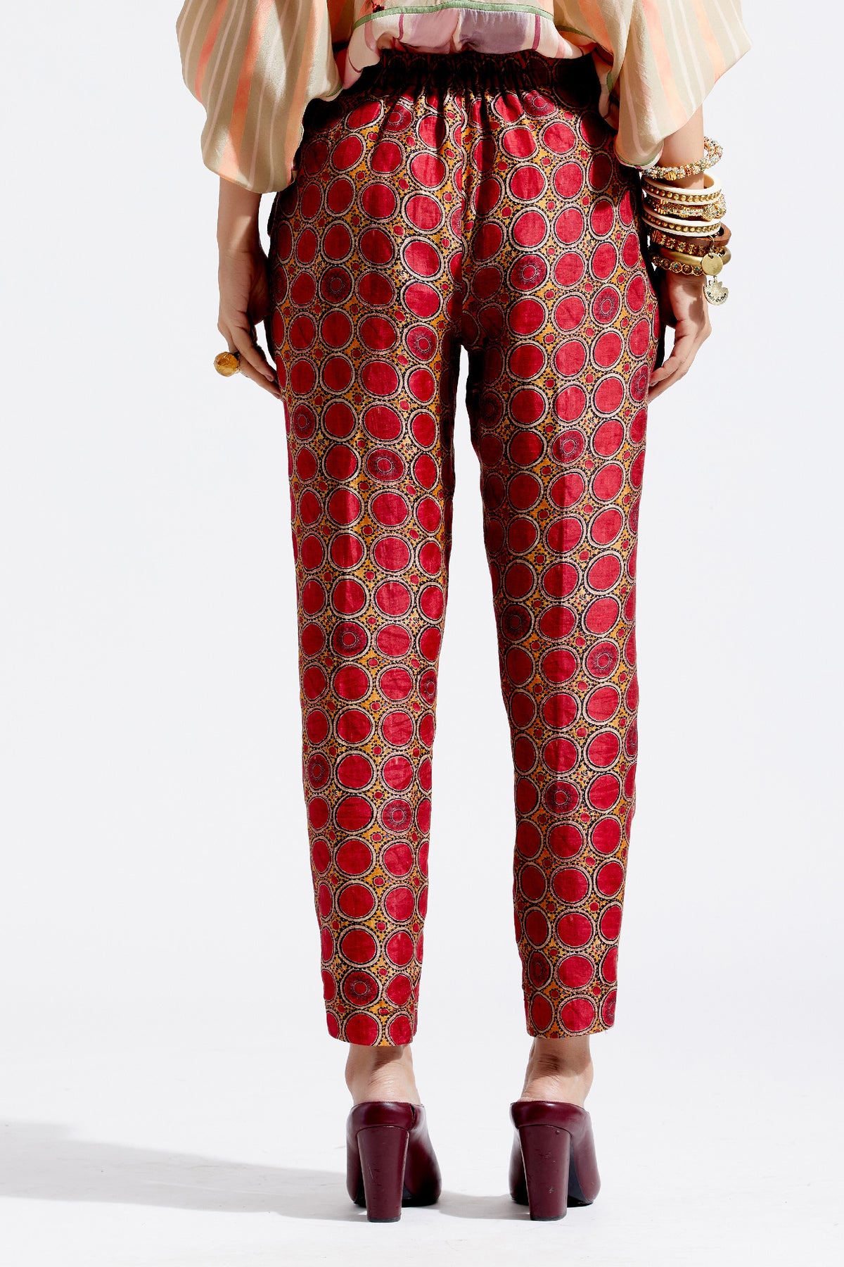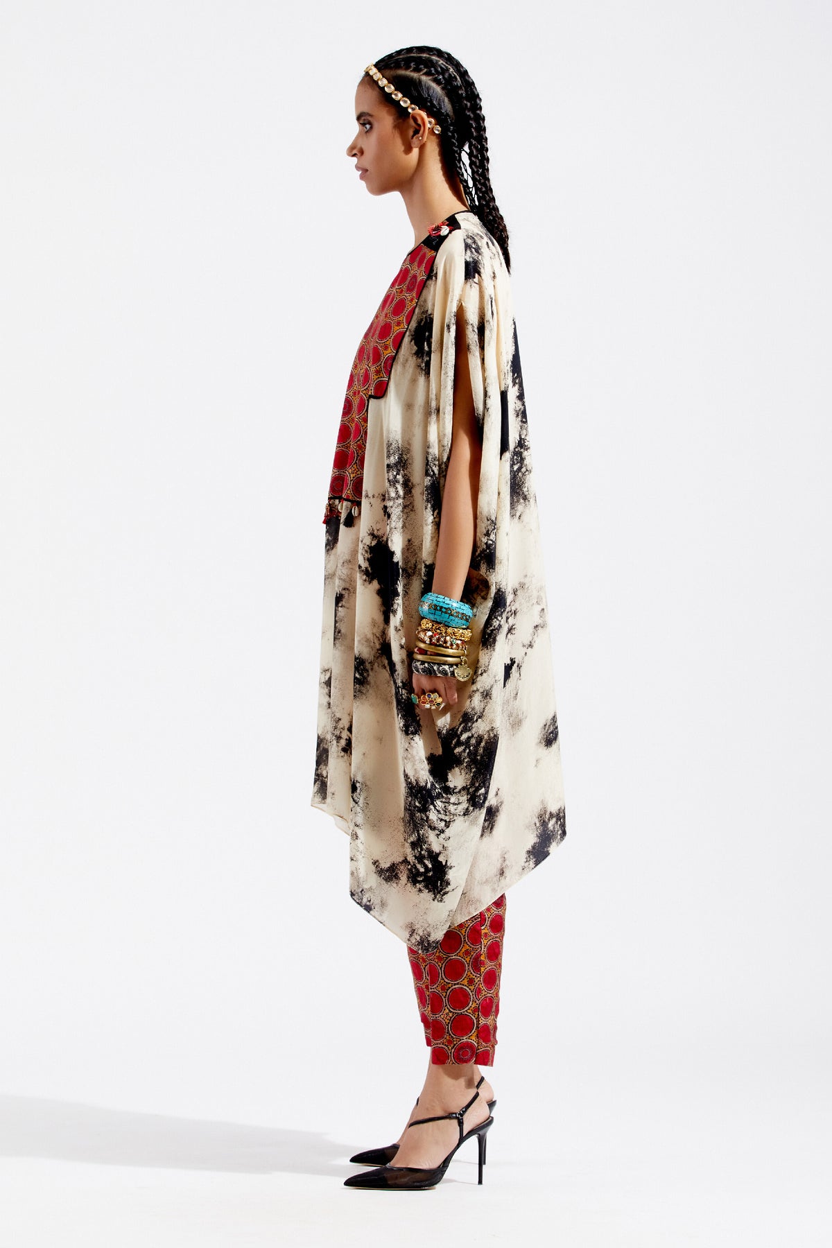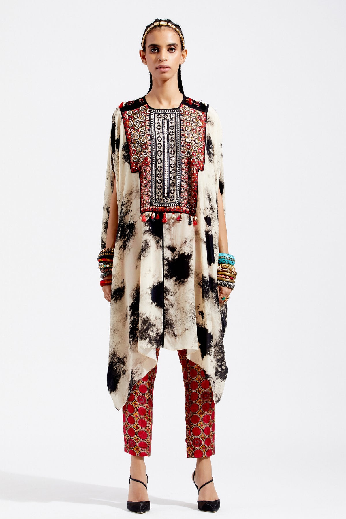 Print tunic with embroidered yoke, tribal tassel detail and seam inserts. Print narrow trouser in sindoor colour.