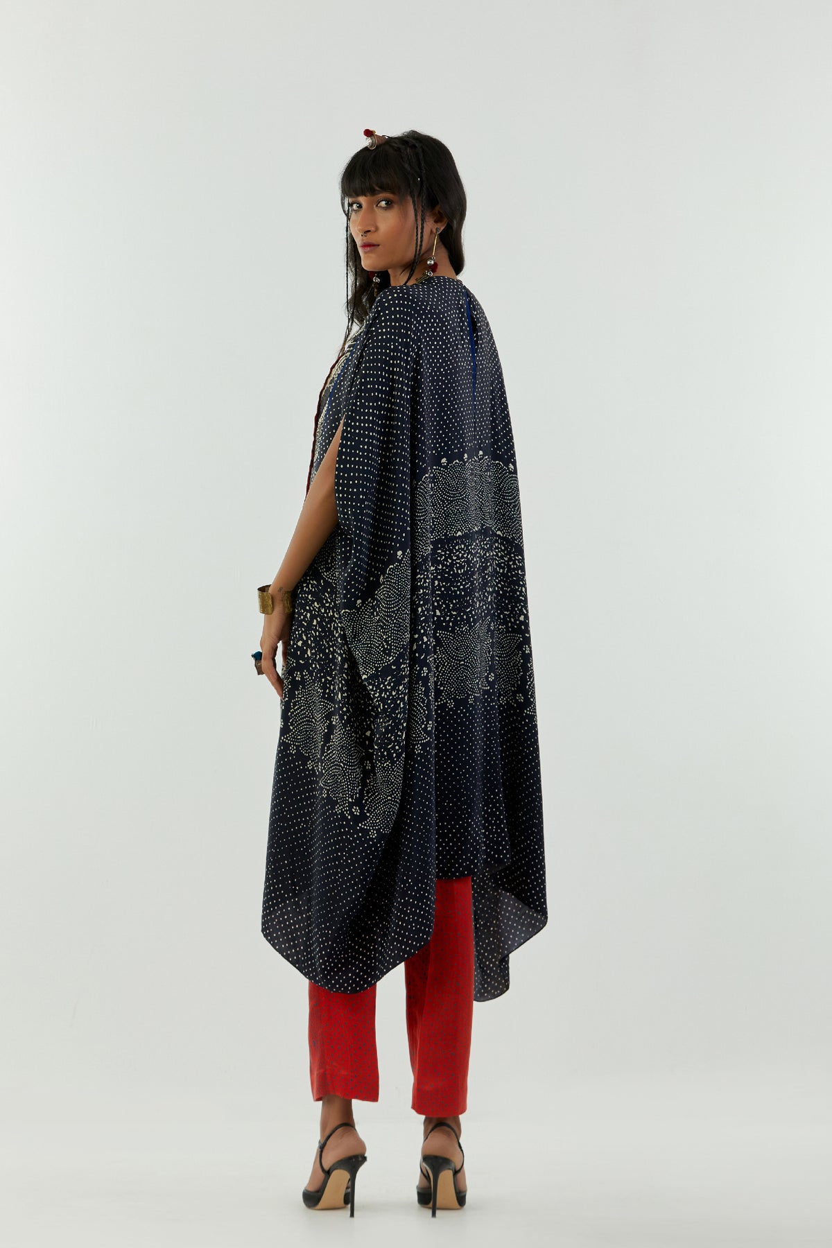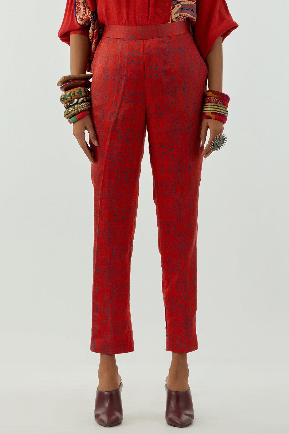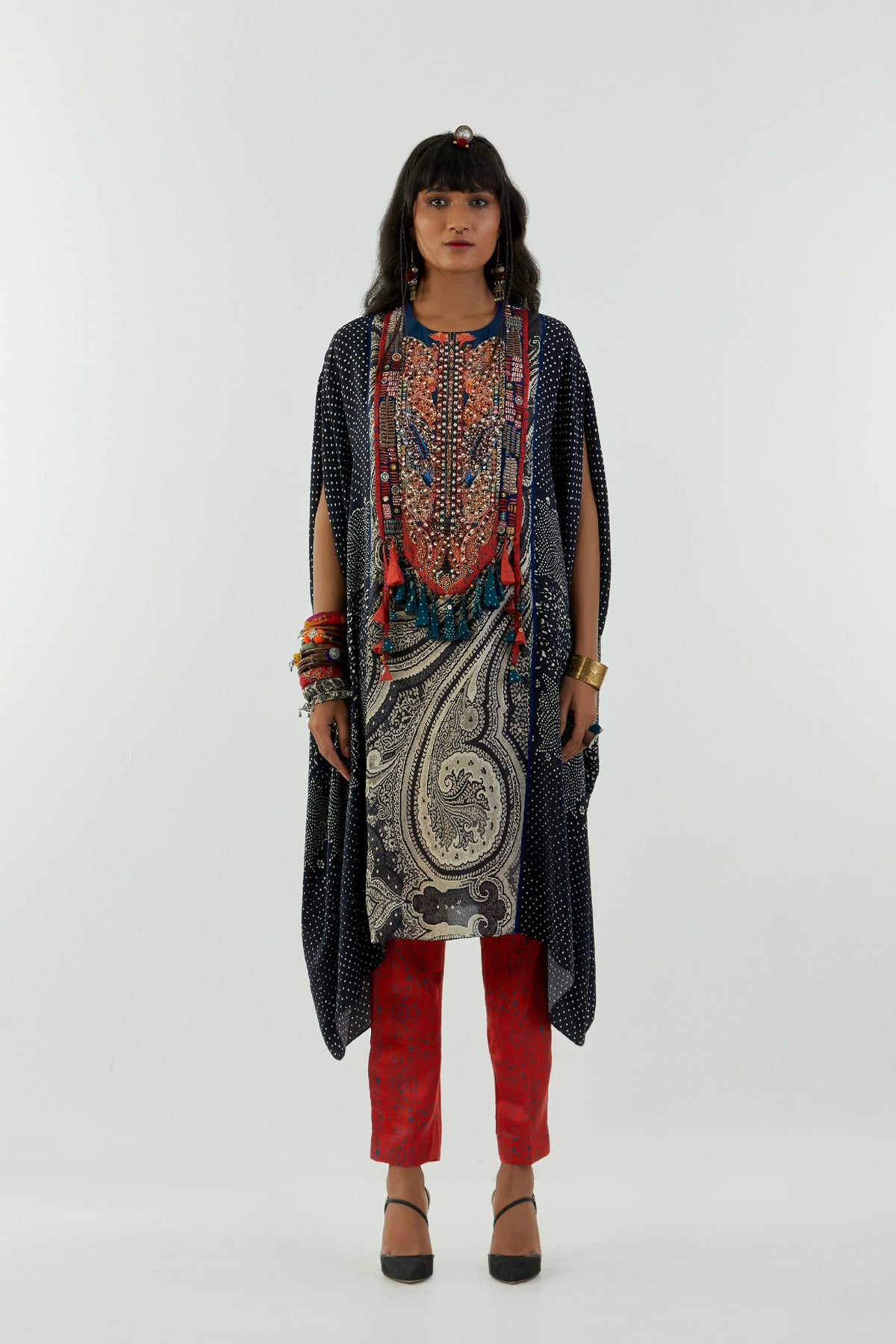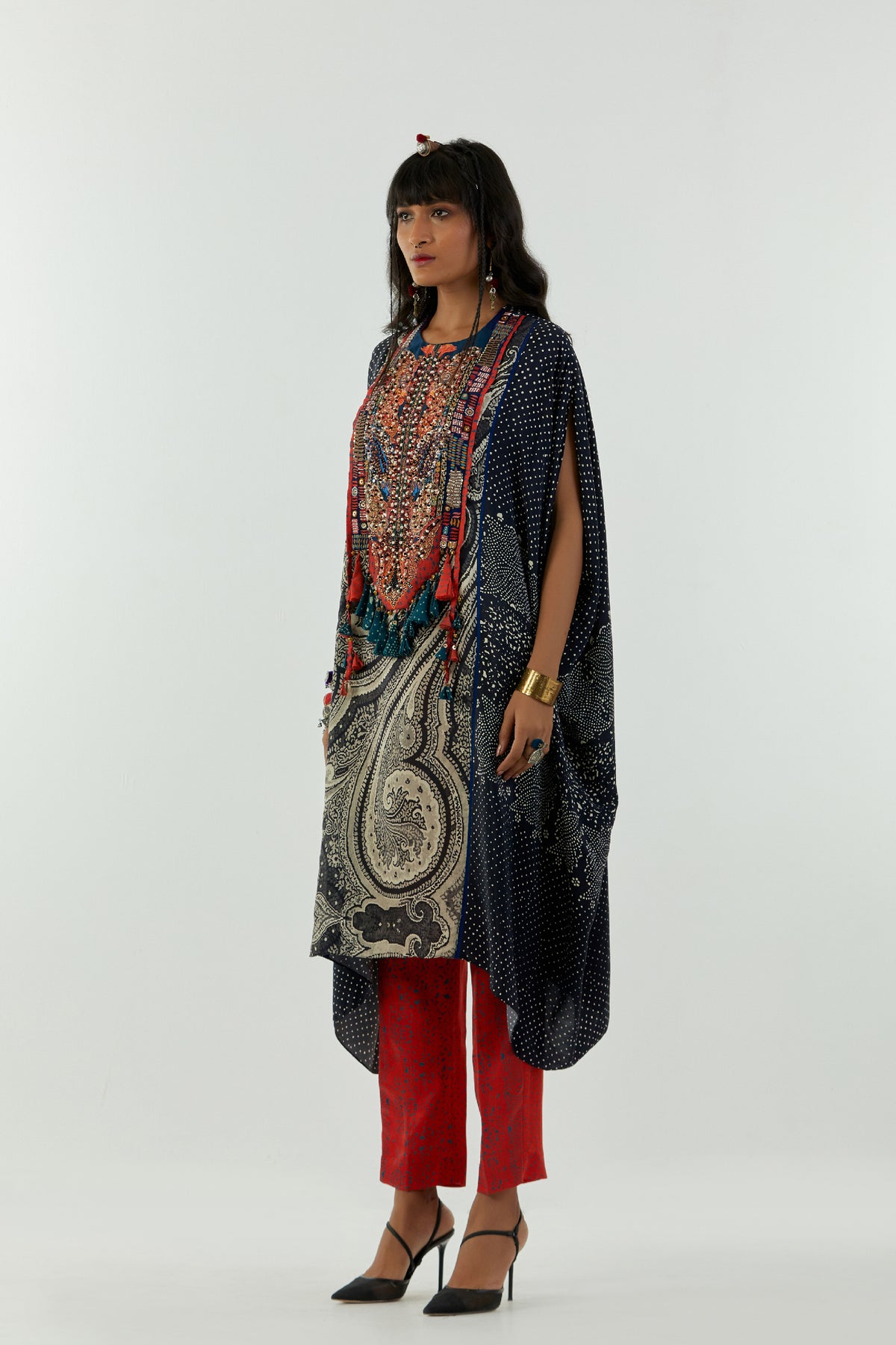 Ambi print tunic with embroidered yoke and tribal tassel detail and seam inserts paired with printed narrow trouser.
