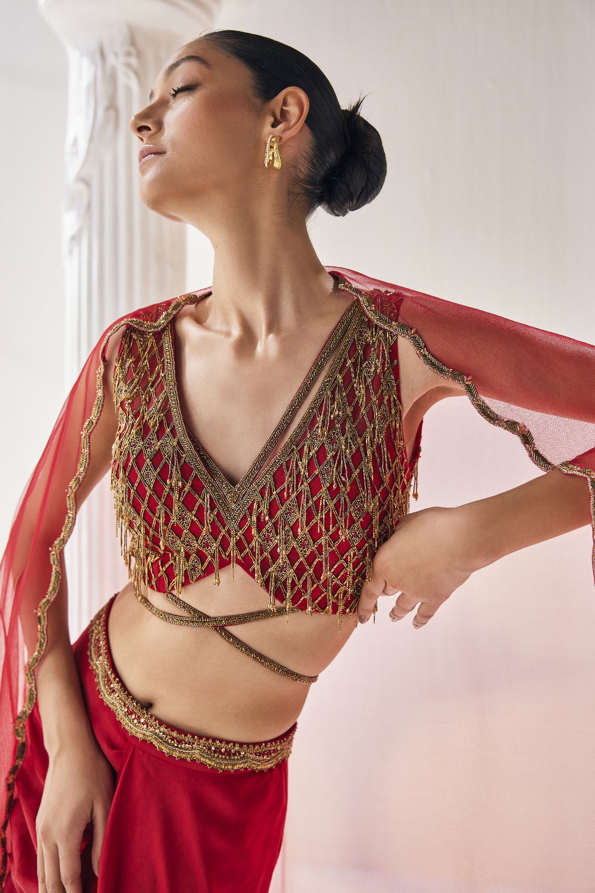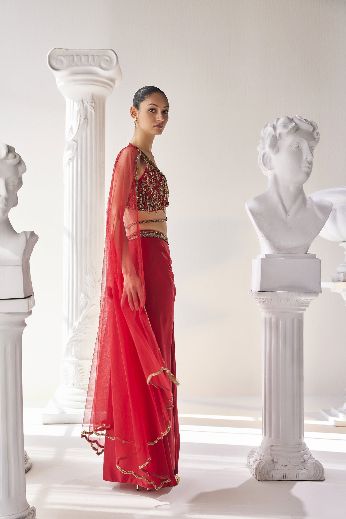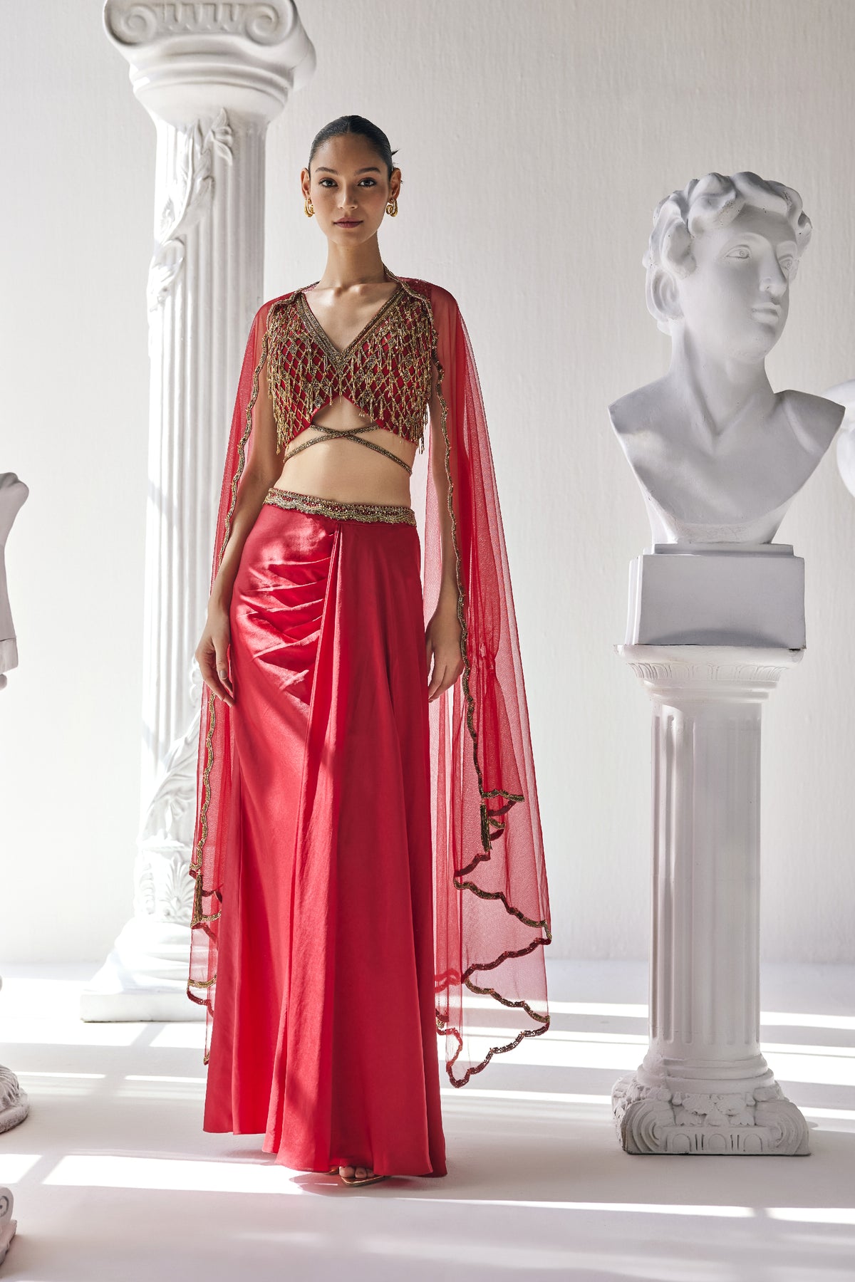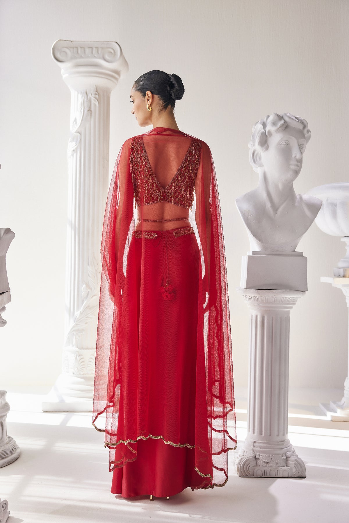 This elegant ensemble features a royal satin skirt paired with a fully embroidered blouse and adorned with intricate zardozi work. It includes a slim belt for a polished look and a soft net cape that adds a touch of sophistication.