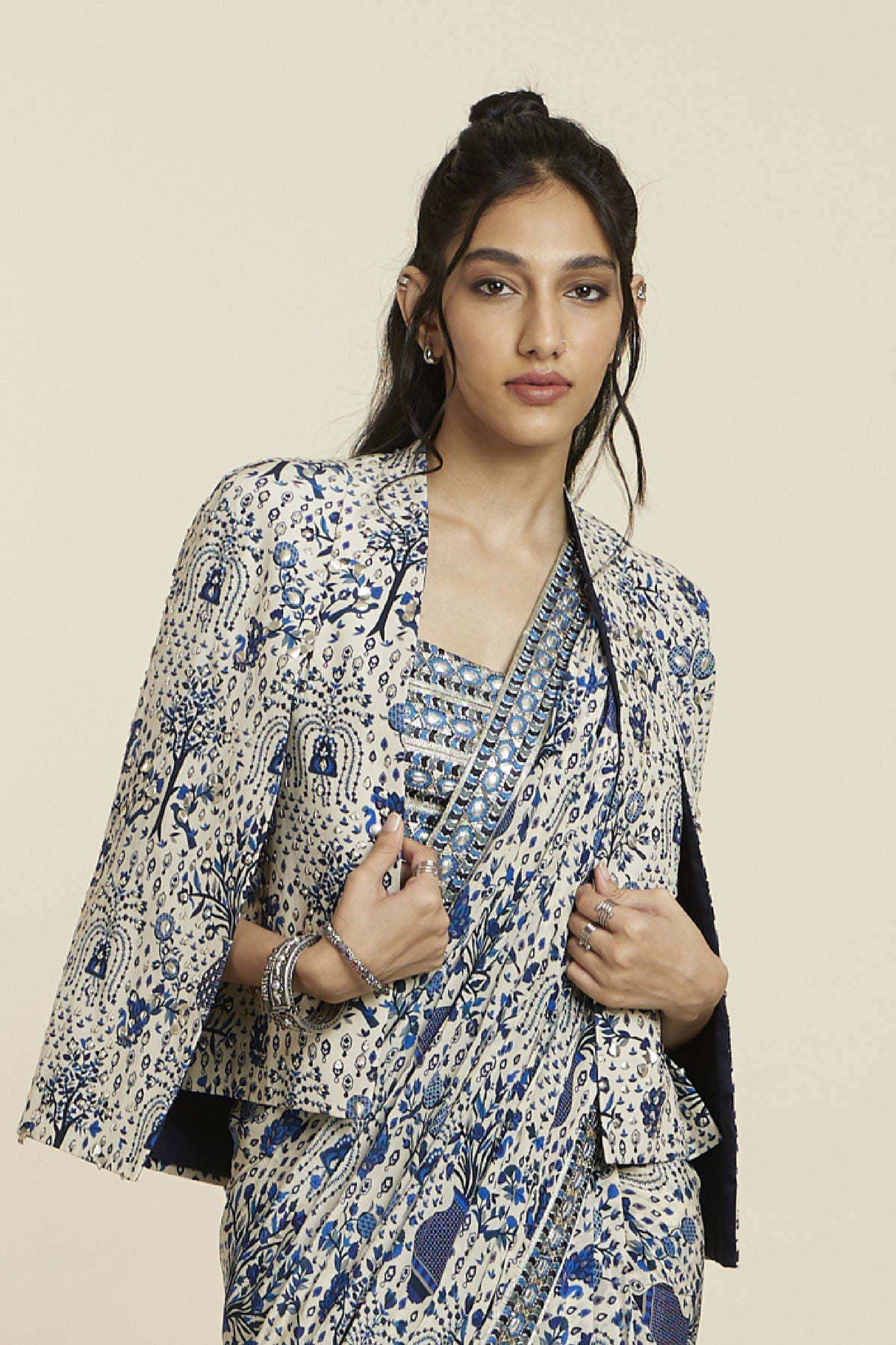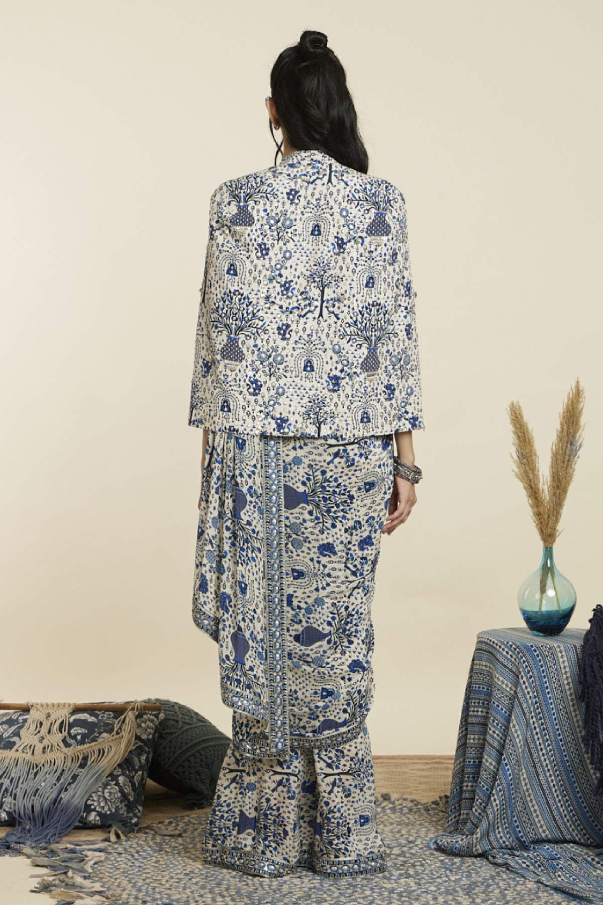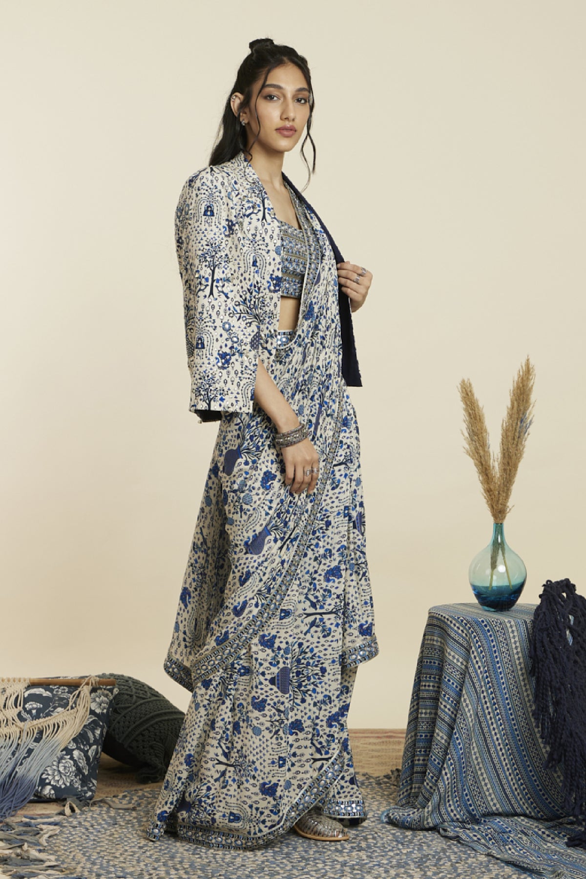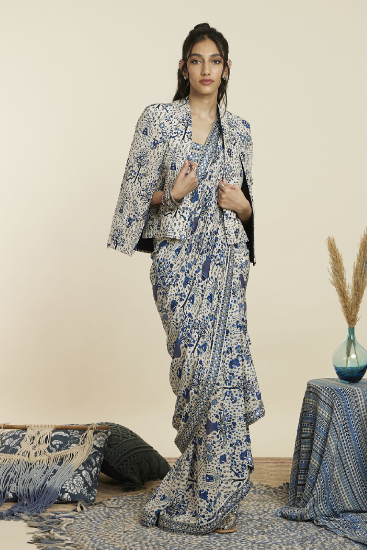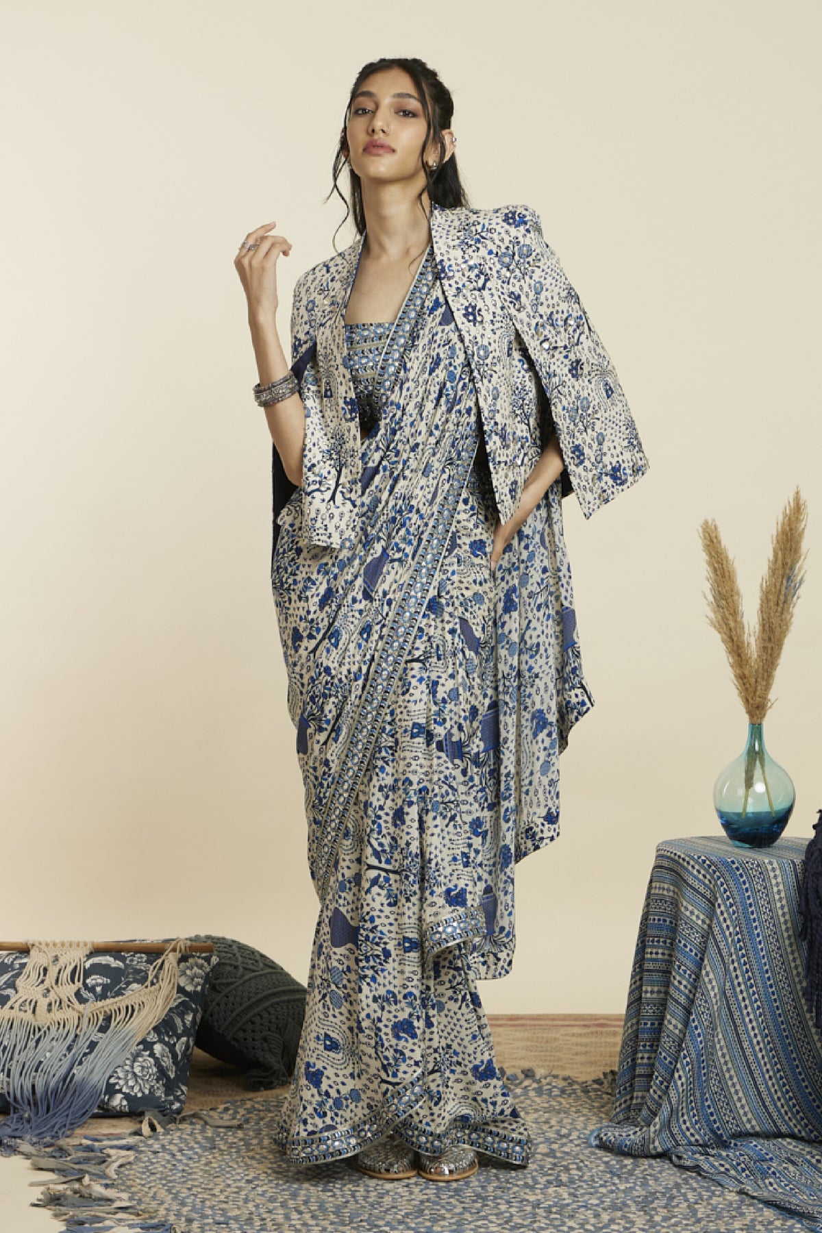 Safar blue jaal print cascade saree paired with embellished bustier and noor jacket