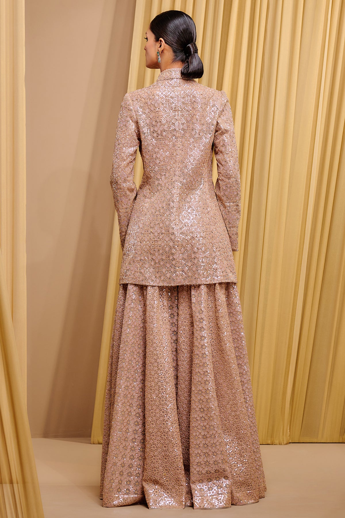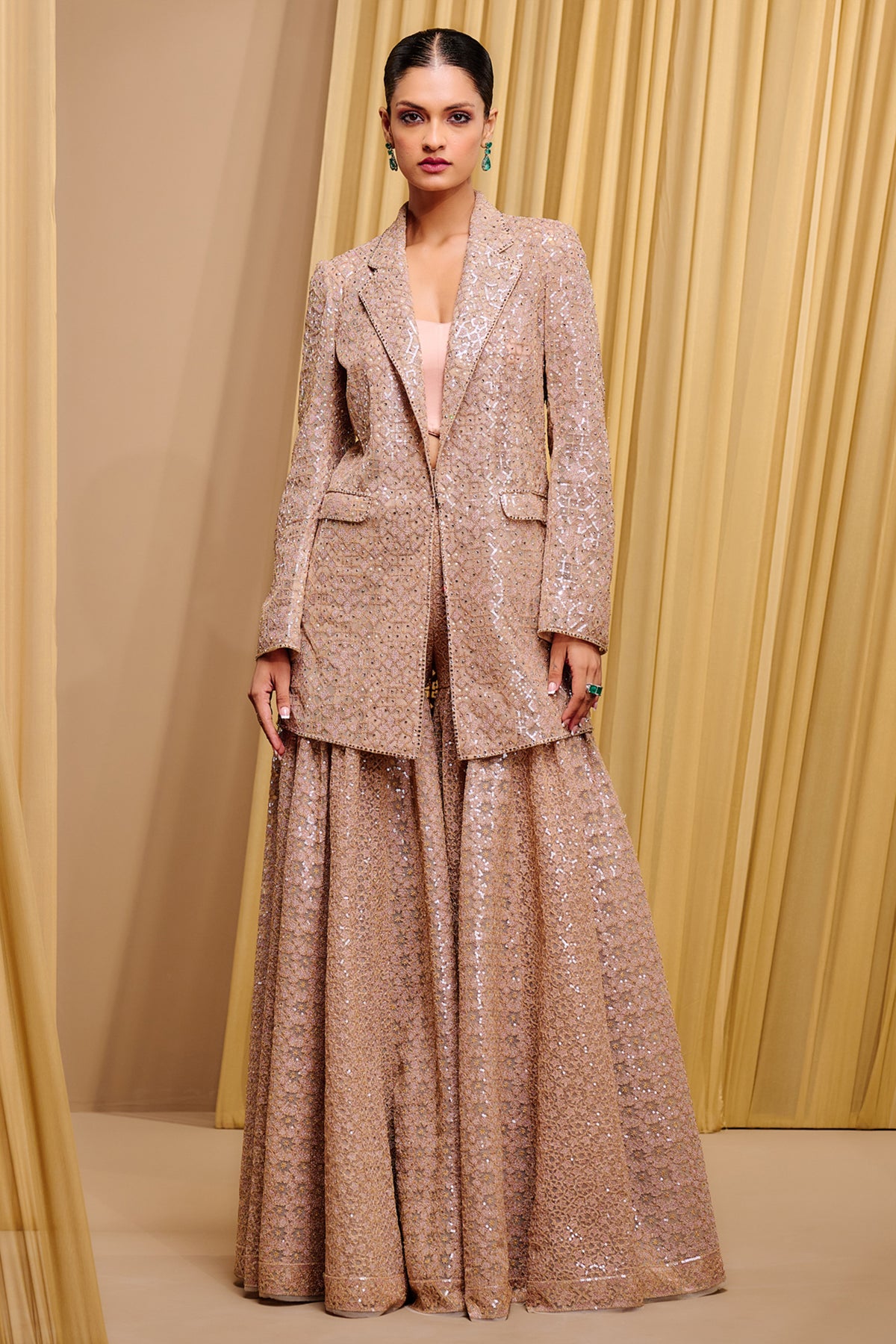 Intricately embroidered sequins jacket, paired with a sleek bustier and embroidered sharara pants