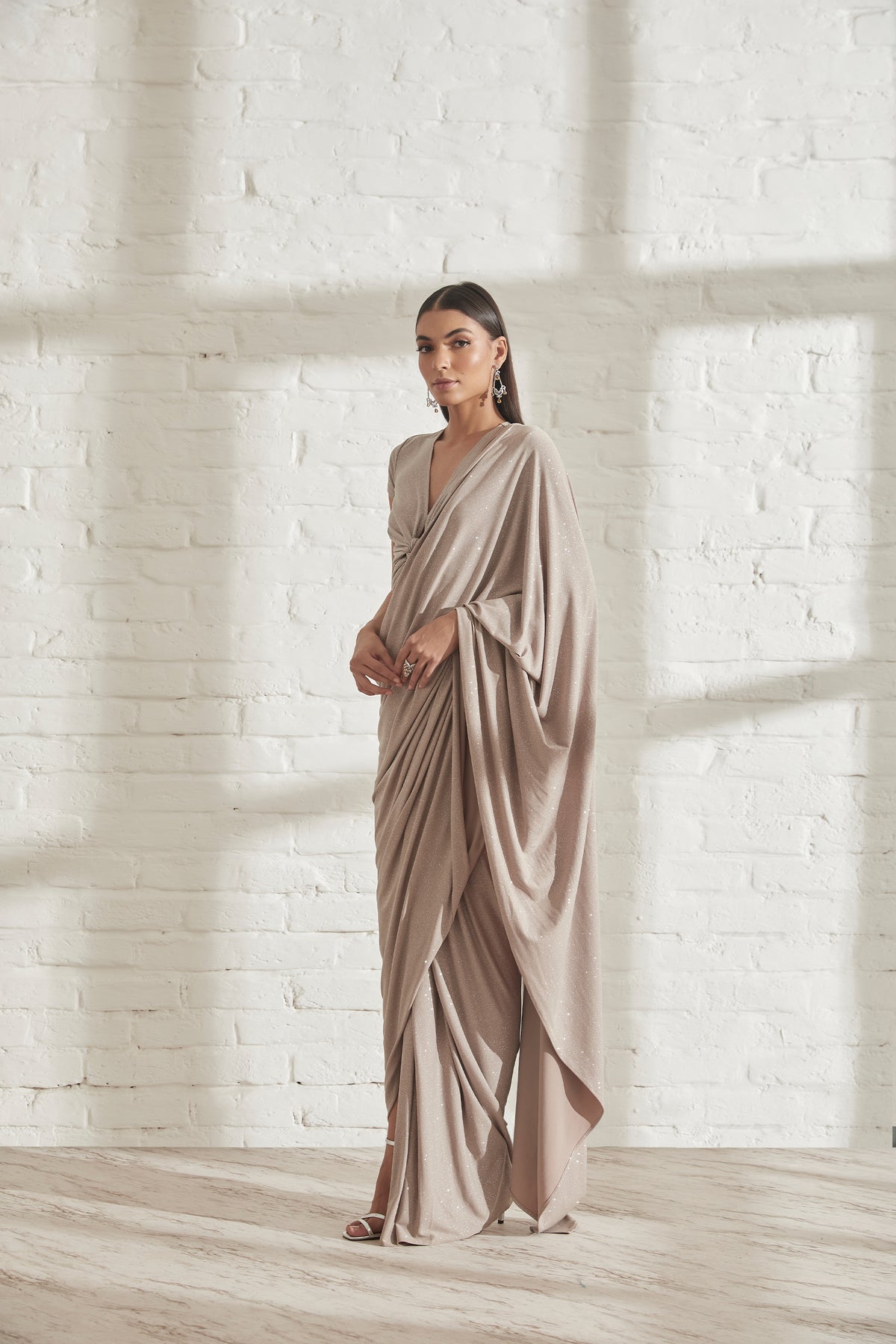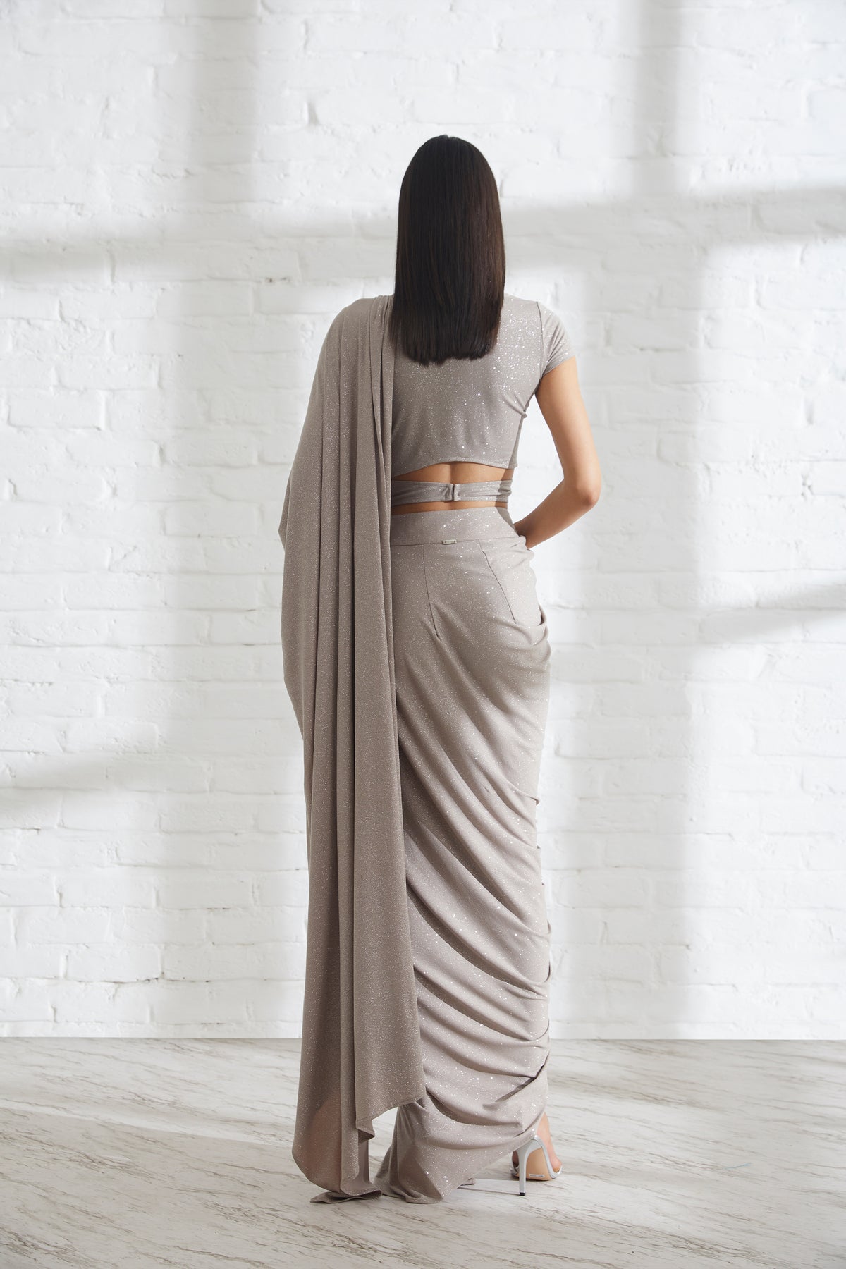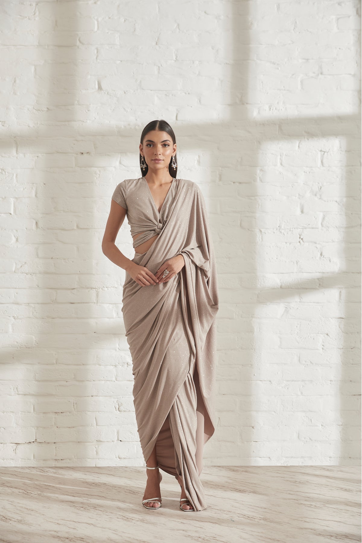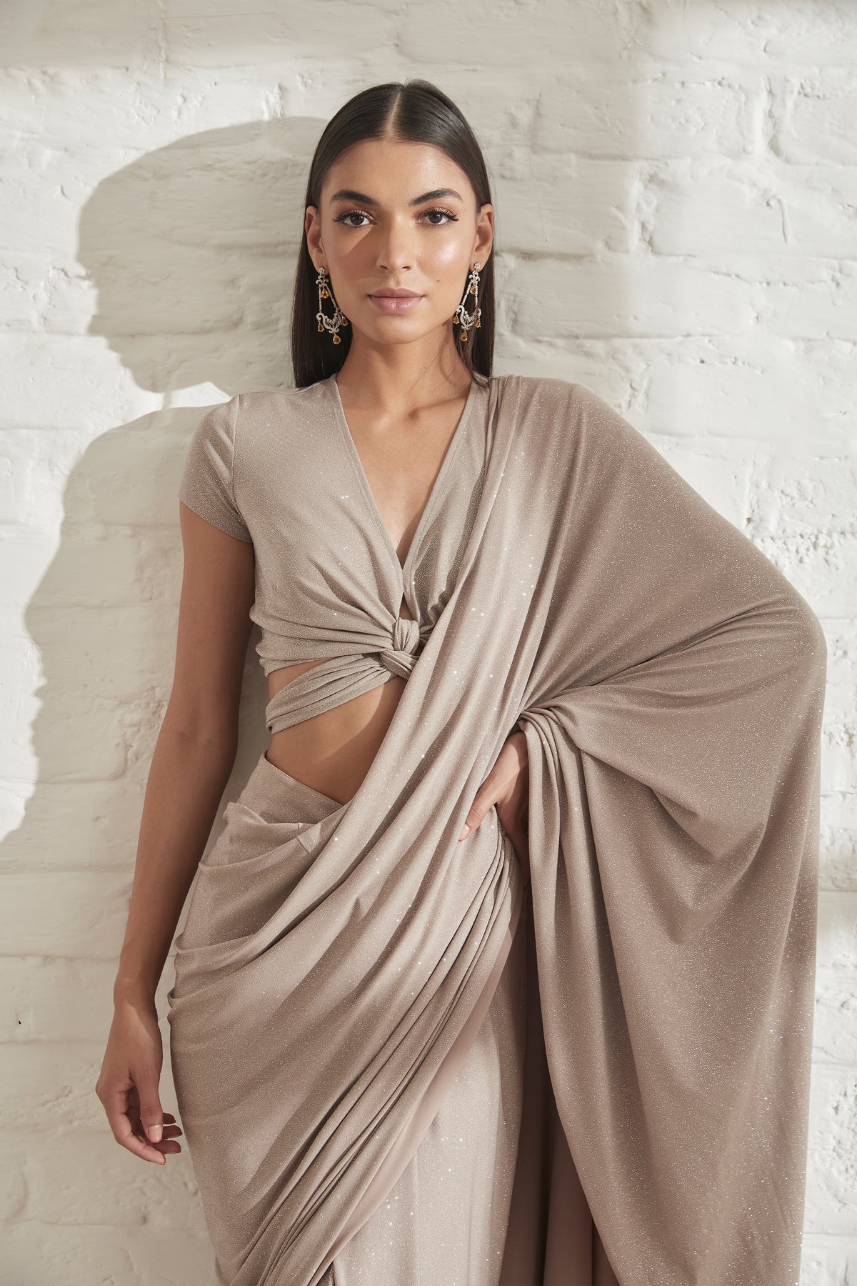 Our star jersey sari made in slinky jersey drapes the best as a sari and frames the body in the right way. Pair it with the twisted knot top that further closes at the back to give an interesting waist detail