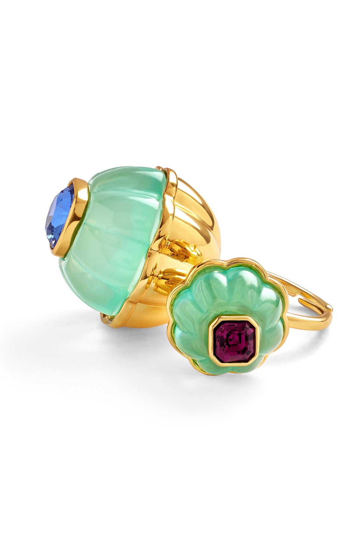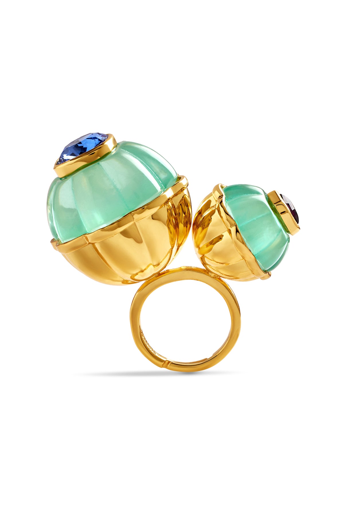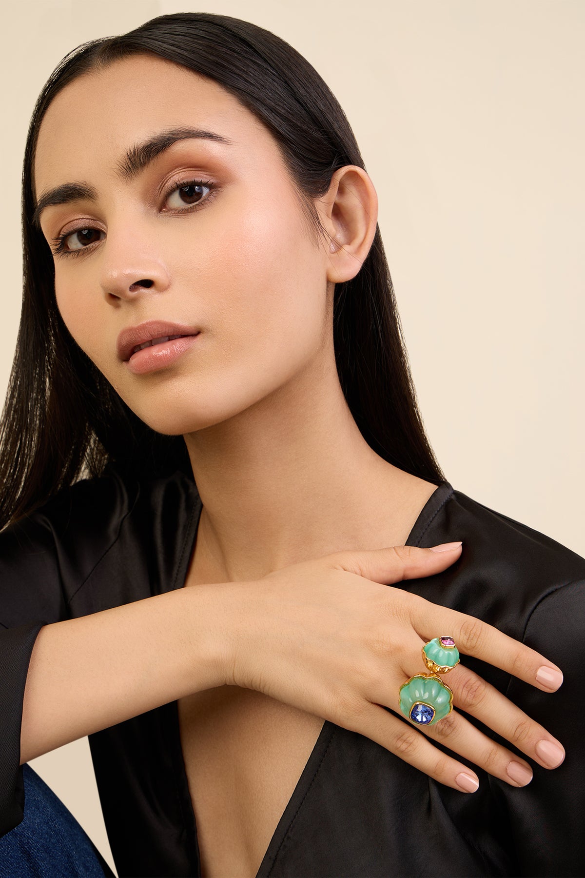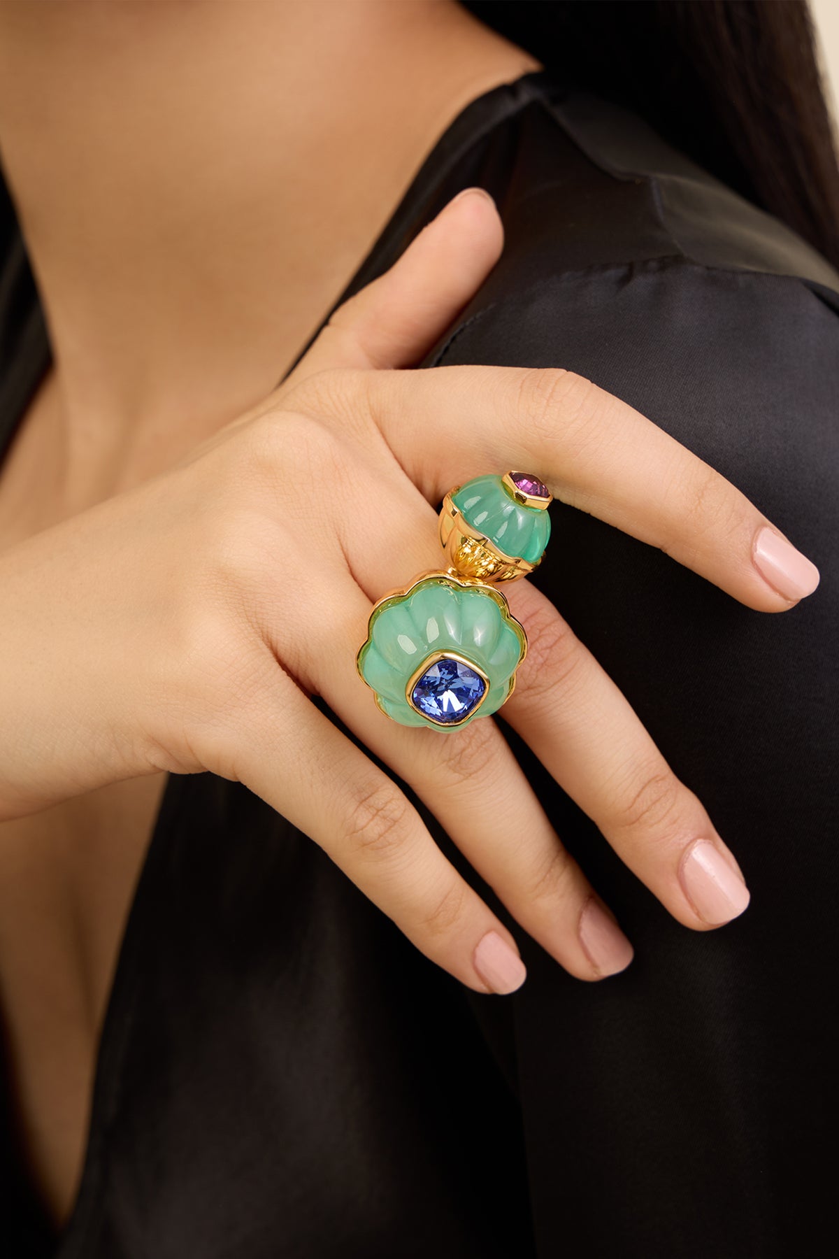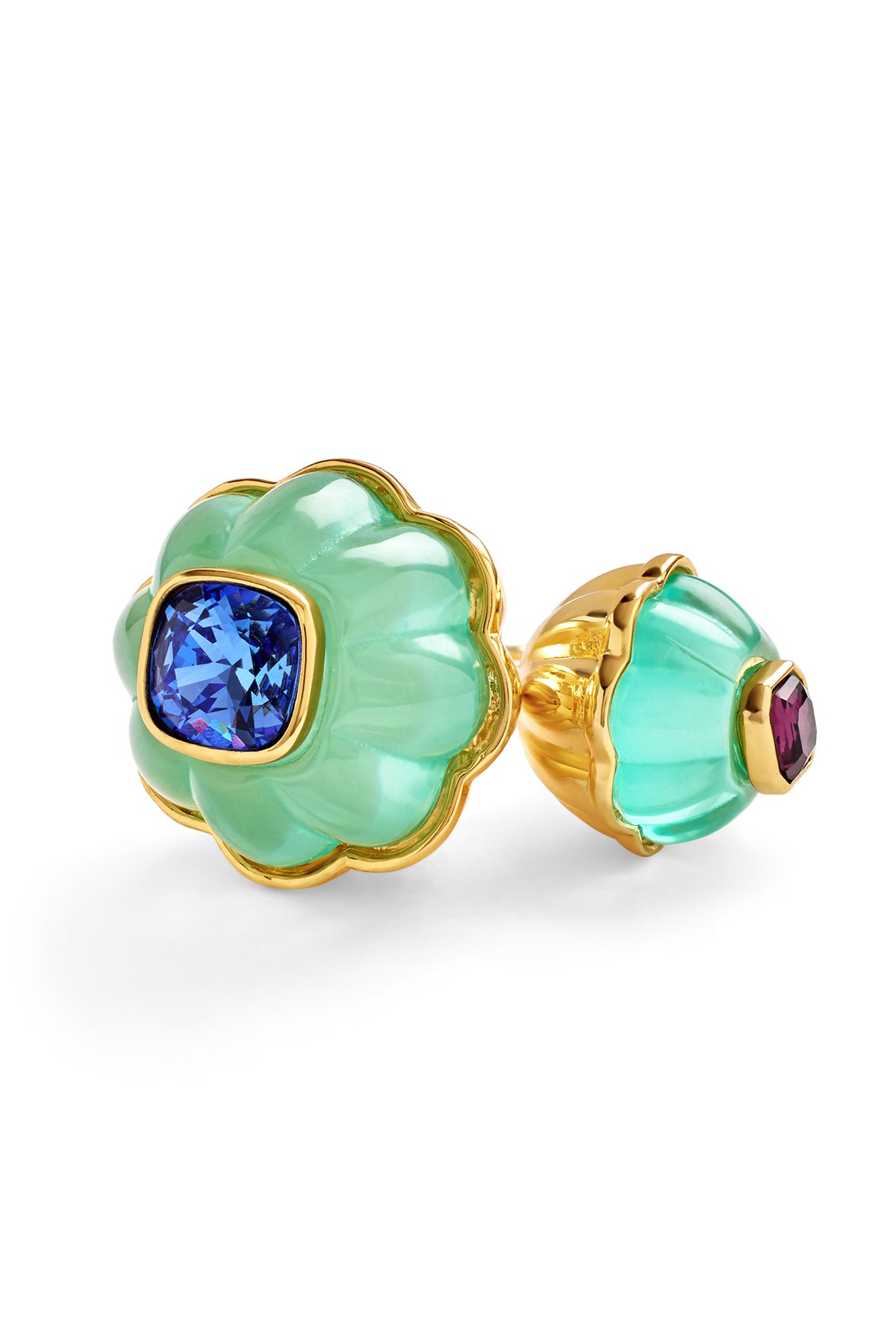 Expertly crafted and stunningly designed, our blue melon statement ring is the perfect addition to your jewelry collection. This ring features a mesmerizing blue and purple crystal set in 18-karat gold plating, providing a touch of elegance and sophistication to any outfit. Upgrade your style with this eye-catching piece