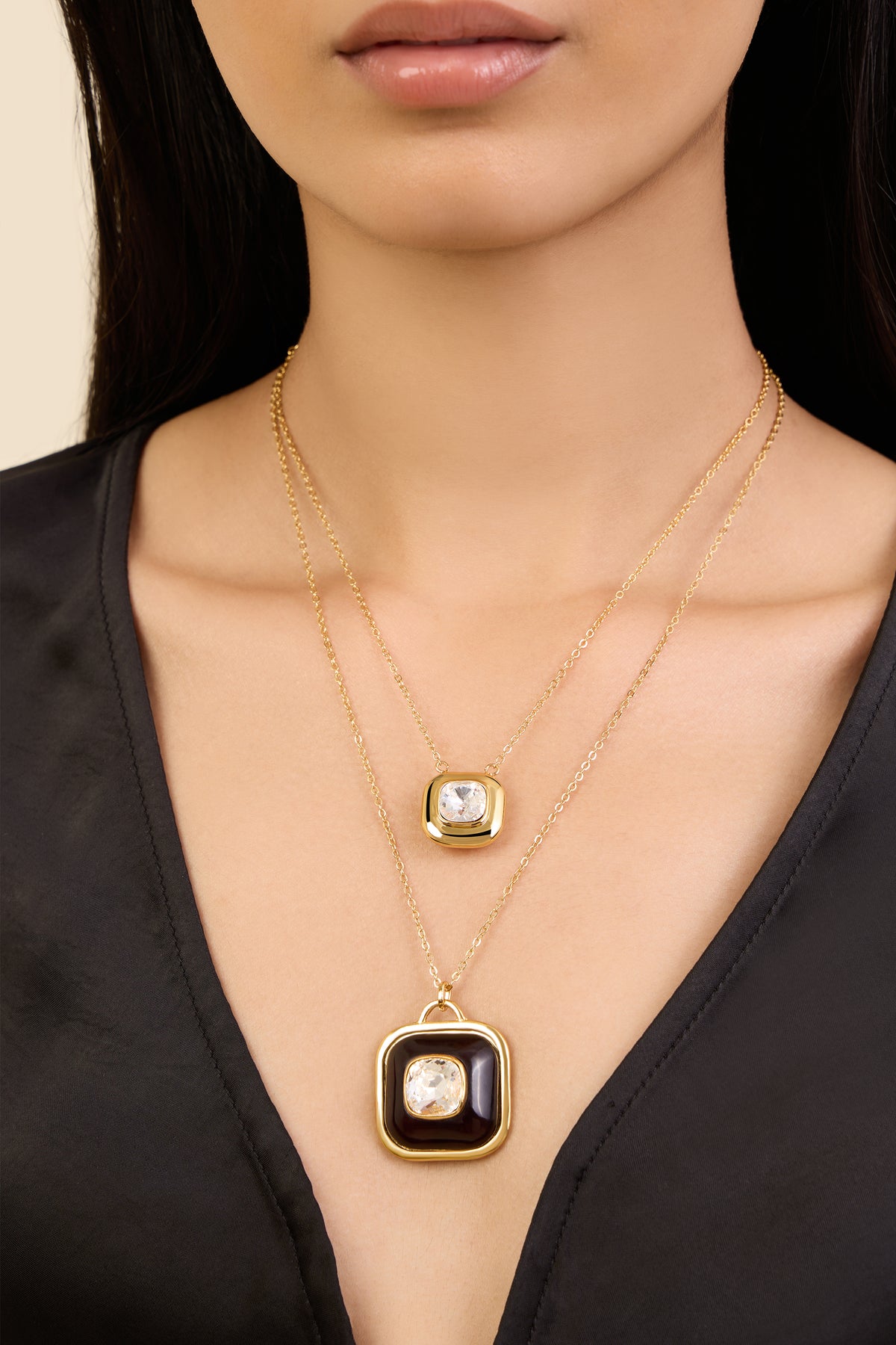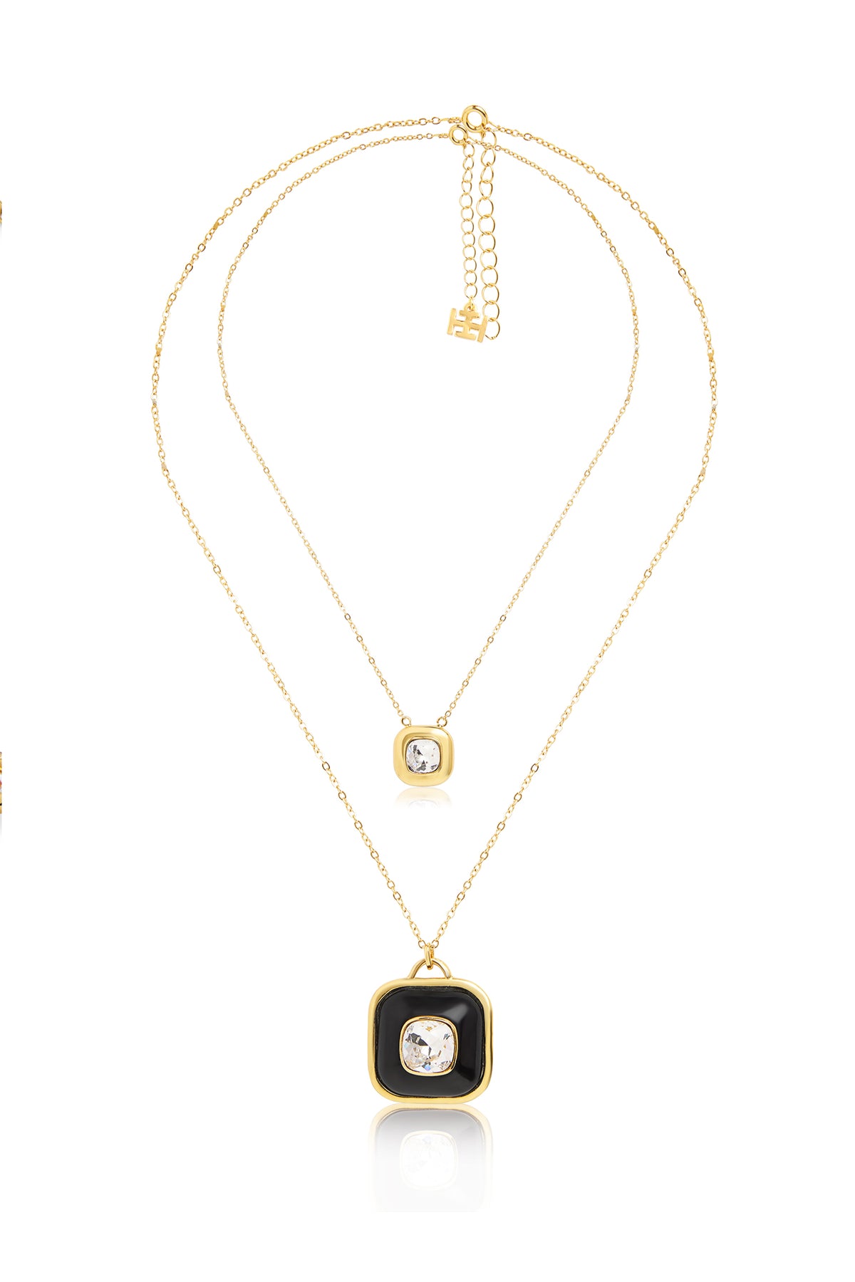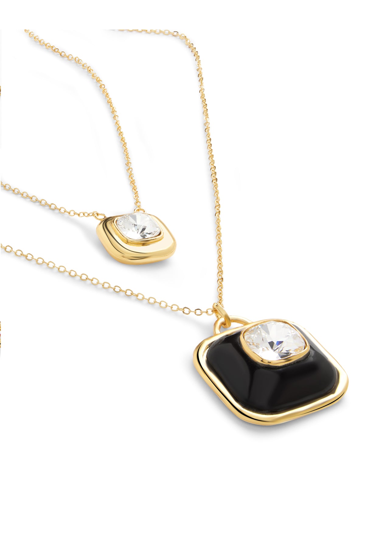 This layered medallion necklace features a striking black crystal pendant and is elegantly plated with 18-karat gold. The layered design adds dimension and glamour to any outfit, making it a versatile accessory for any occasion. The black crystal provides a touch of sophistication, while the gold plating adds a touch of luxury. Elevate your style with this exquisite necklace.