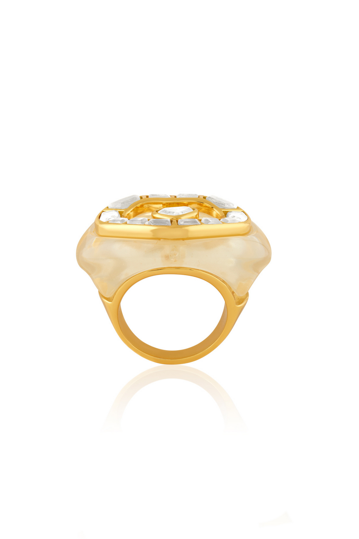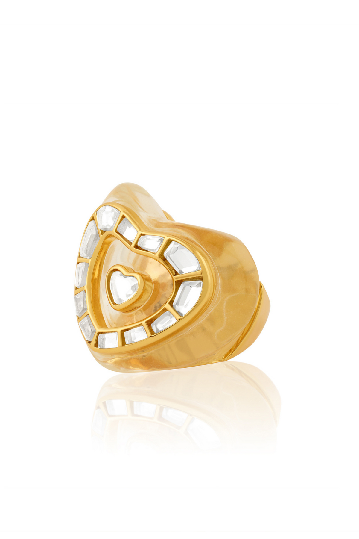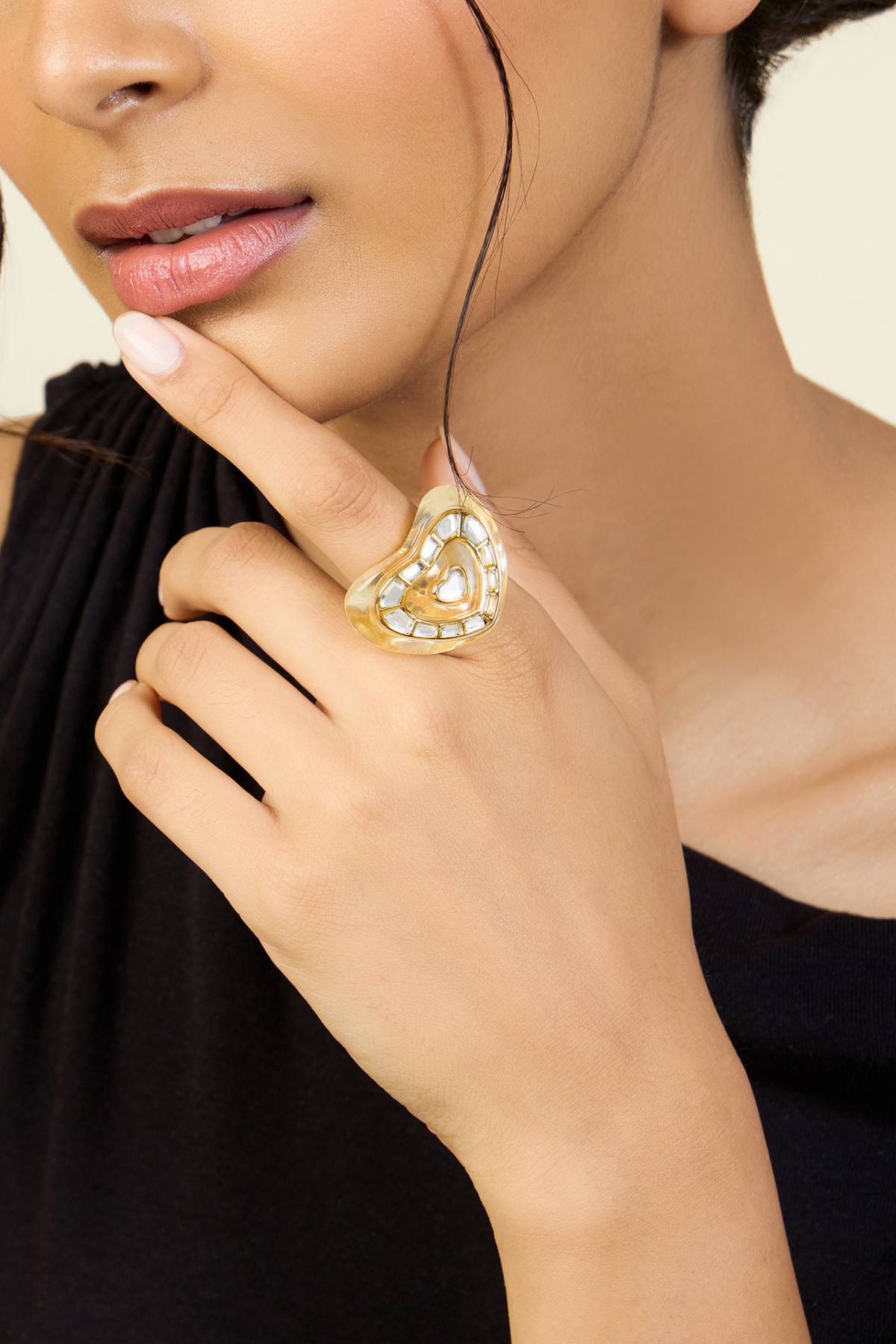 This Love Mirrors Bombe Ring features a unique design with gold plating and e-coating for added durability. The cocktail ring is made with brass and adorned with a gold resin and mirror, creating a striking and elegant accessory for the festive season.