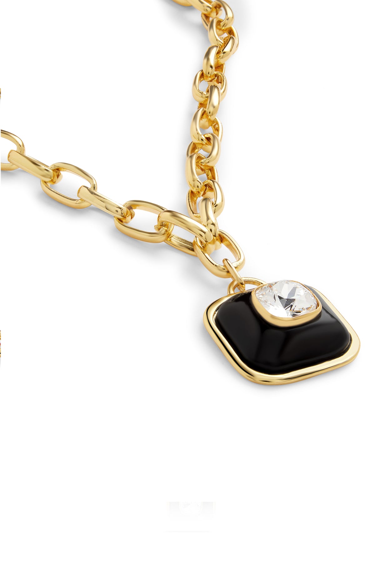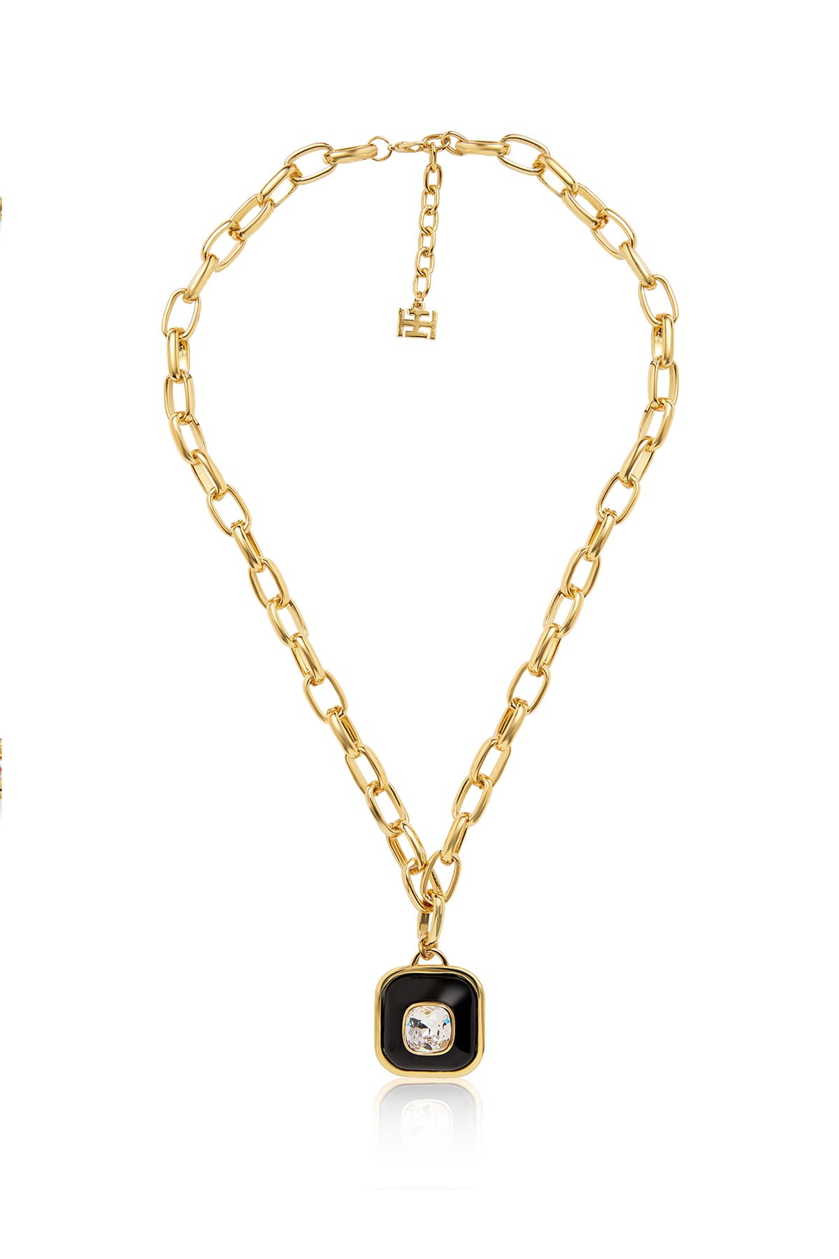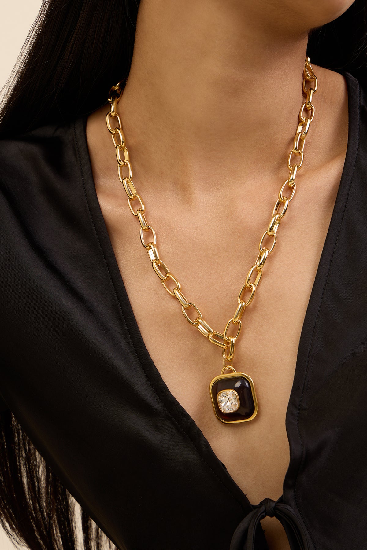 Introducing our elegant medallion chain link necklace. This stunning piece features a sleek black crystal and is plated with 18-karat gold for a touch of luxury. Its unique chain link design exudes sophistication and will elevate any outfit. A must-have accessory for the modern woman.
