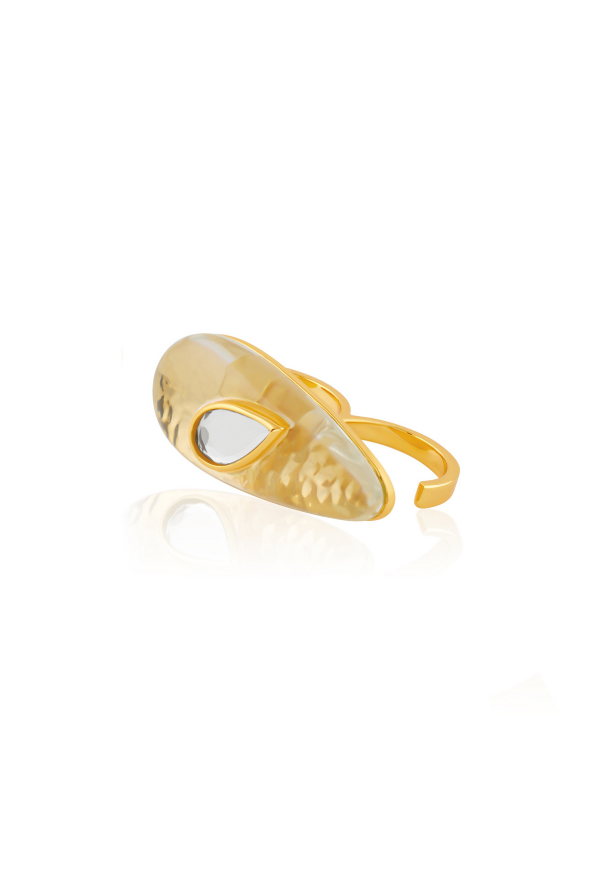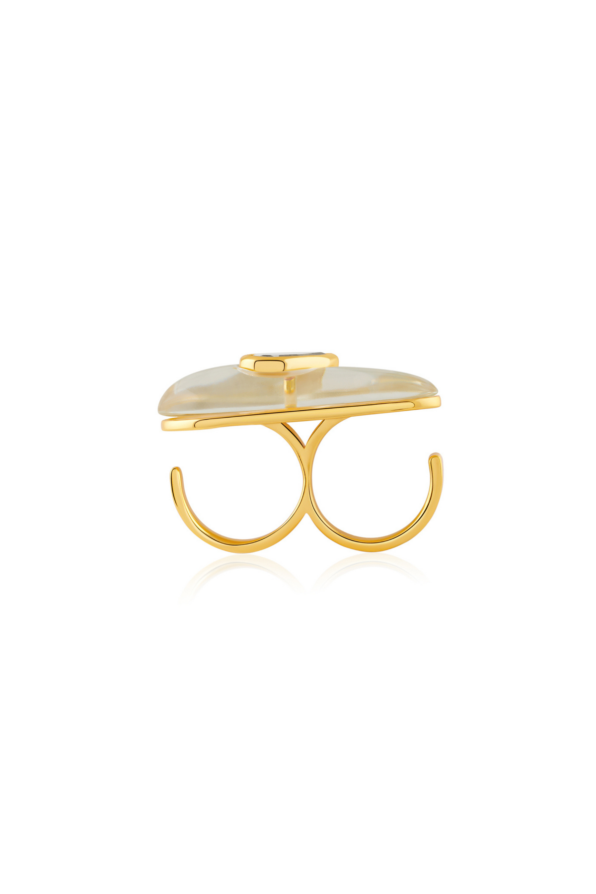 Expertly crafted with gold plating and e-coating, the Noor Two Finger Ring makes a bold statement. Its unique design features a two finger ring with a stunning gold finish, adorned with resin and a mirrored brass accent. Elevate your festive style with this eye-catching accessory.