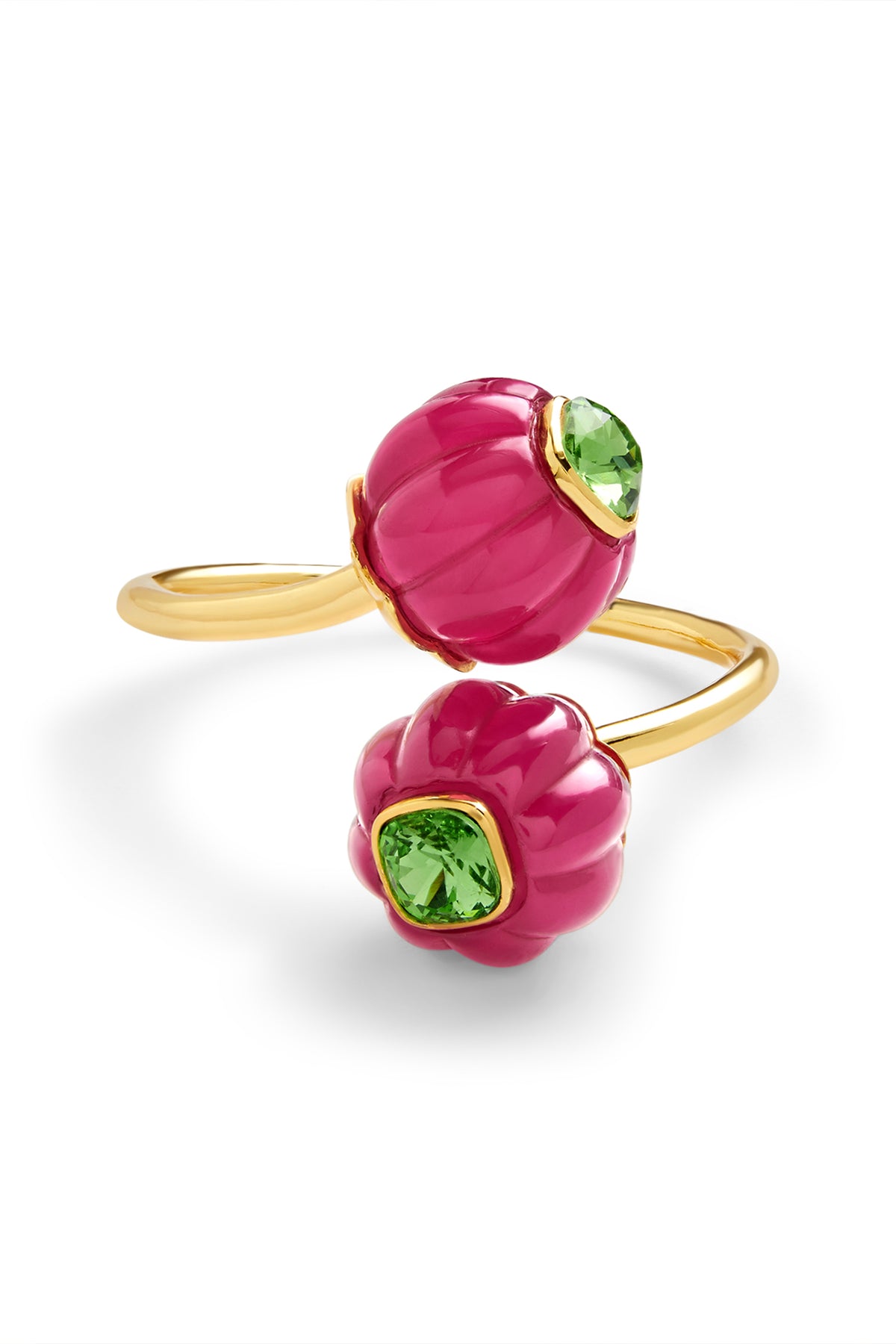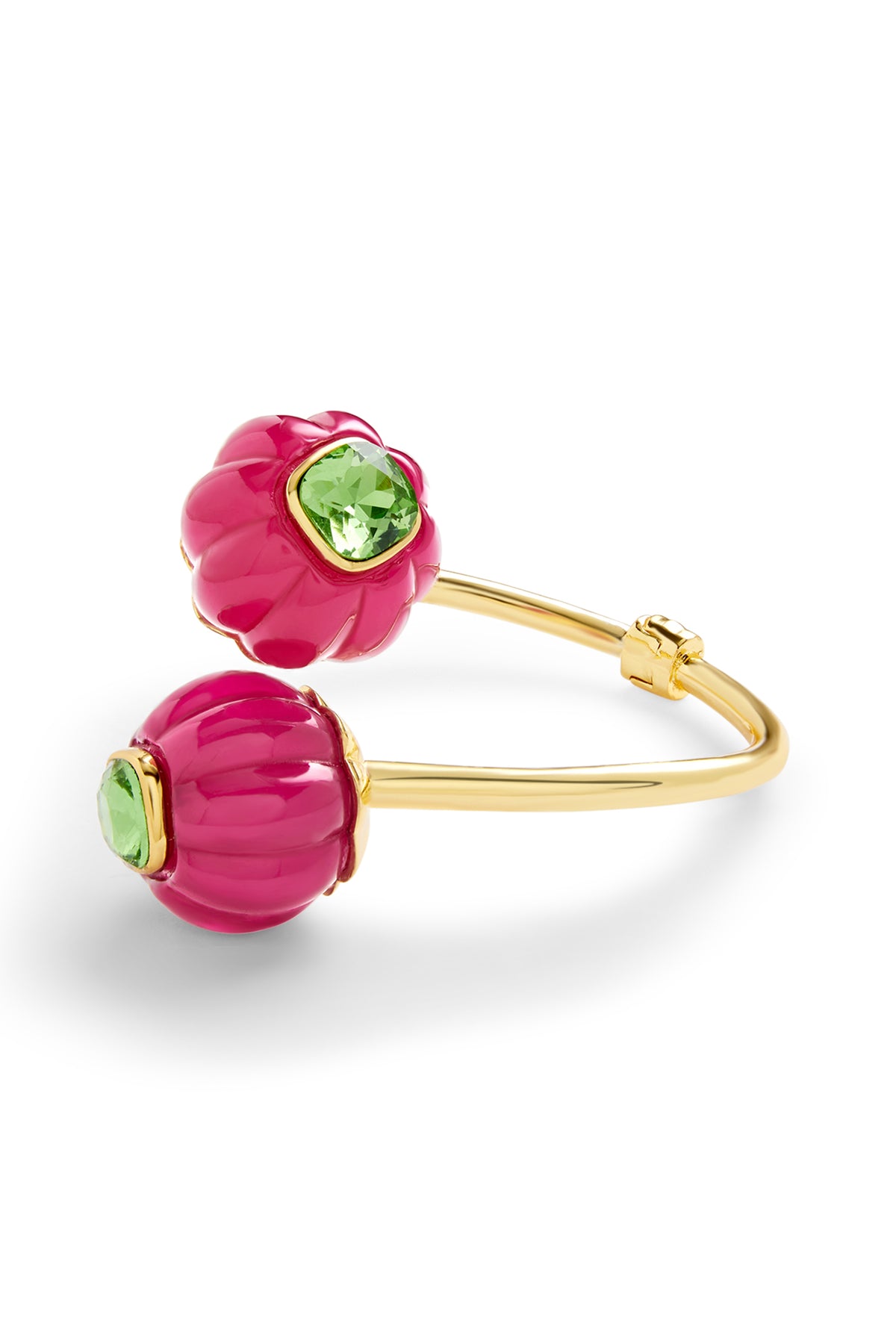 Experience elegance and luxury with our pink & aqua open cuff. Made with pink crystals and 18-karat gold plating, this cuff is a chic addition to any outfit. Its open design allows for a comfortable fit while adding a touch of sophistication. Elevate your style with this exclusive piece.