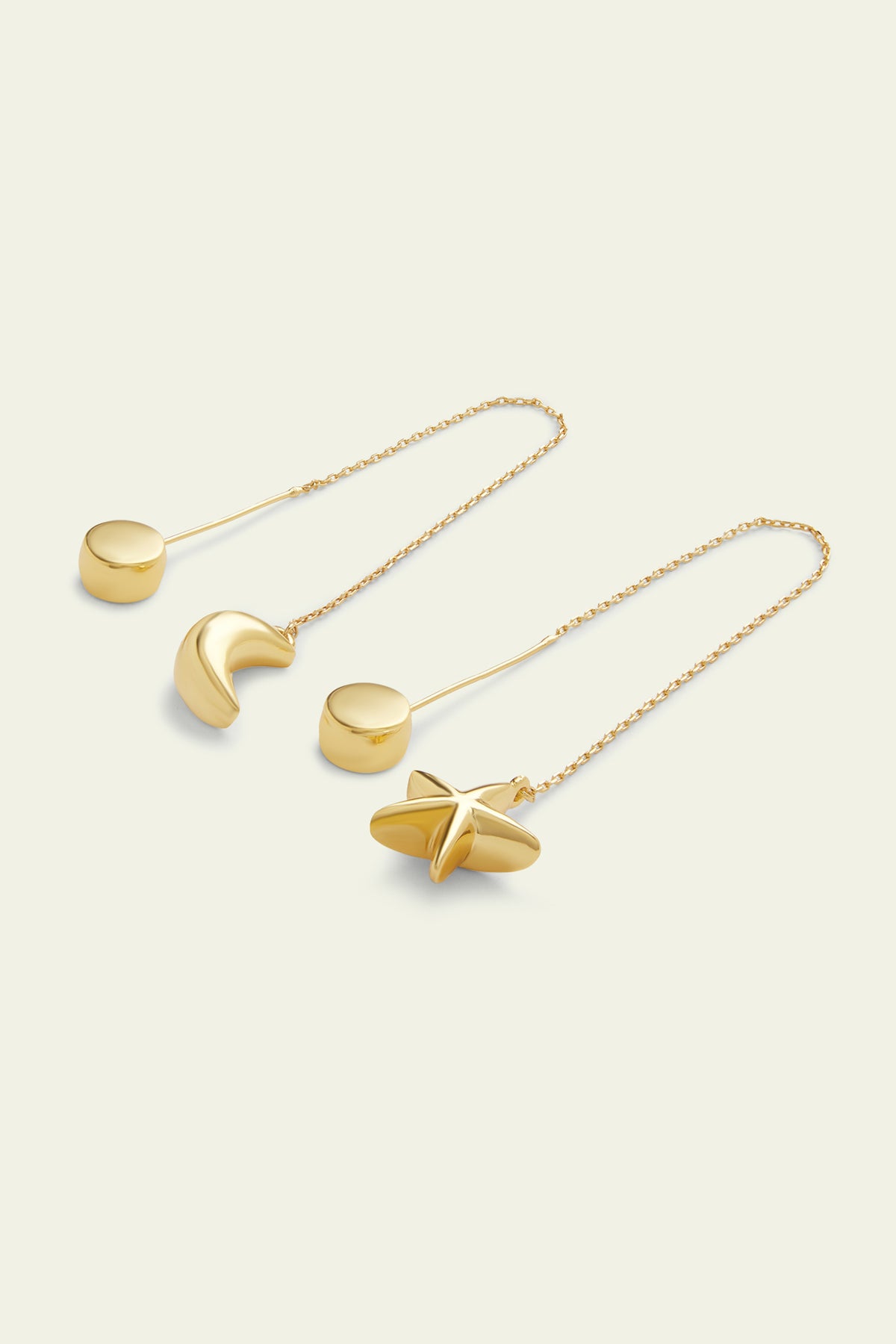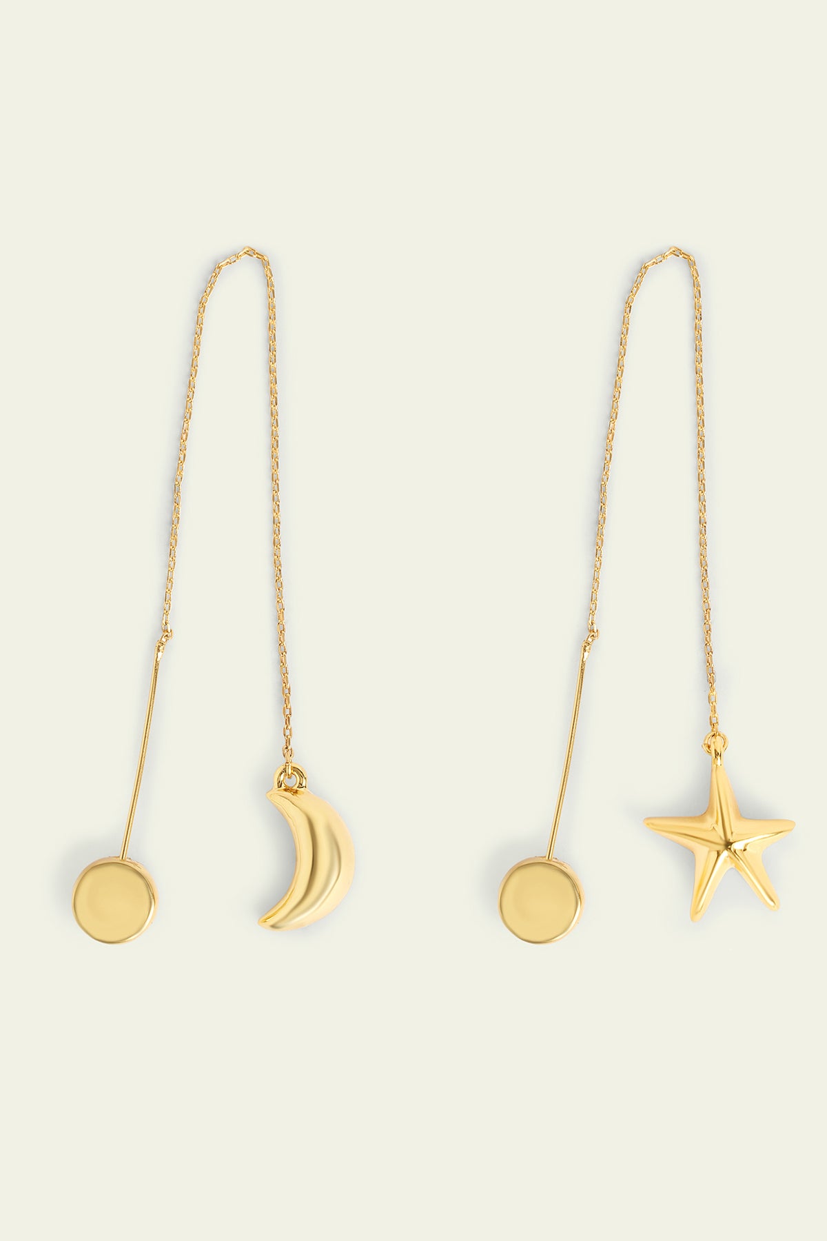 Take risks and stand out with our star & moon mismatched threader earrings. These drop earrings are plated in 18-karat gold and perfect for everyday wear or party wear. Embrace adventure with these bold and versatile earrings.