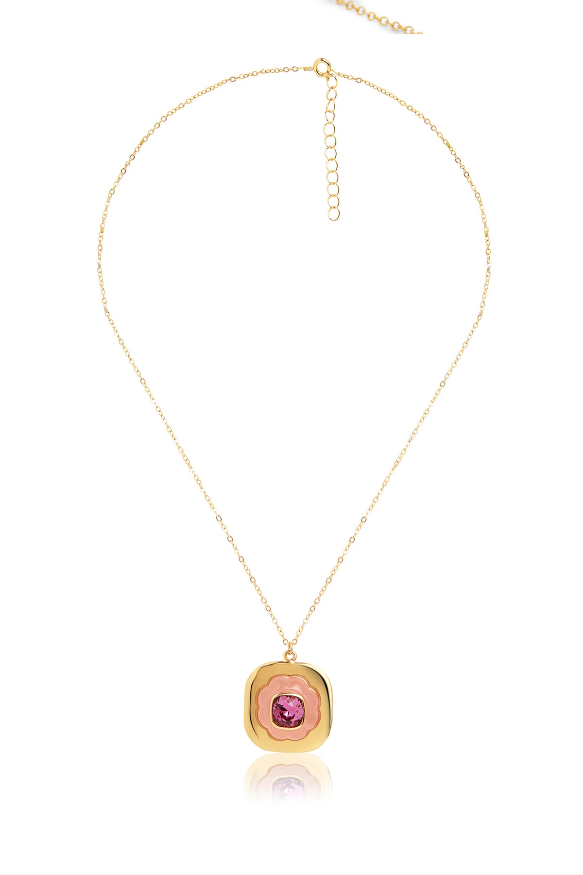 Elevate your style with our think pink pendant necklace. Made with stunning pink crystals and 18-karat gold plating, this necklace adds a touch of elegance to any outfit. The perfect accessory for any fashion-forward individual looking to make a statement.