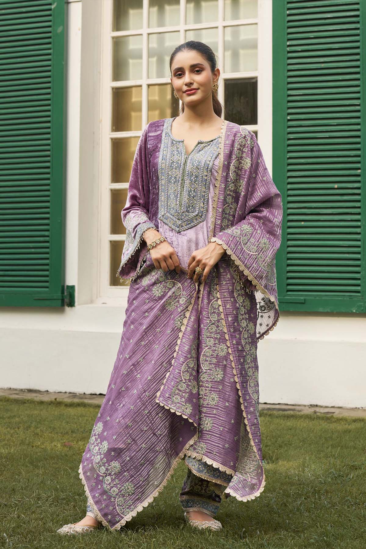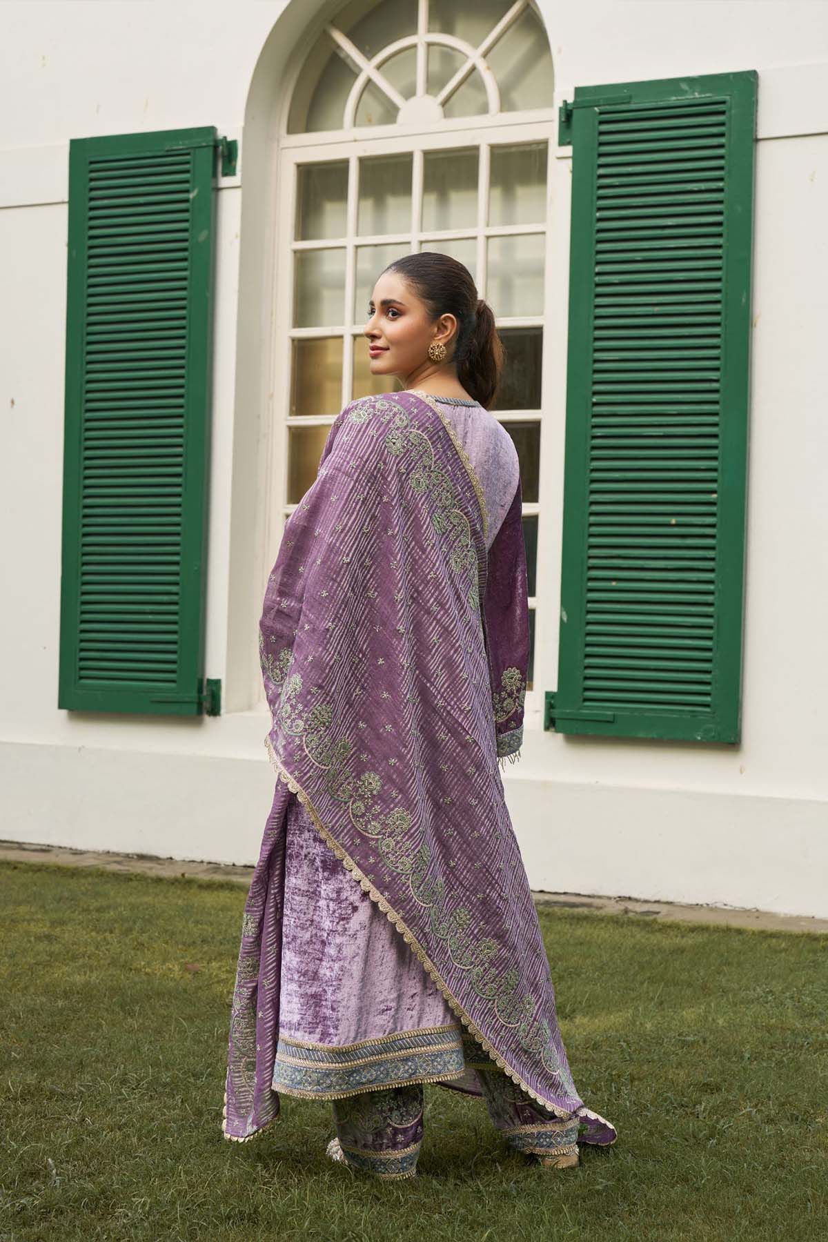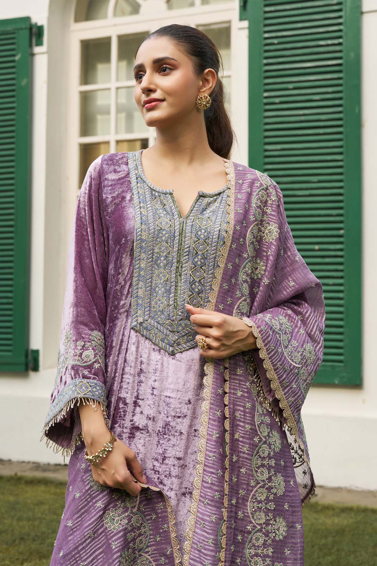 Soft lavender velvet reimagined in a straight-cut kurta set, paired with coordinated pants and a banarasi stripe pani gold dupatta. A subtle interplay of sheen and tradition-perfect for day weddings and festive dinners.