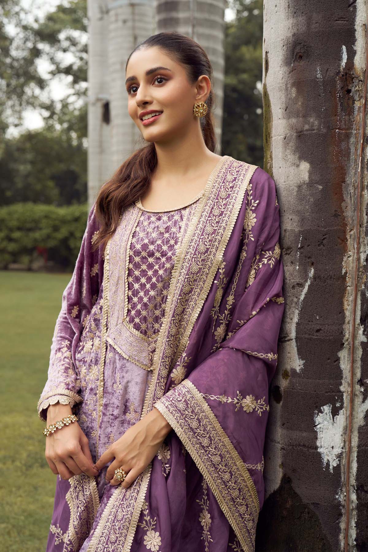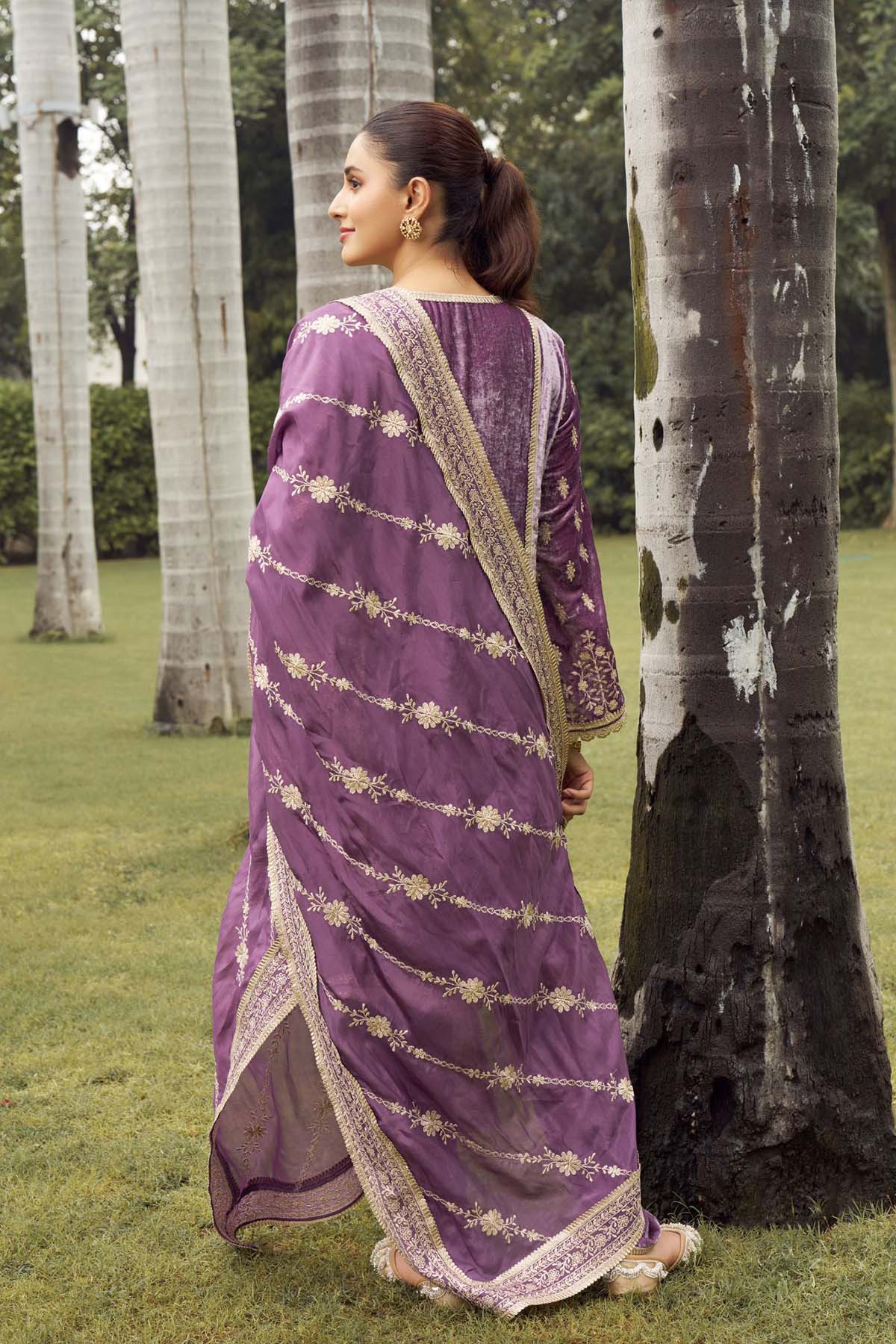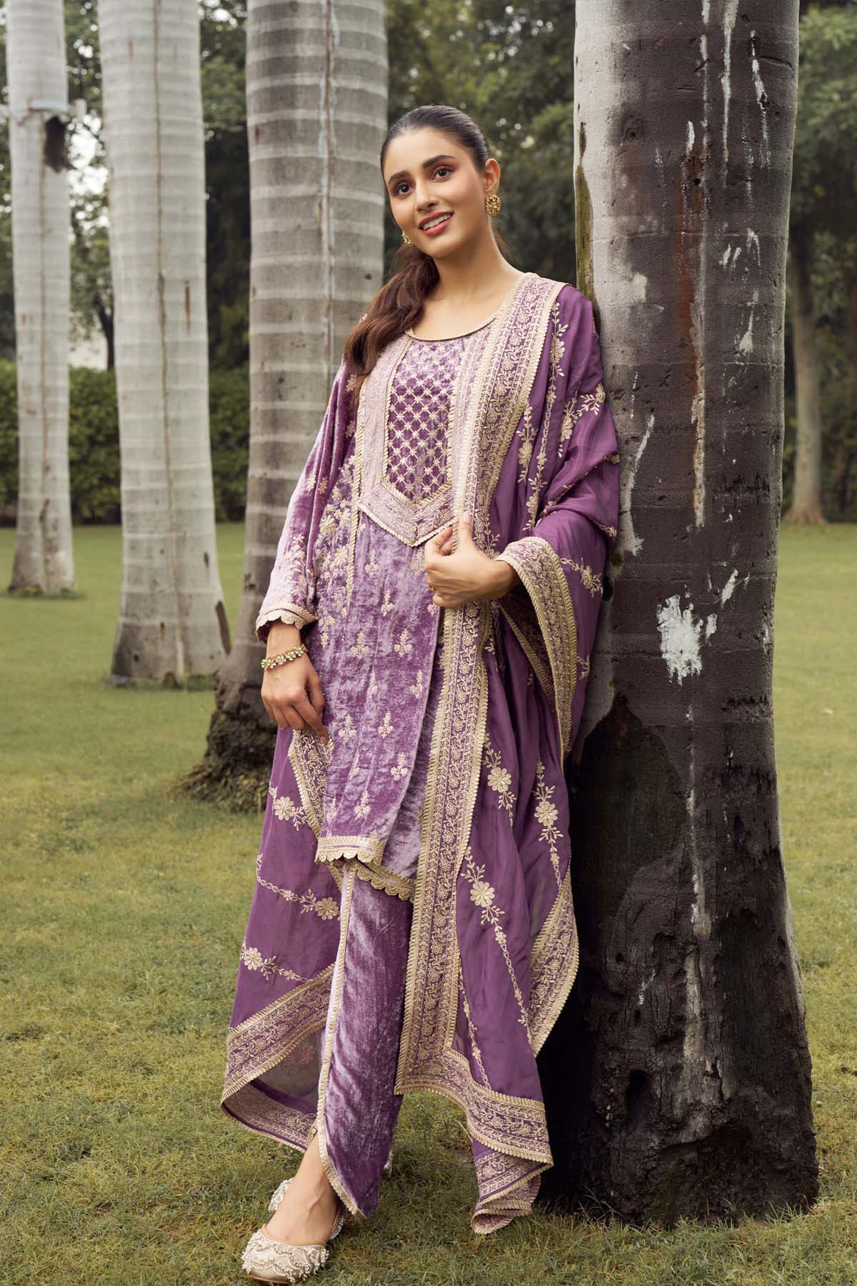A lavender velvet dhoti-kurta set with delicate banarasi detailing. The fluid drape of the dhoti pant and the shimmer of the banarasi stripe pani gold dupatta create a modern festive silhouette with old-world romance.