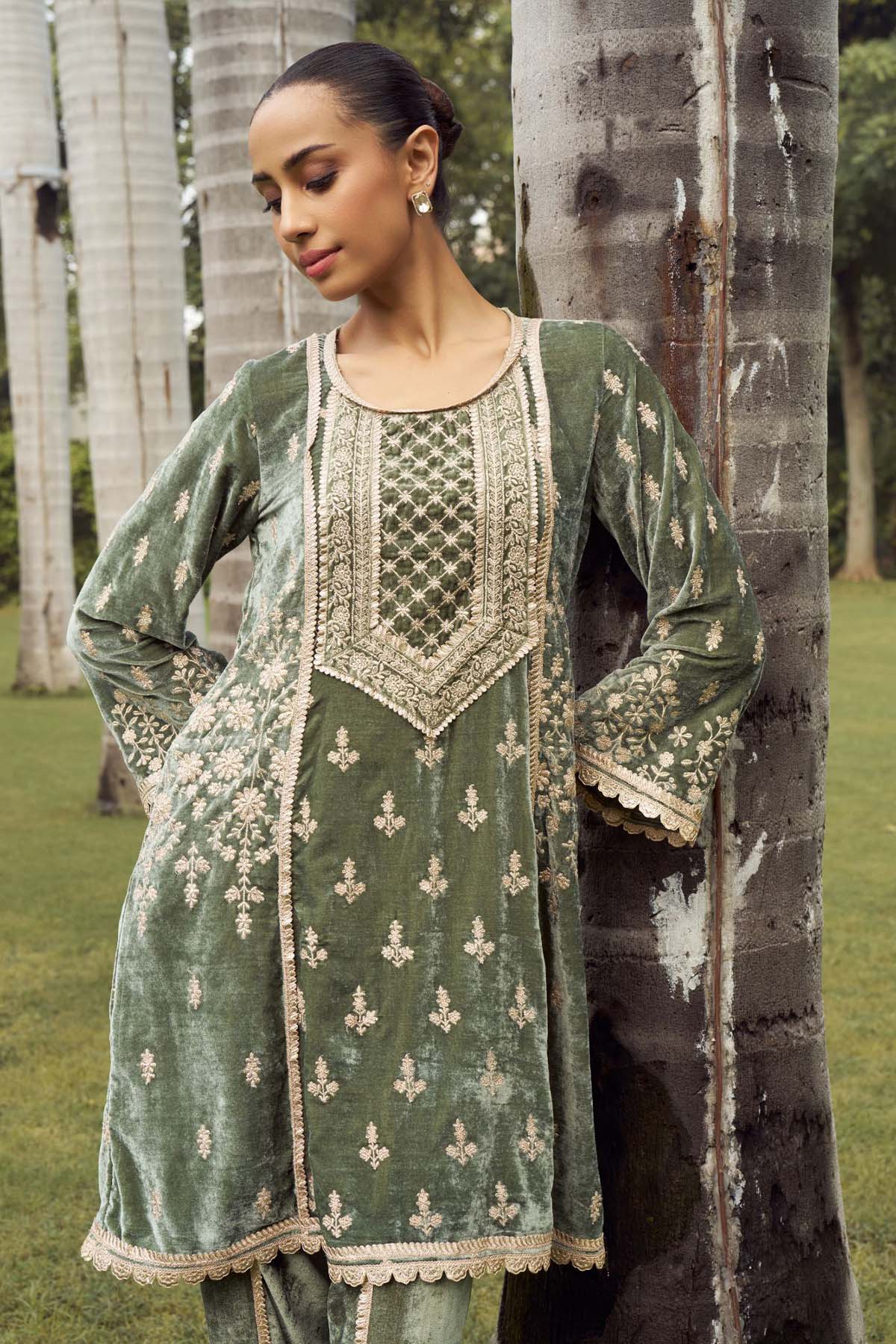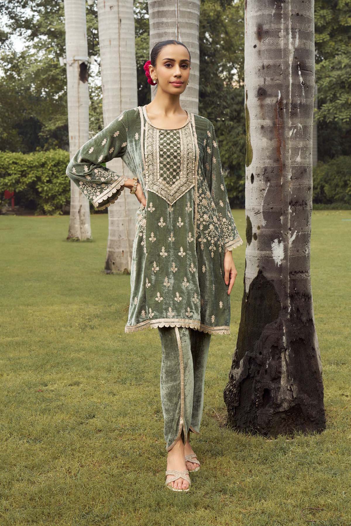 A timeless olive-green velvet dhoti-kurta set featuring intricate embroidery. A fresh, youthful take on classic festive dressing.