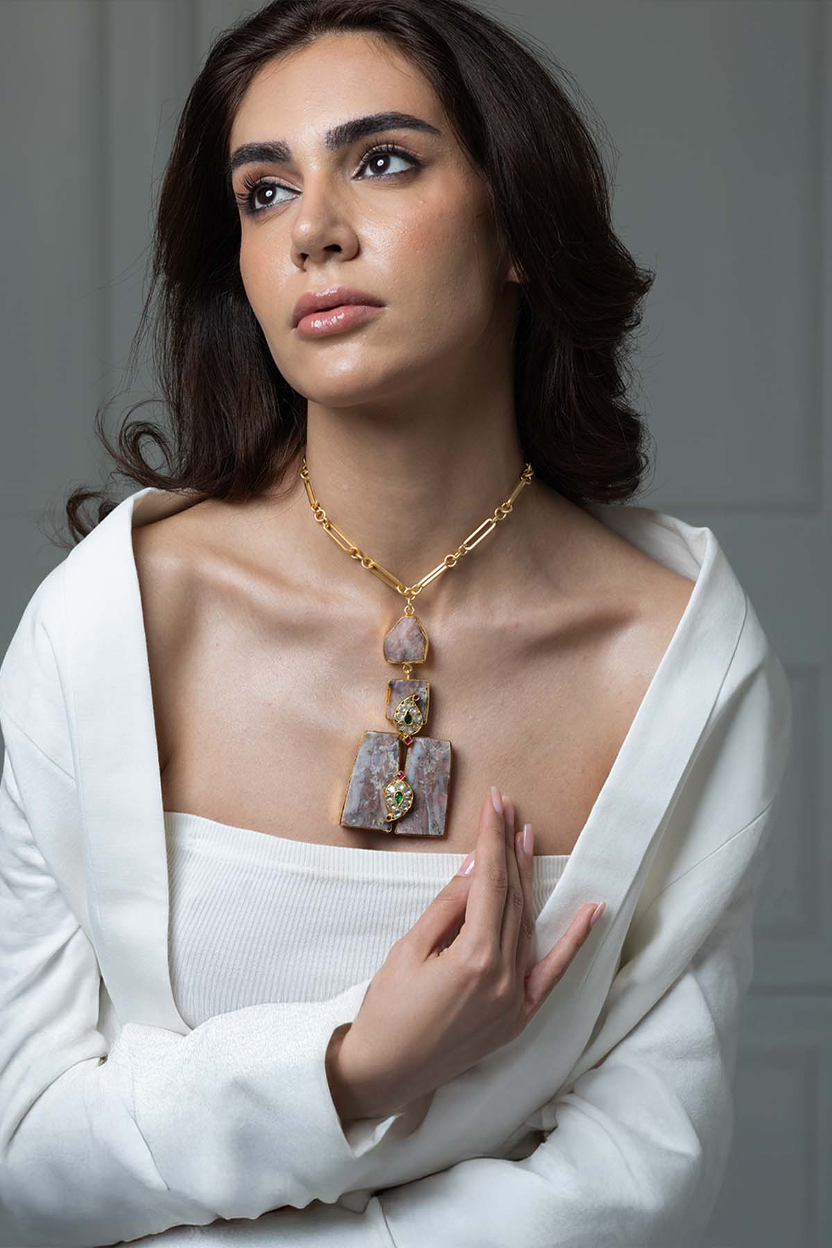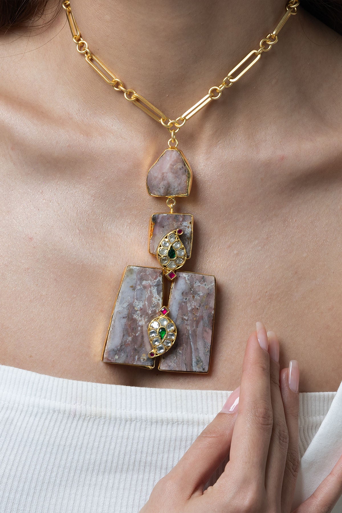 A stylish, eye-catching necklace having unique stones with a touch of green at the centre to grab attention. Its modern yet elegant design makes it perfect for parties, dinners, or everyday glam.