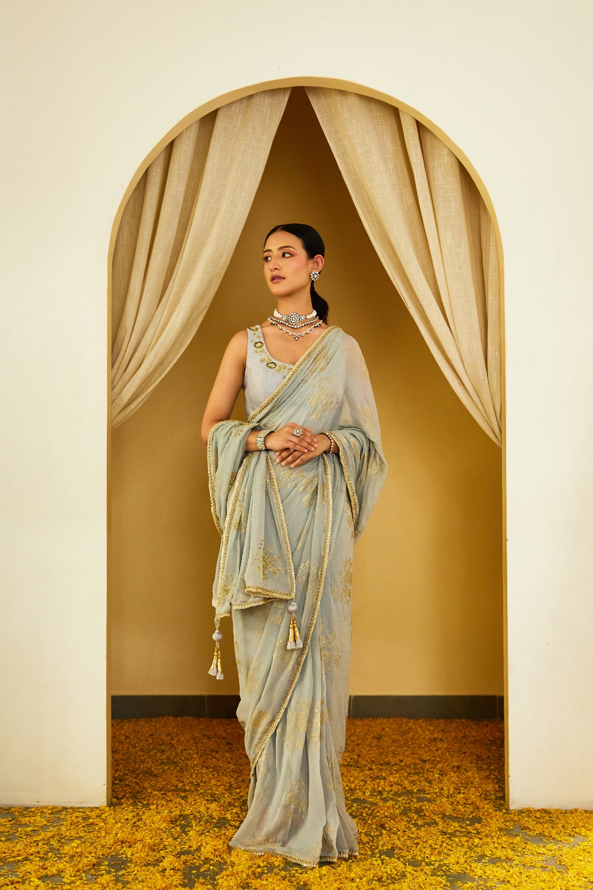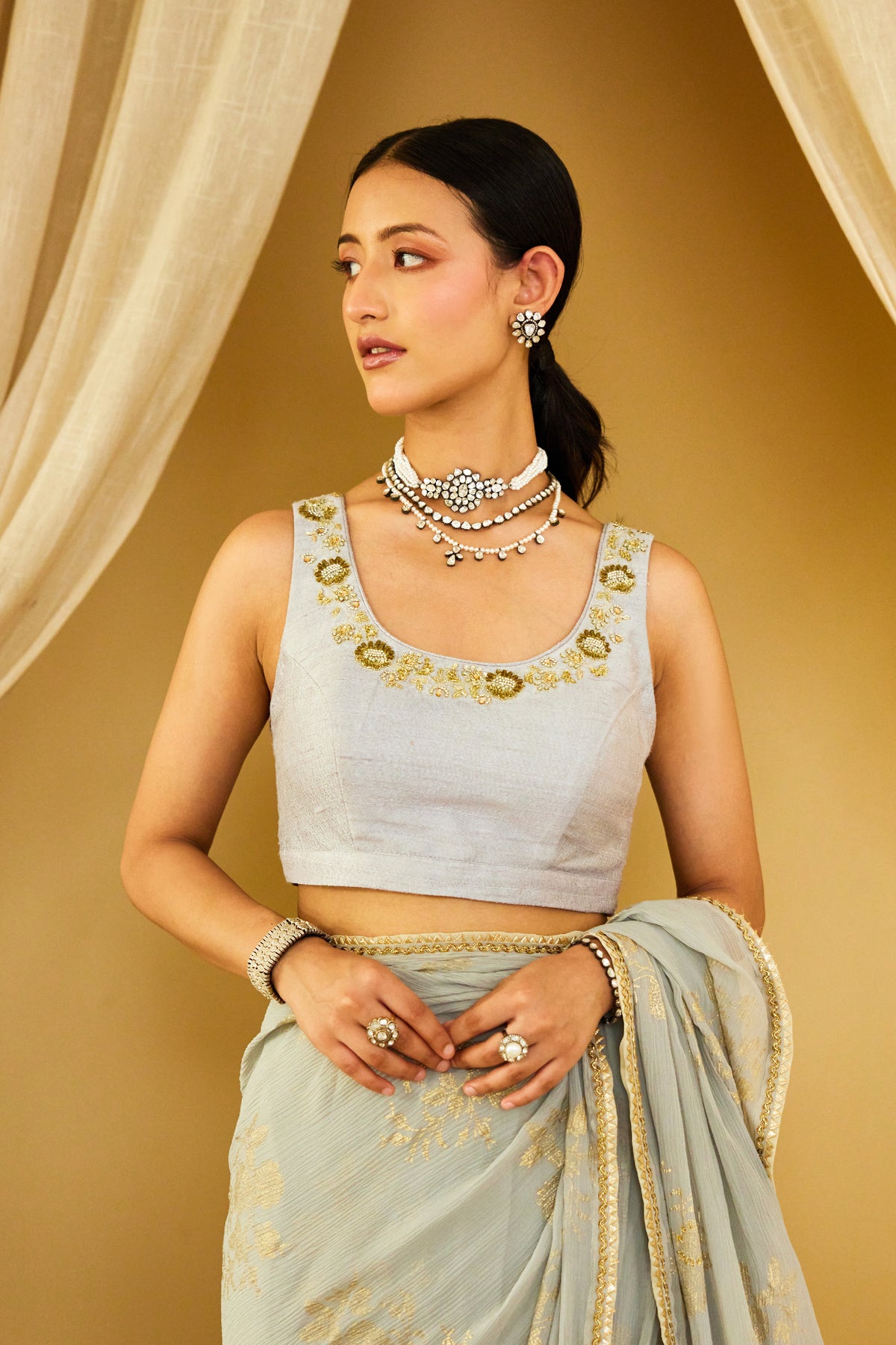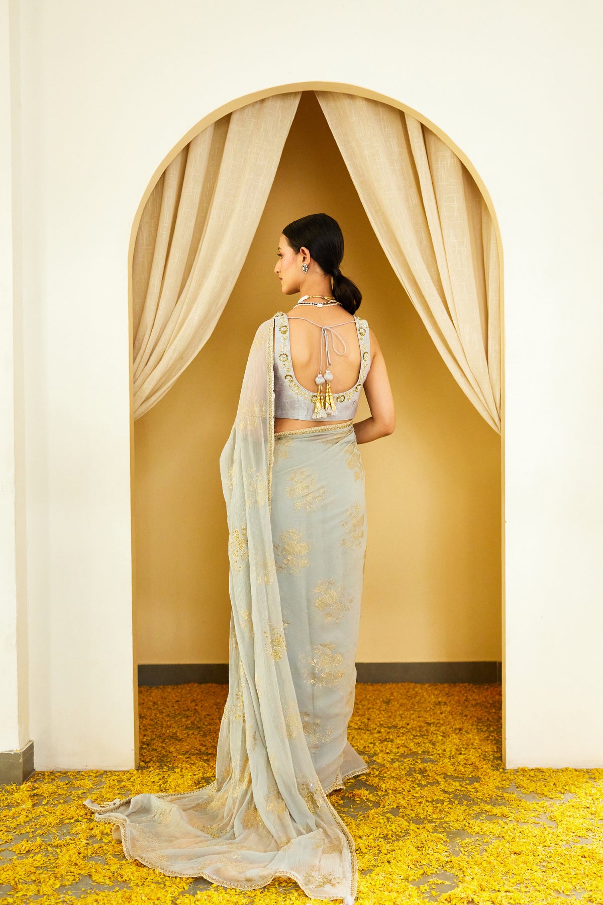 Grey foil pure silk chiffon saree with embroidered palla paired with grey pure raw silk dabka and sequins zardosi embroidered sleeveless blouse