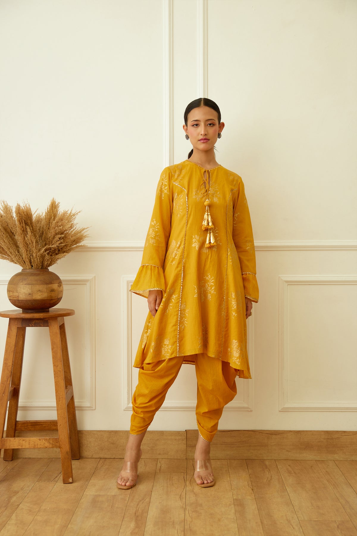 Ochre foil cotton silk with side godet kurta paired with cotton tulip dhoti