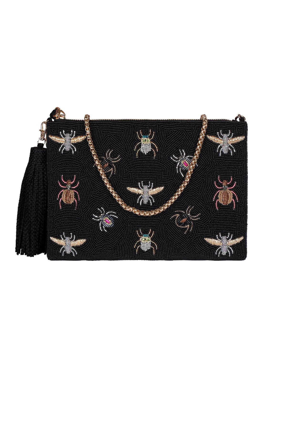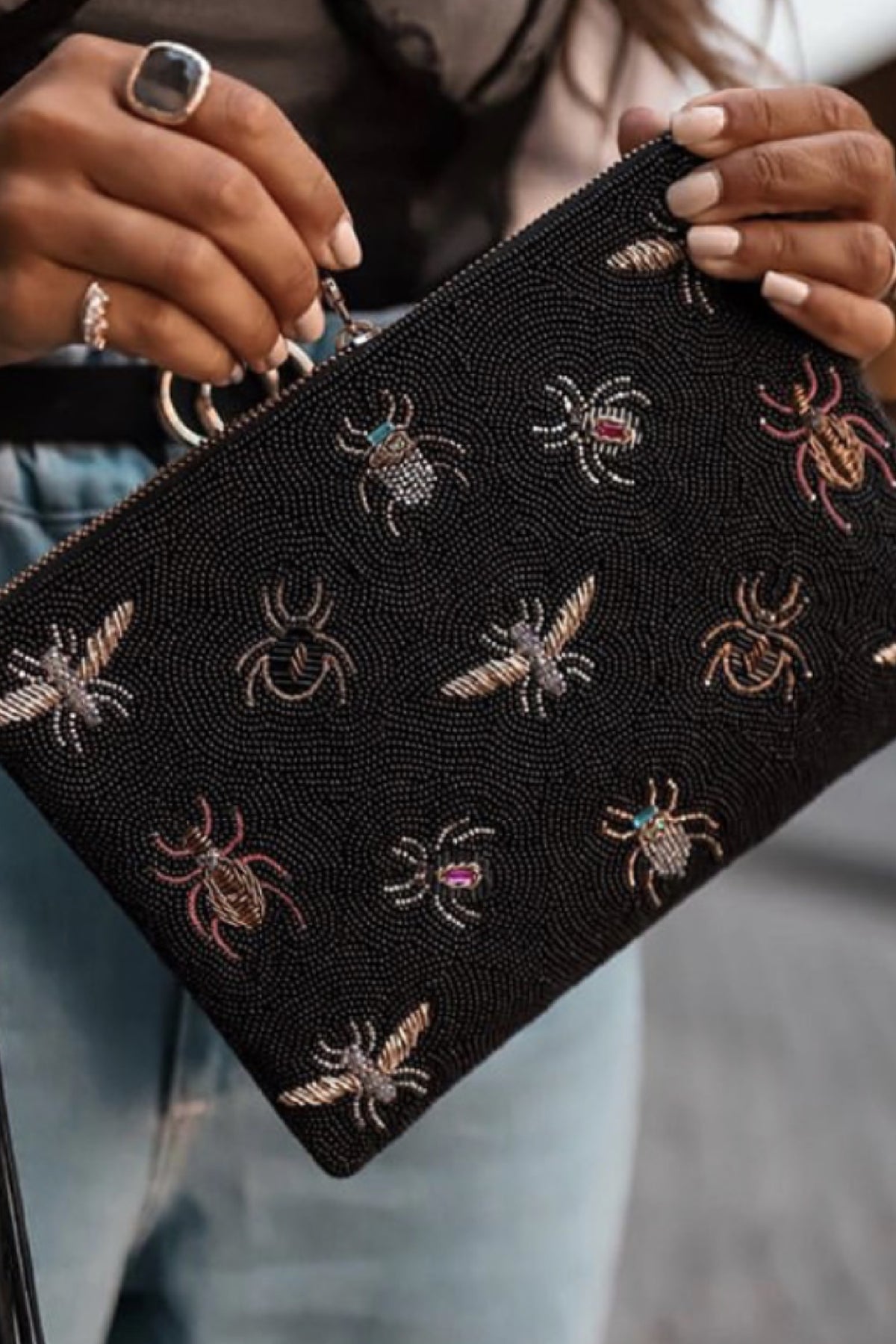 Stones: Hand embroidered eye patch at front in raffia and beads