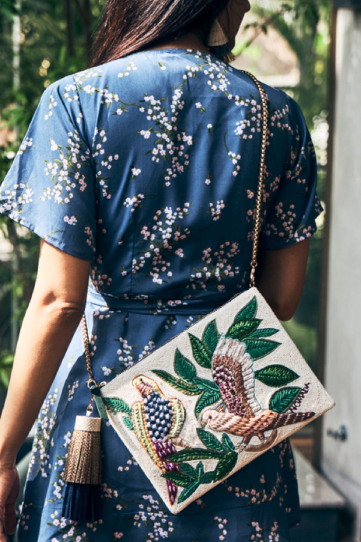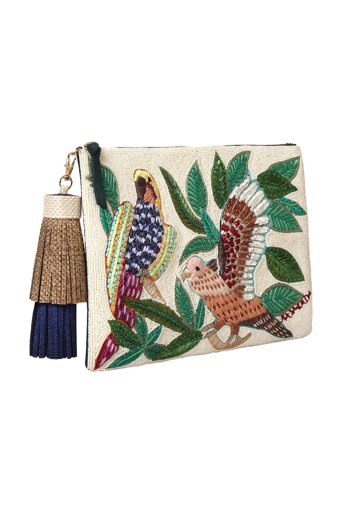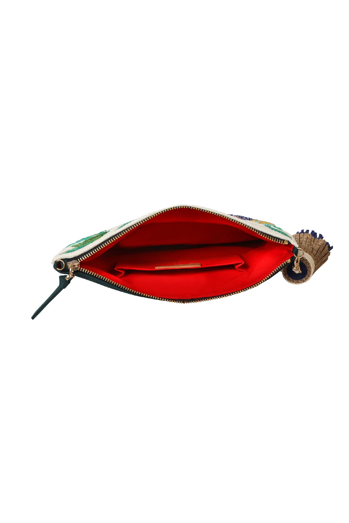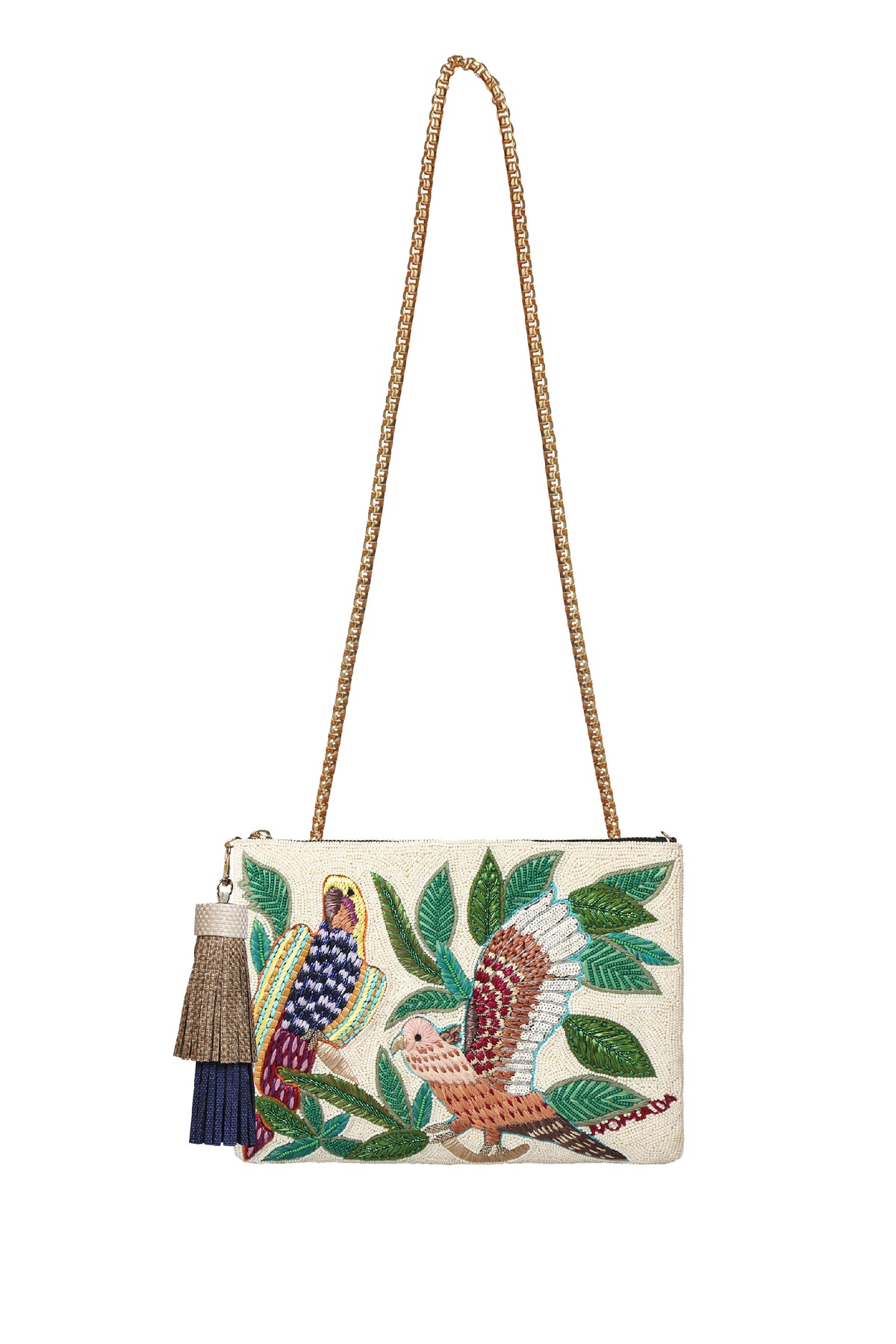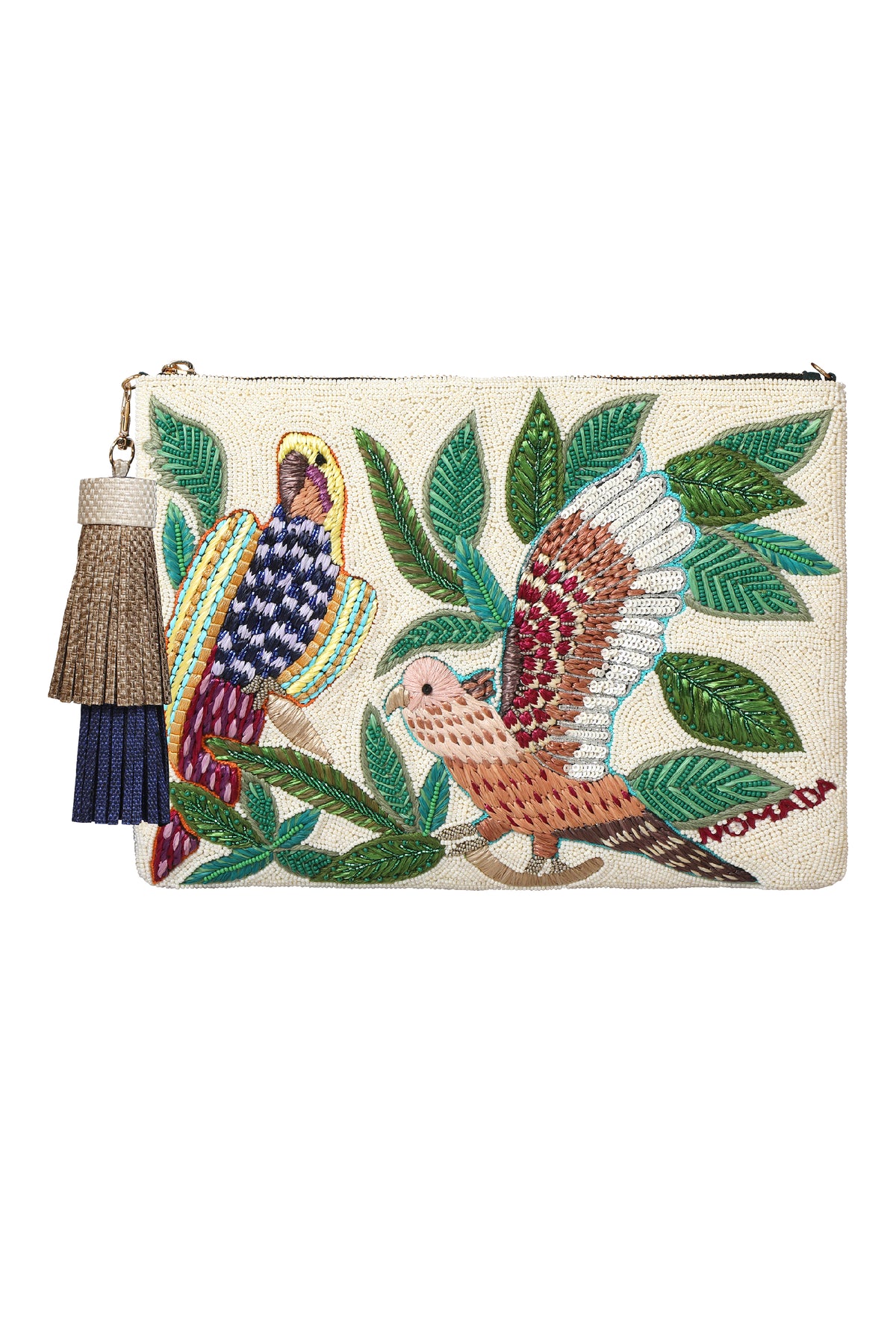 Stones: Hand embroidered eye patch at front in raffia and beads