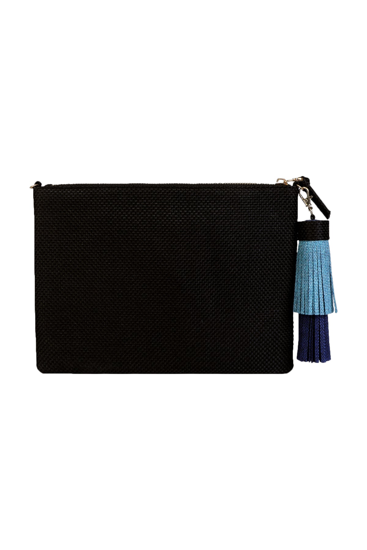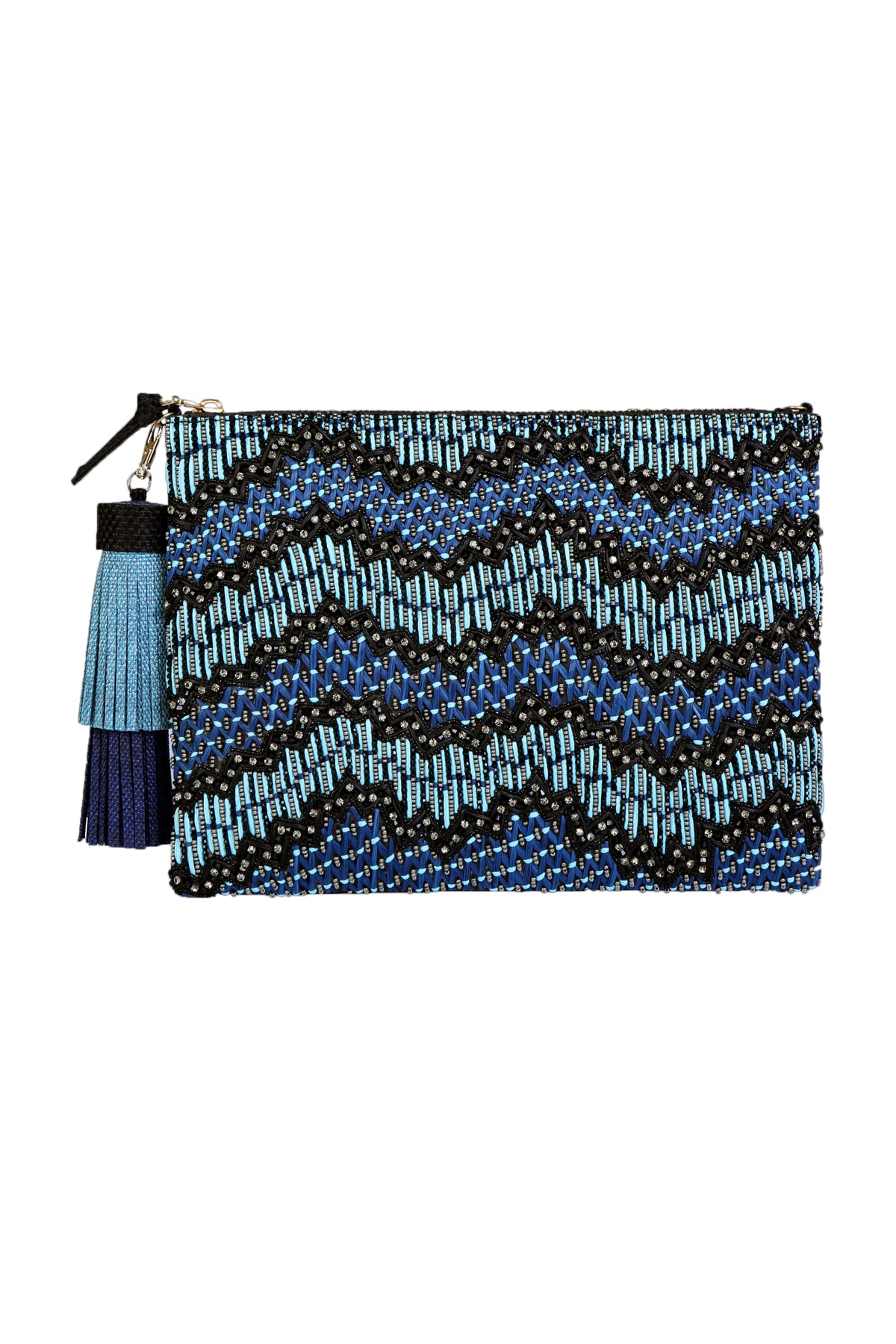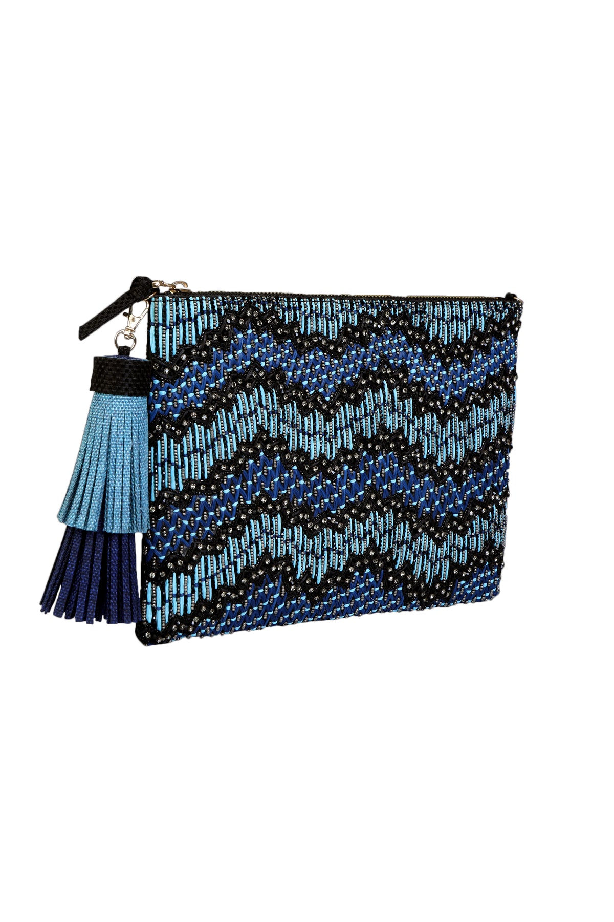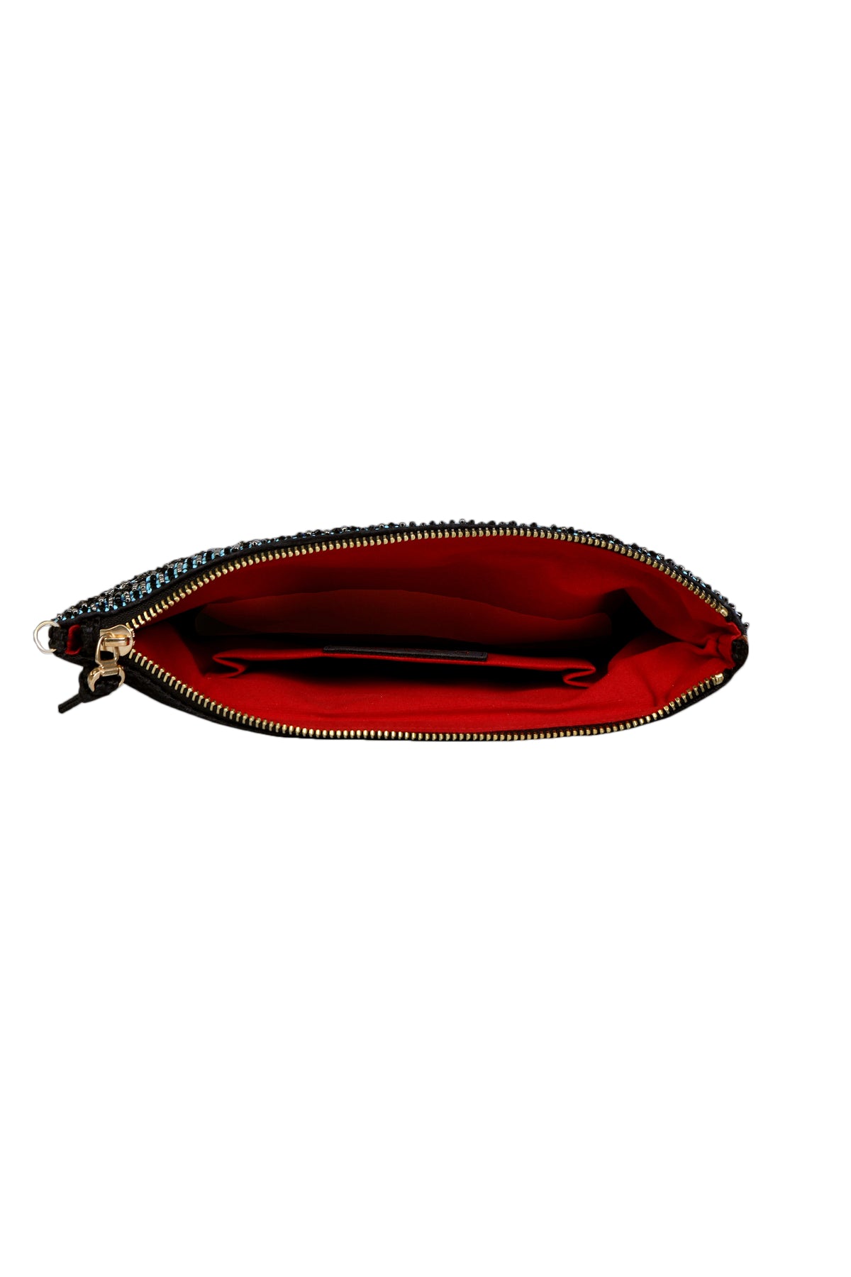 Stones: Hand embroidered eye patch at front in raffia and beads