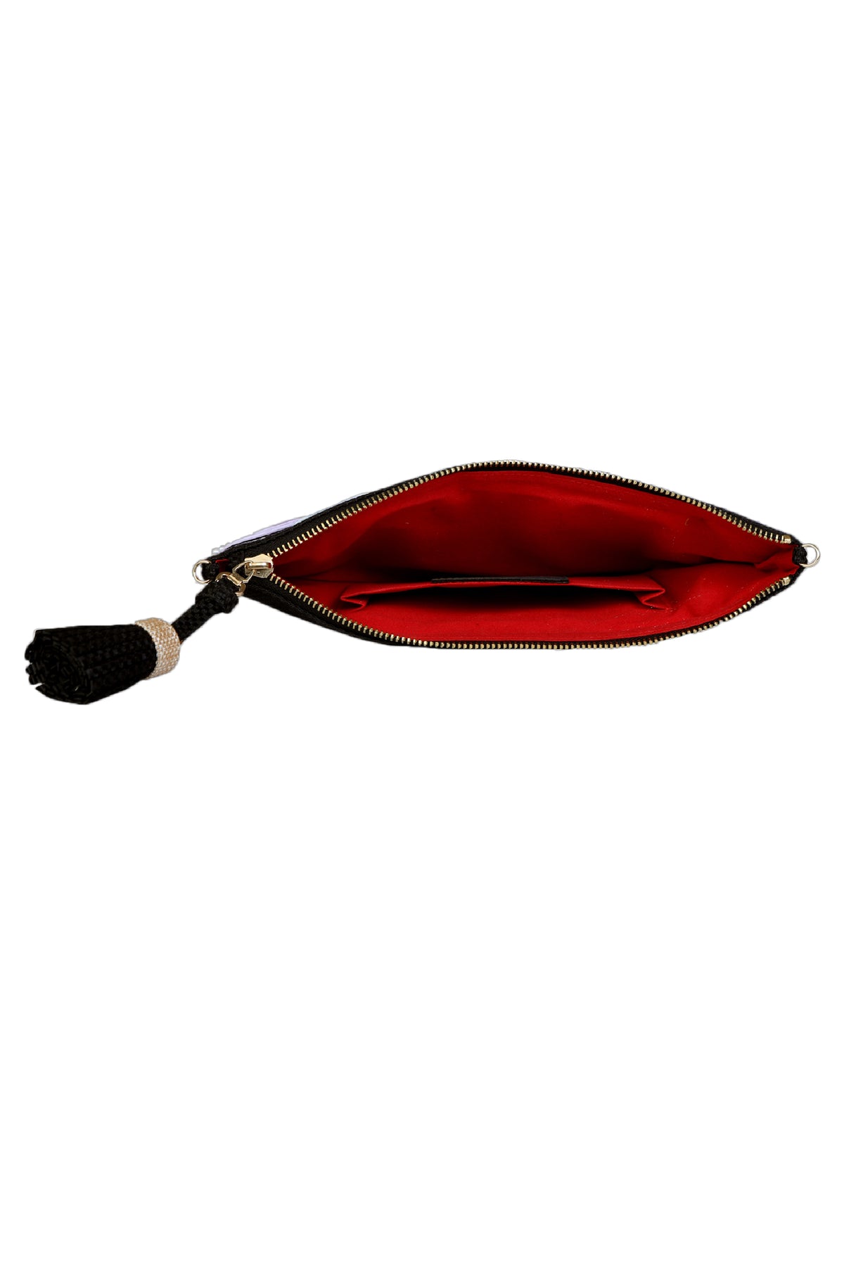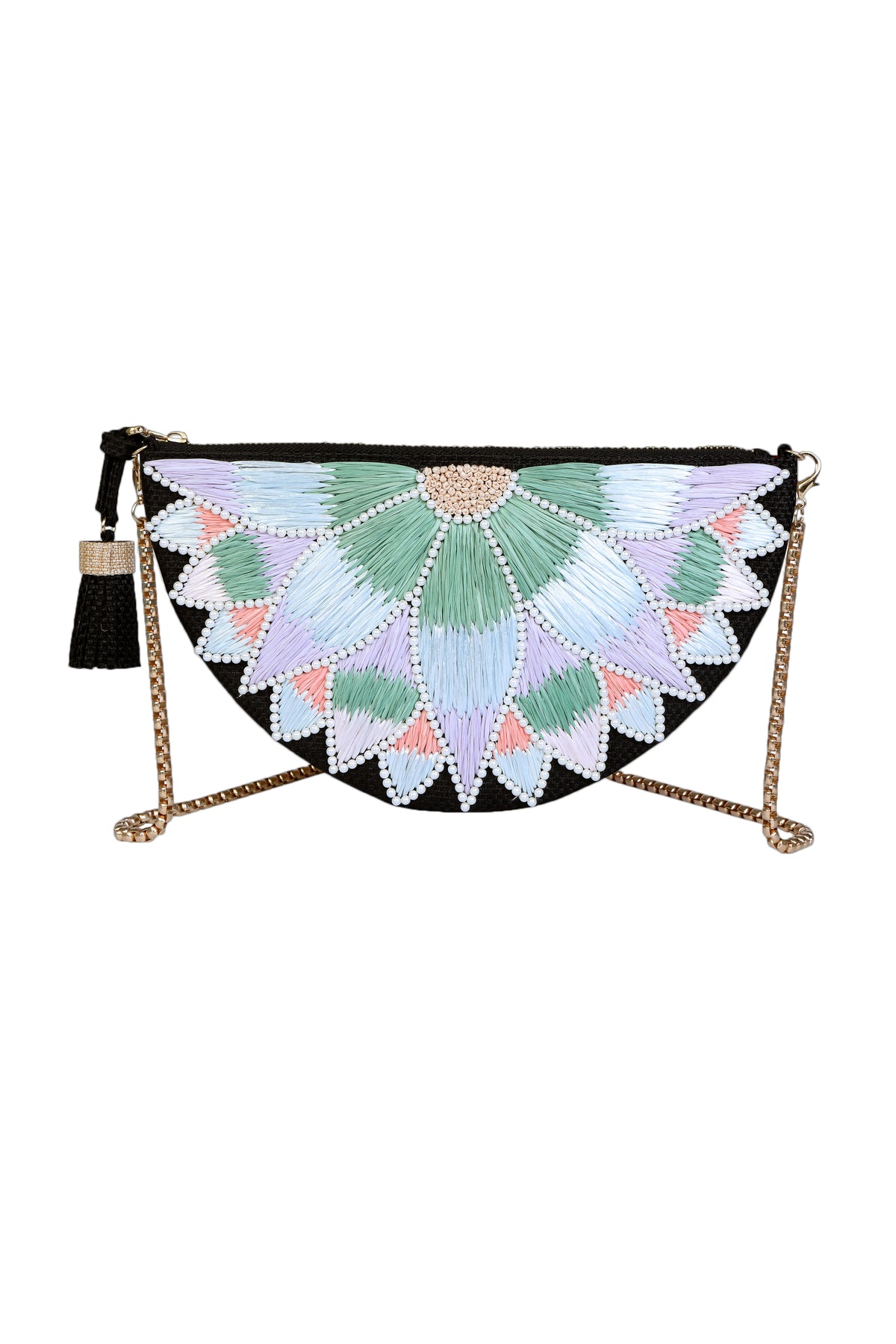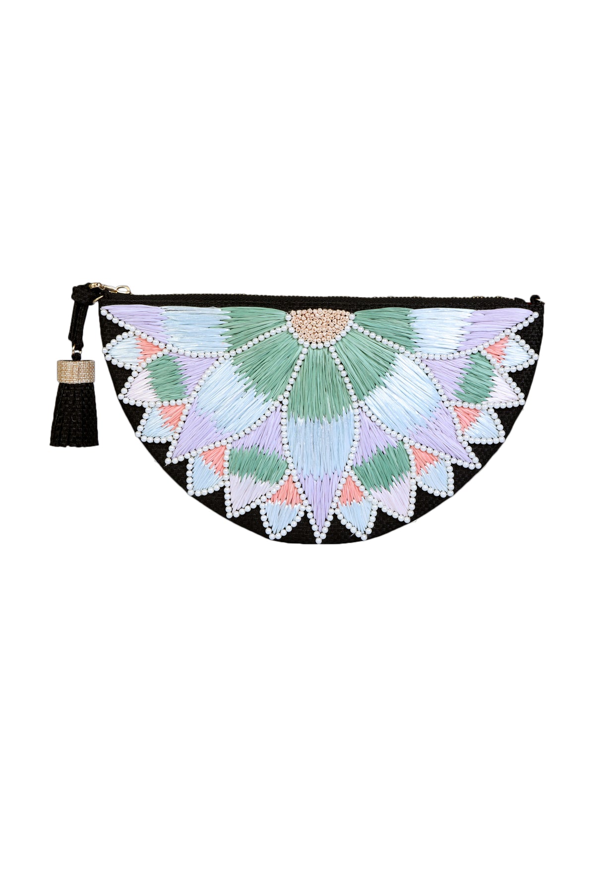Stones: Hand embroidered eye patch at front in raffia and beads
