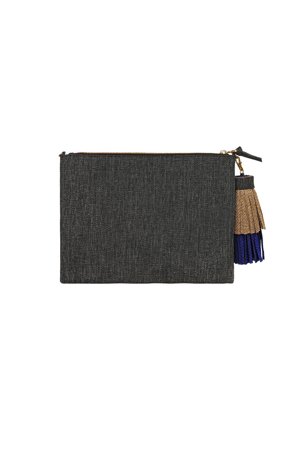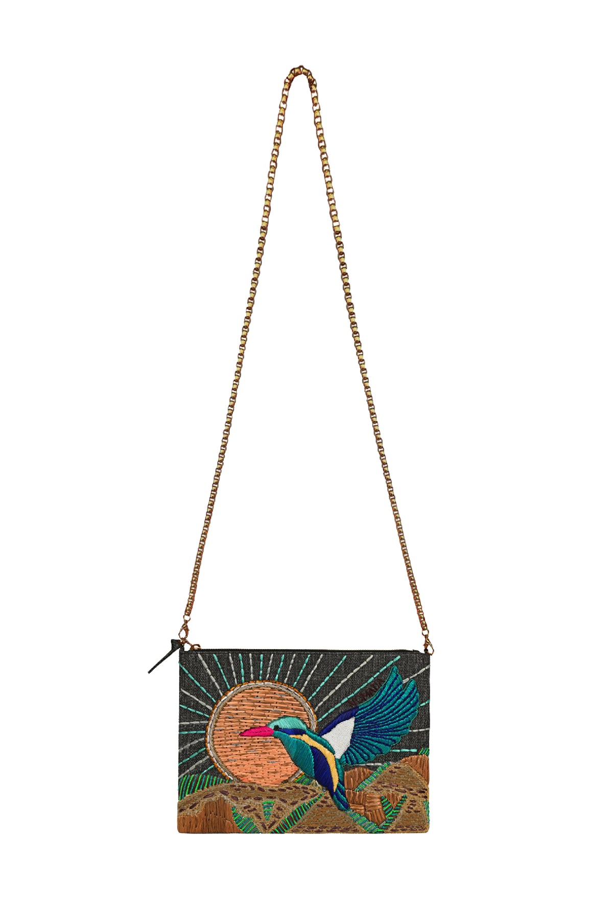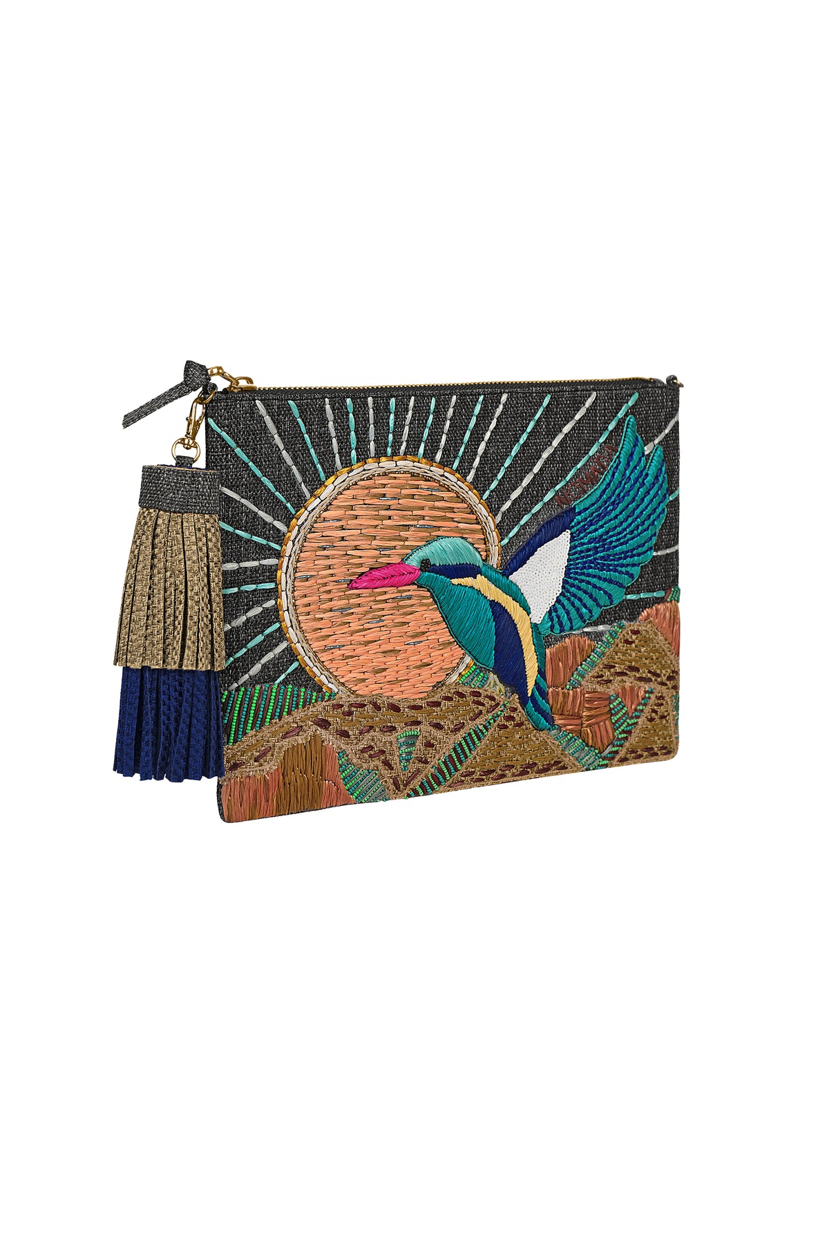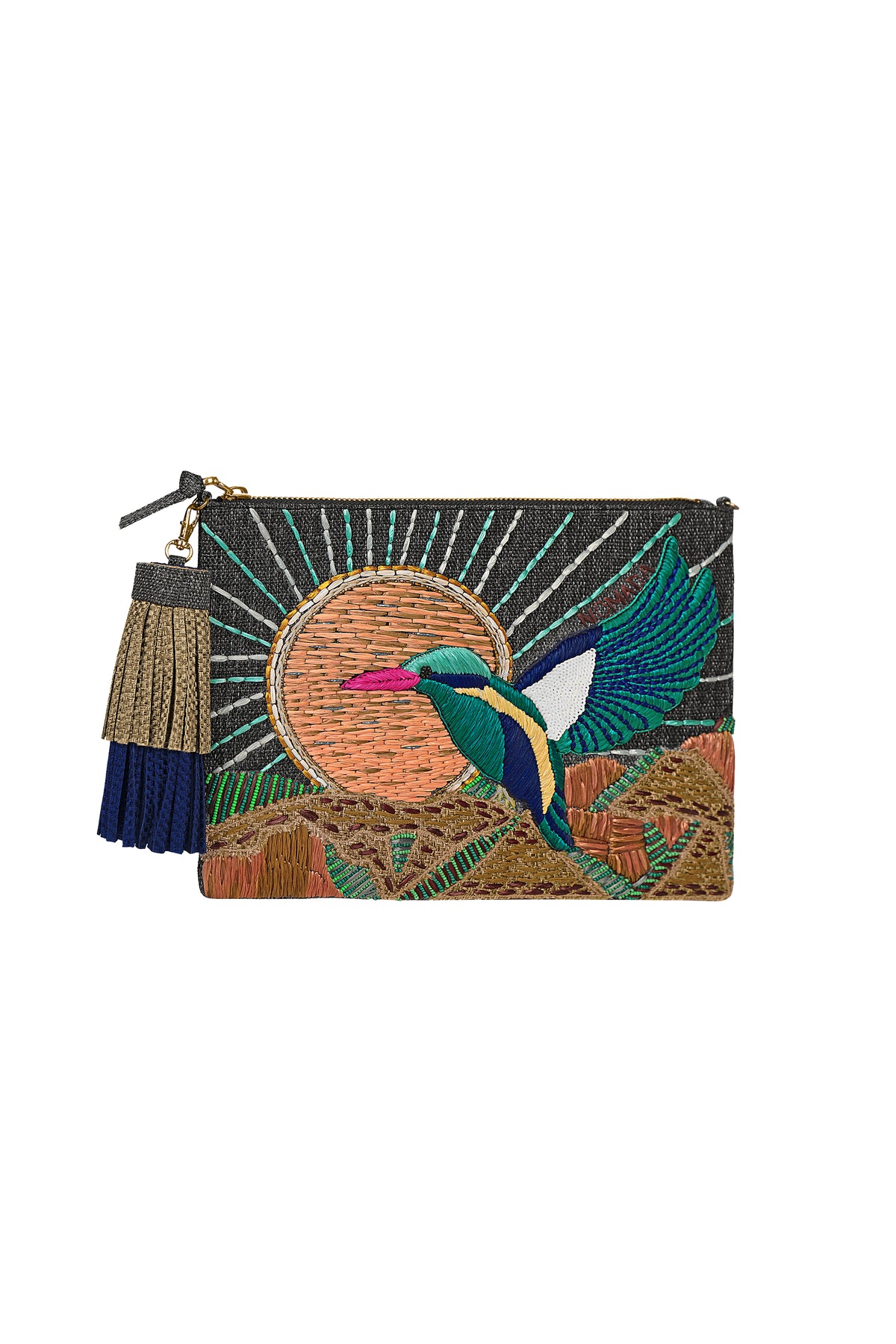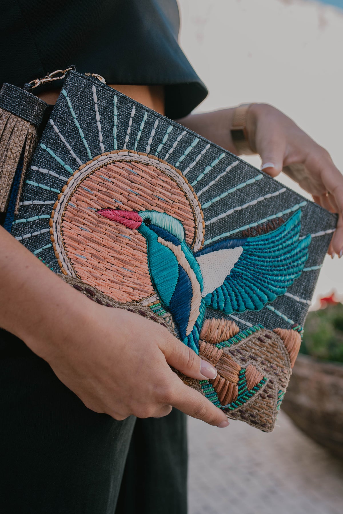 Stones: Hand embroidered eye patch at front in raffia and beads