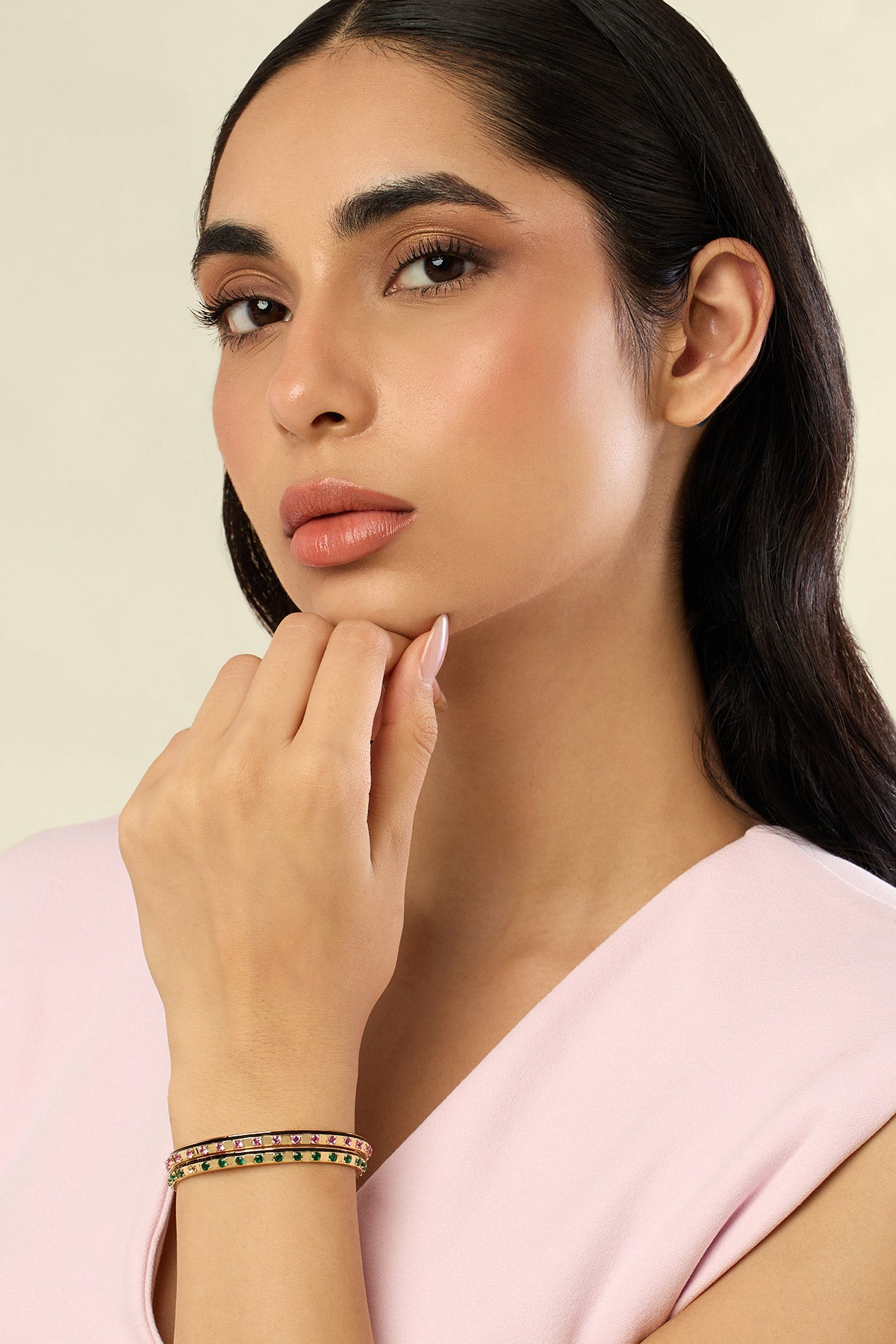 Vibrance with an edge. The karma clash cuff fuses black enamel with pink and green crystal zirconia, crafted in 18k gold-plated brass. Its bold back-open silhouette makes it a standout yet wearable stunner. Hypoallergenic, luxe, and designed to turn heads.