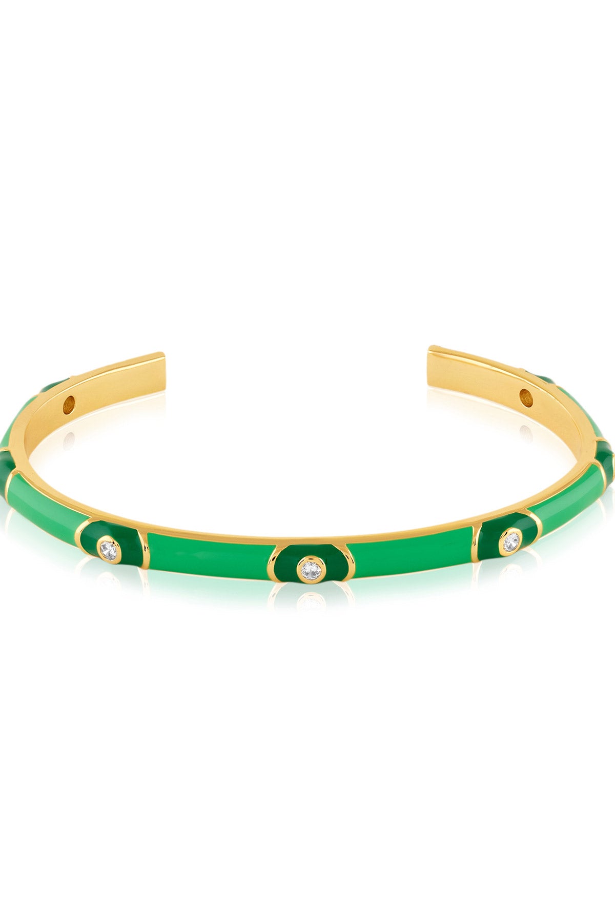 Good vibes, bold style. The verdant vision cuff is a modern talisman featuring green enamel, white crystal zirconia, and an evil eye motif, set in luxurious 18k gold-plated brass. Hypoallergenic and unapologetically striking.