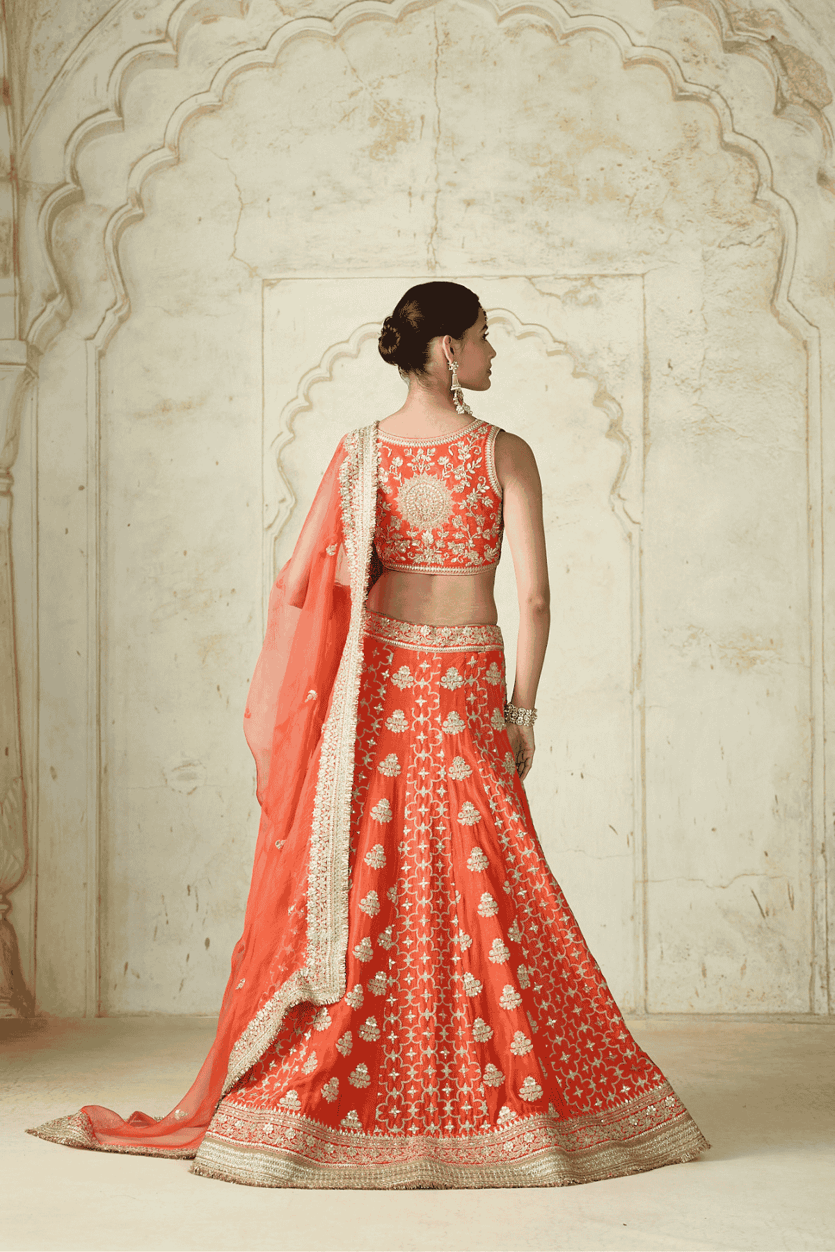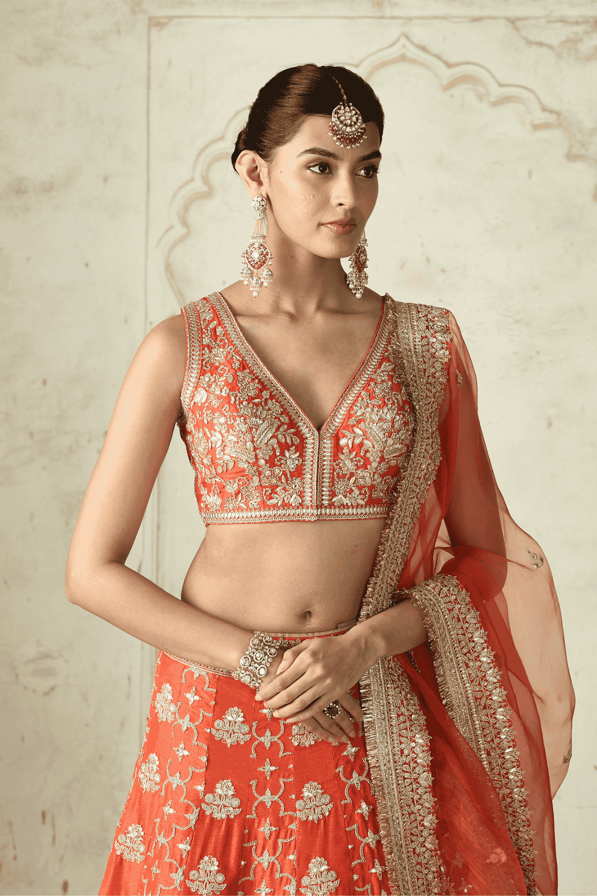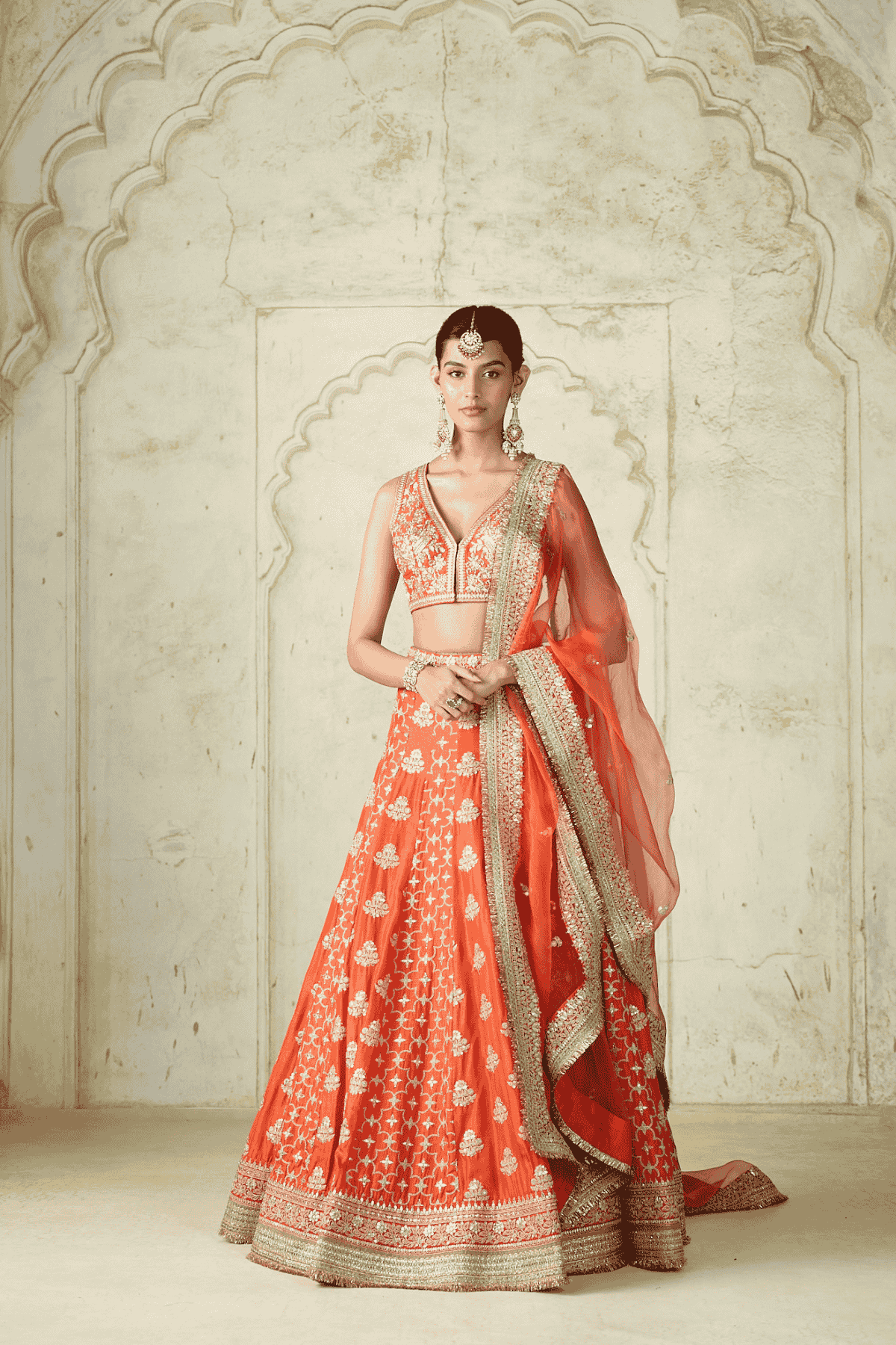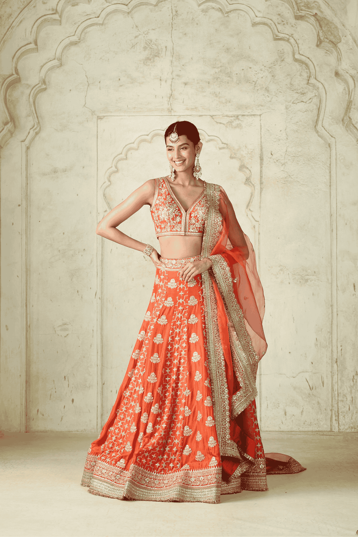 This exquisite lehenga set is a true bridal masterpiece, featuring a heavily embroidered blouse with intricate embellishments that highlight its plunging neckline. The voluminous lehenga is richly adorned with ornate motifs and a detailed embroidered hemline, exuding grandeur and elegance. A sheer matching dupatta with scattered motifs and an intricately bordered edge drapes gracefully.
