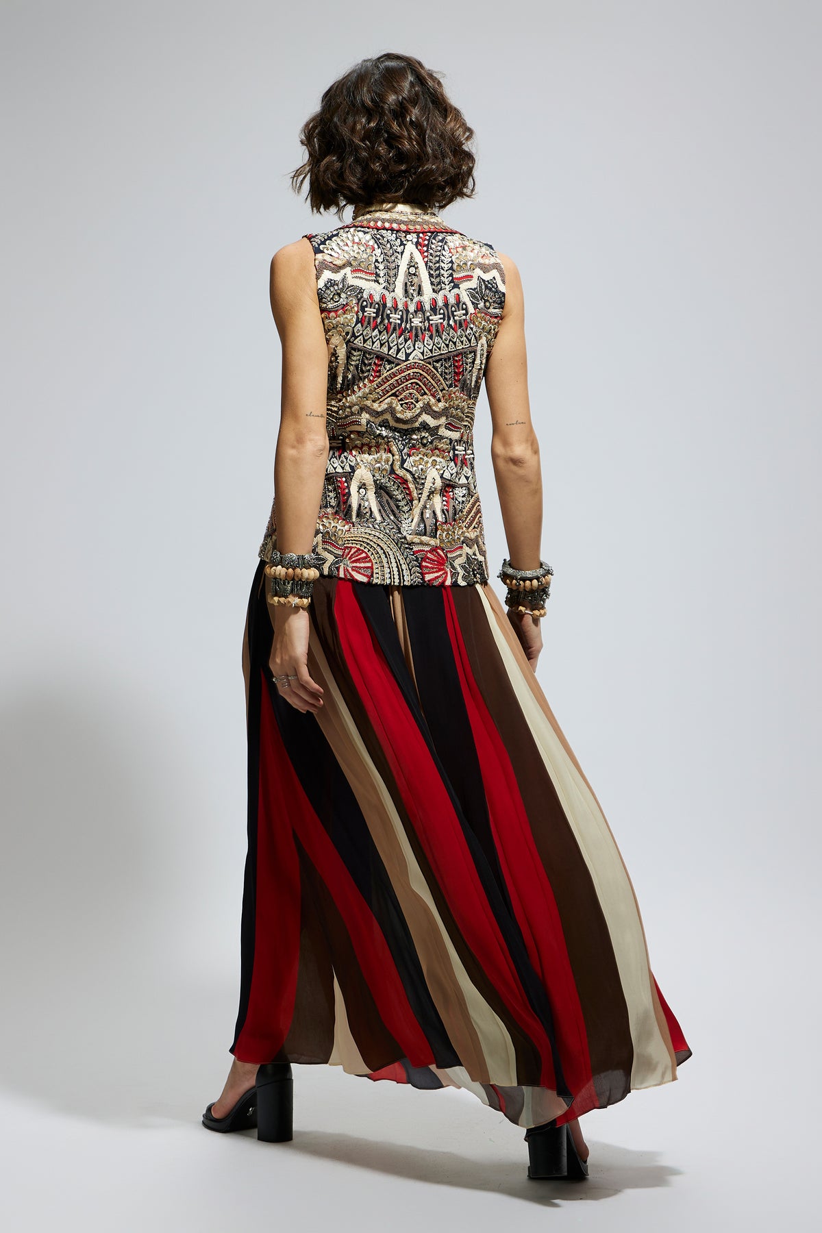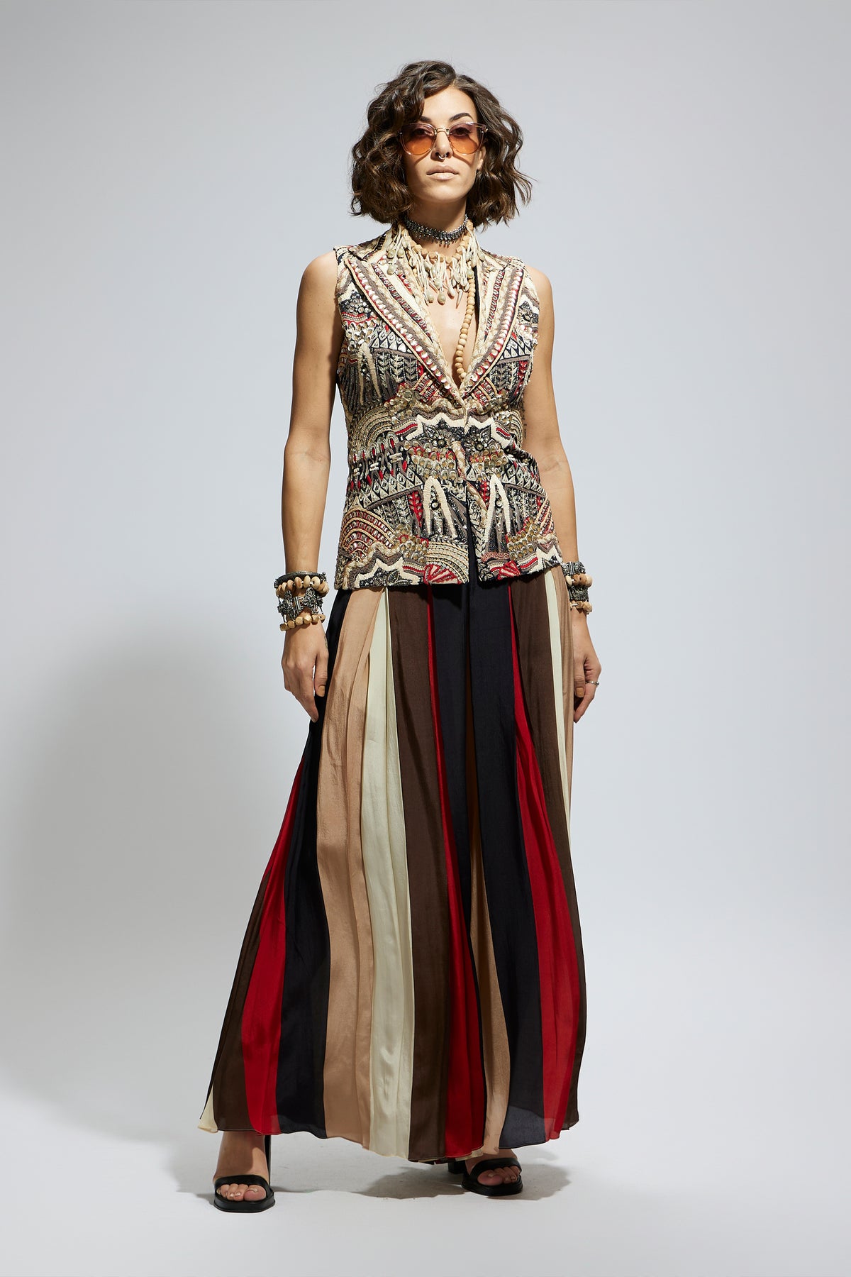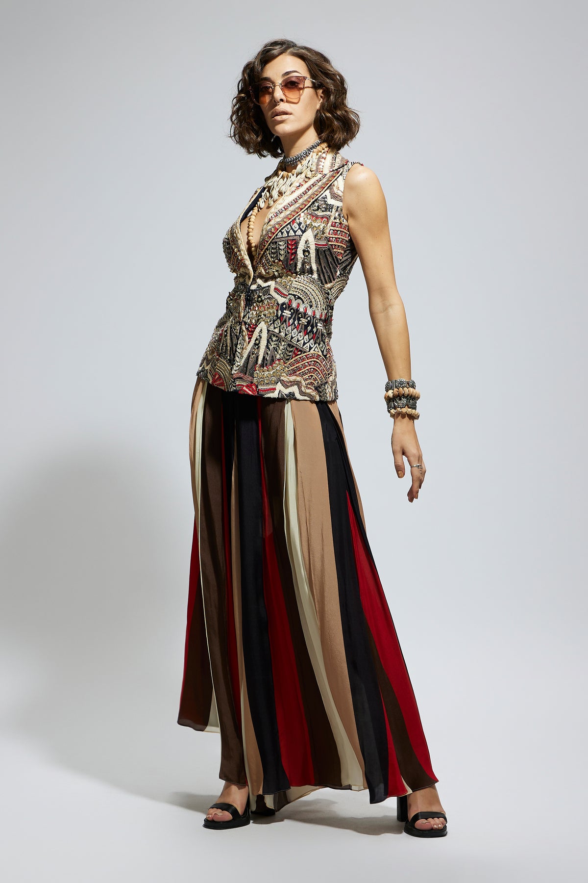 Blue abstract embellished jacket paired with samsara stripe flared pants